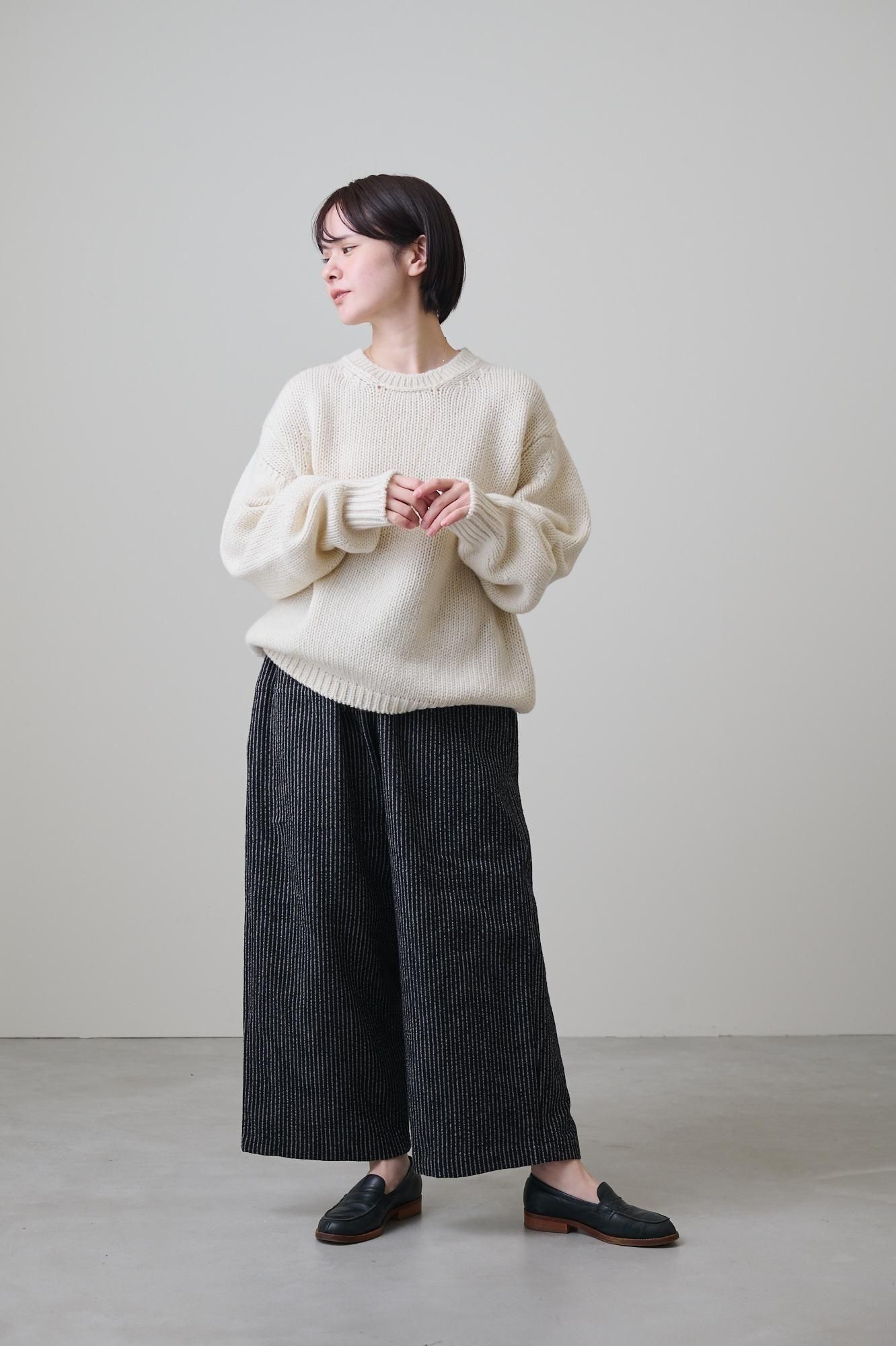 マニッシュな雰囲気のピンストライプ柄が、ゆったりパンツを洗練された印象にしています。