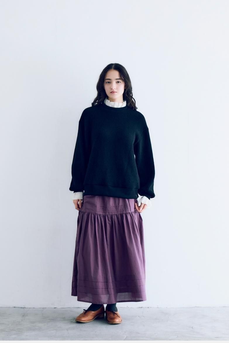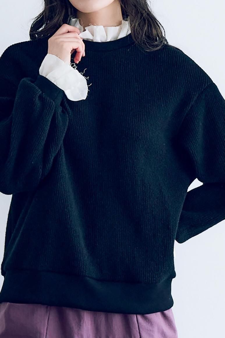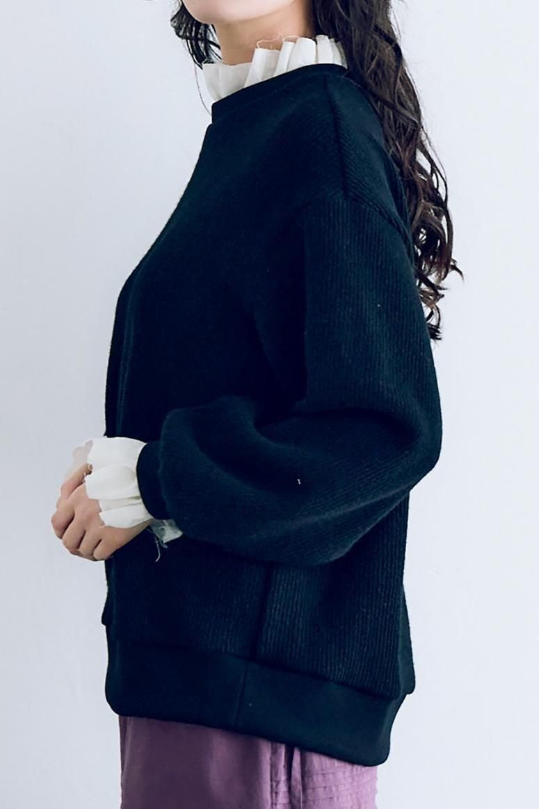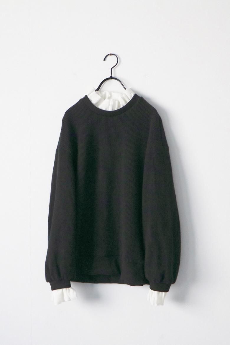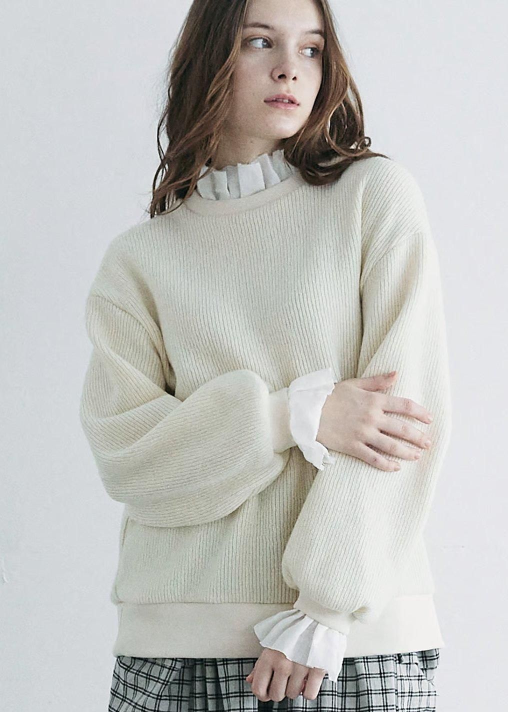 首元と袖口にリネン地のフリルを付けたニットプルオーバーです。