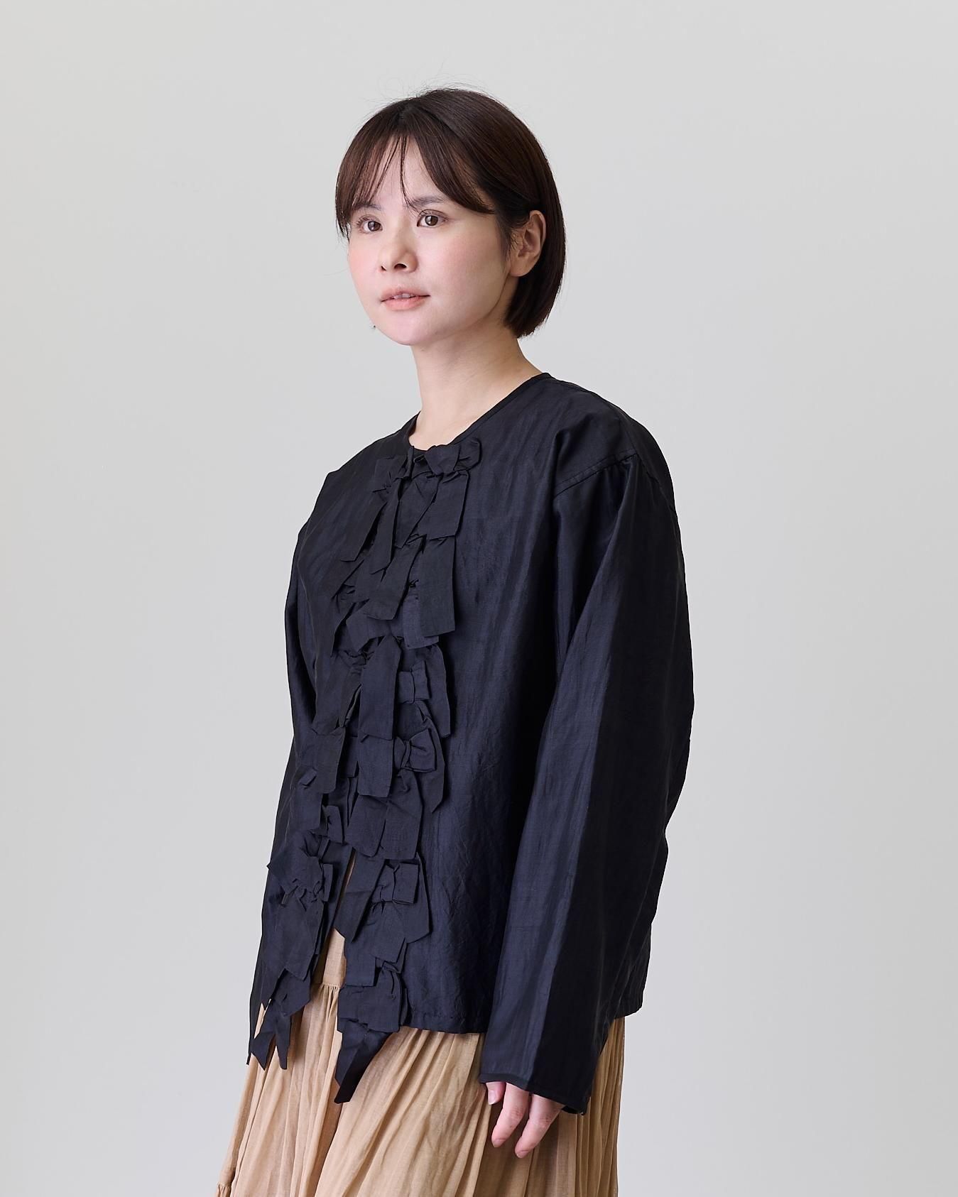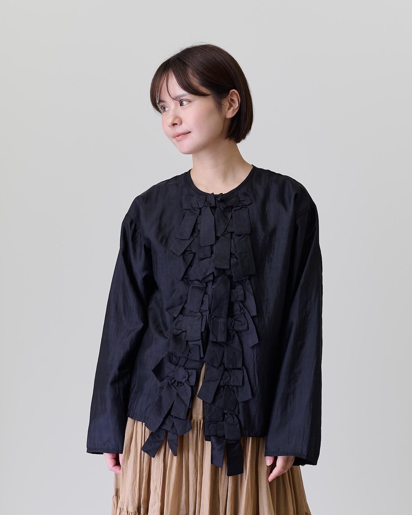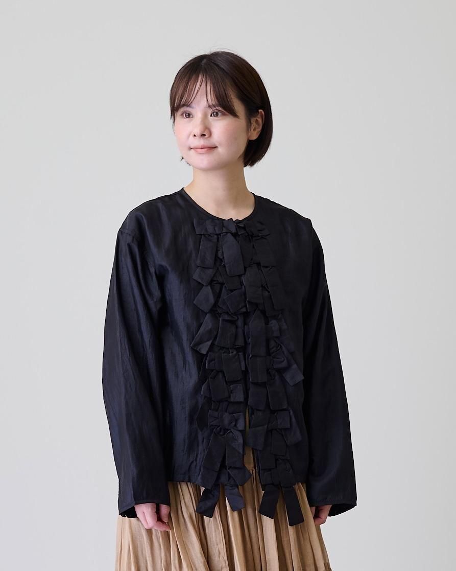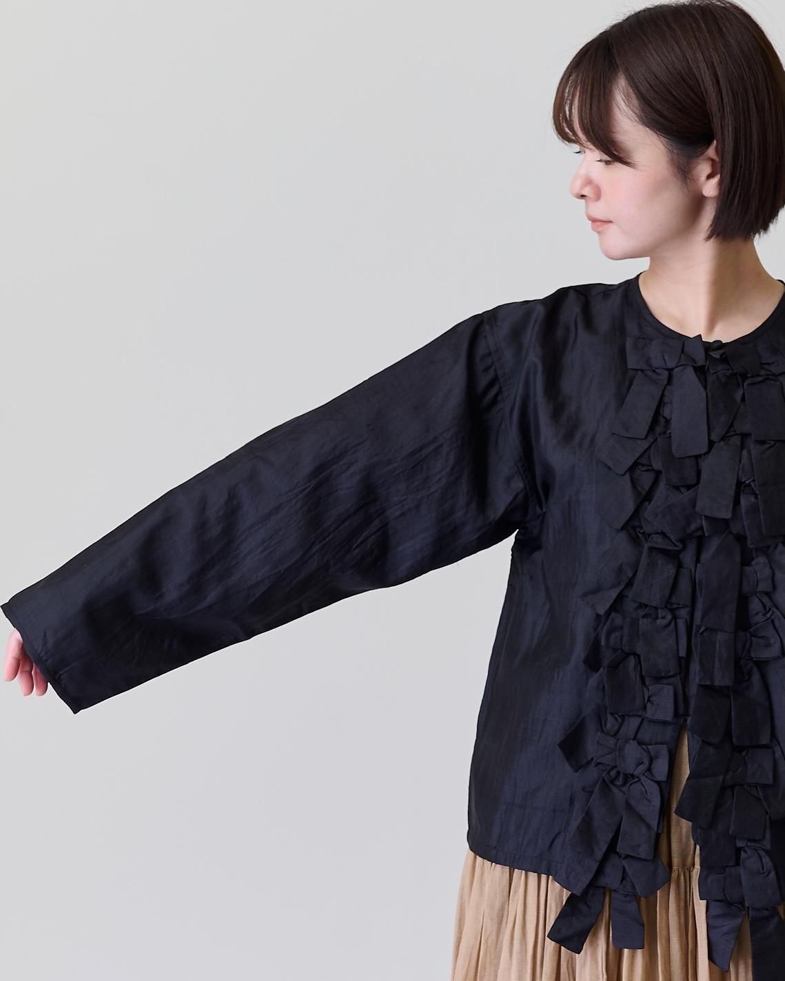 前身頃に配したリボンがポイントで、コートやジャケットの下に合わせ、リボンを見せるコーデも素敵です。