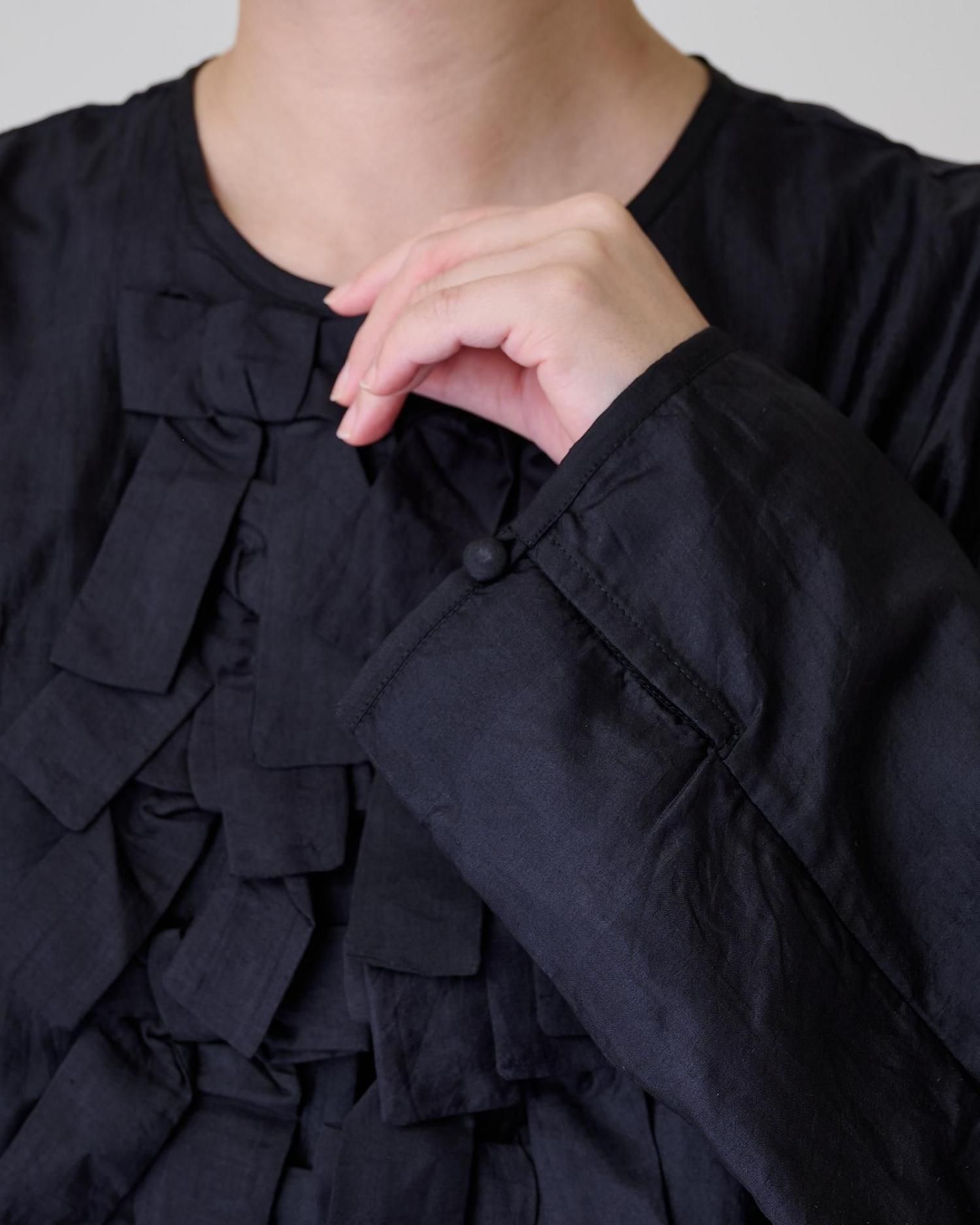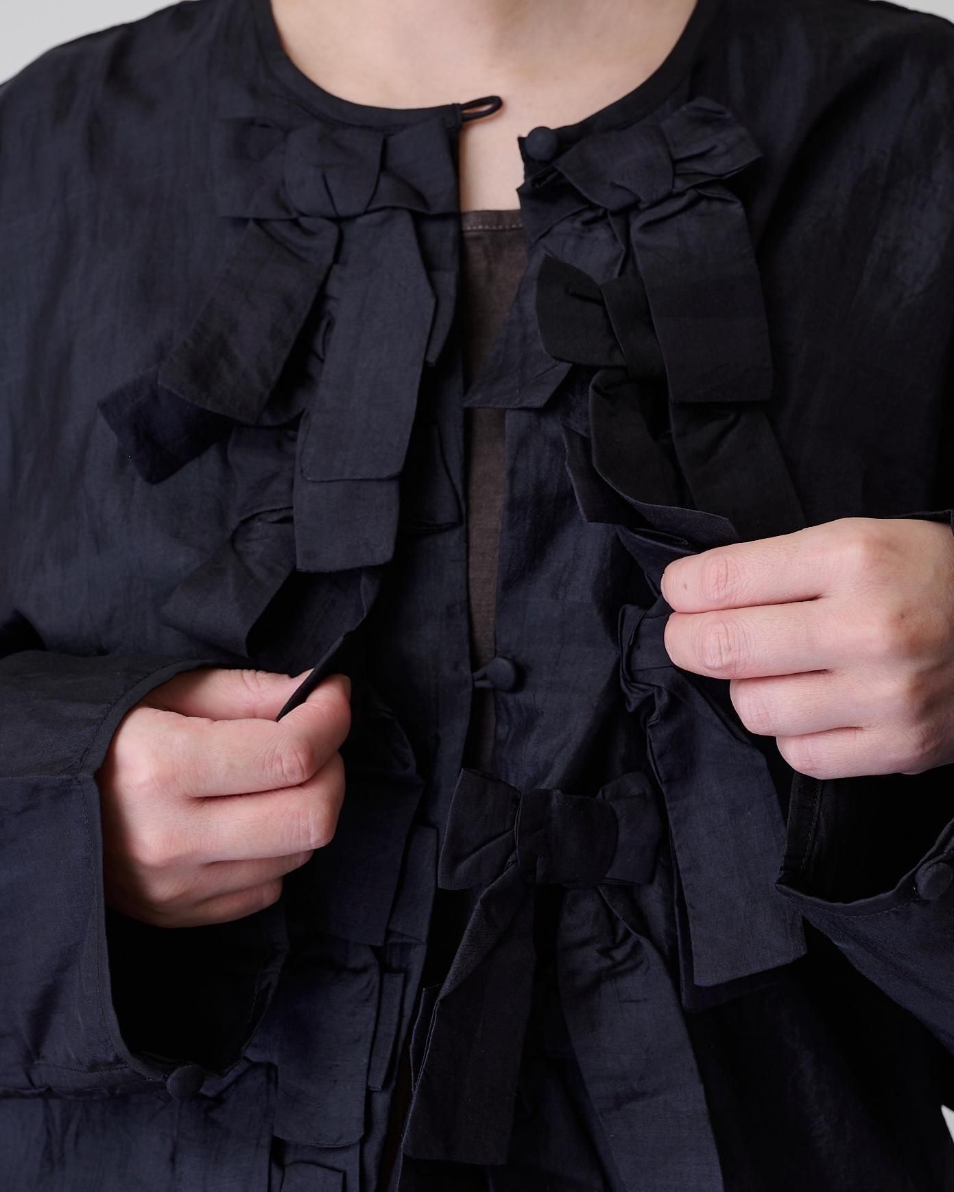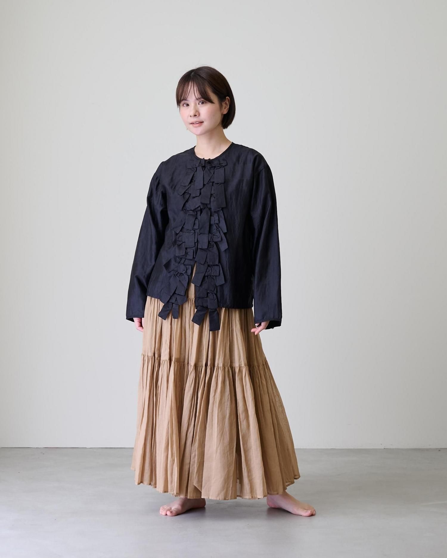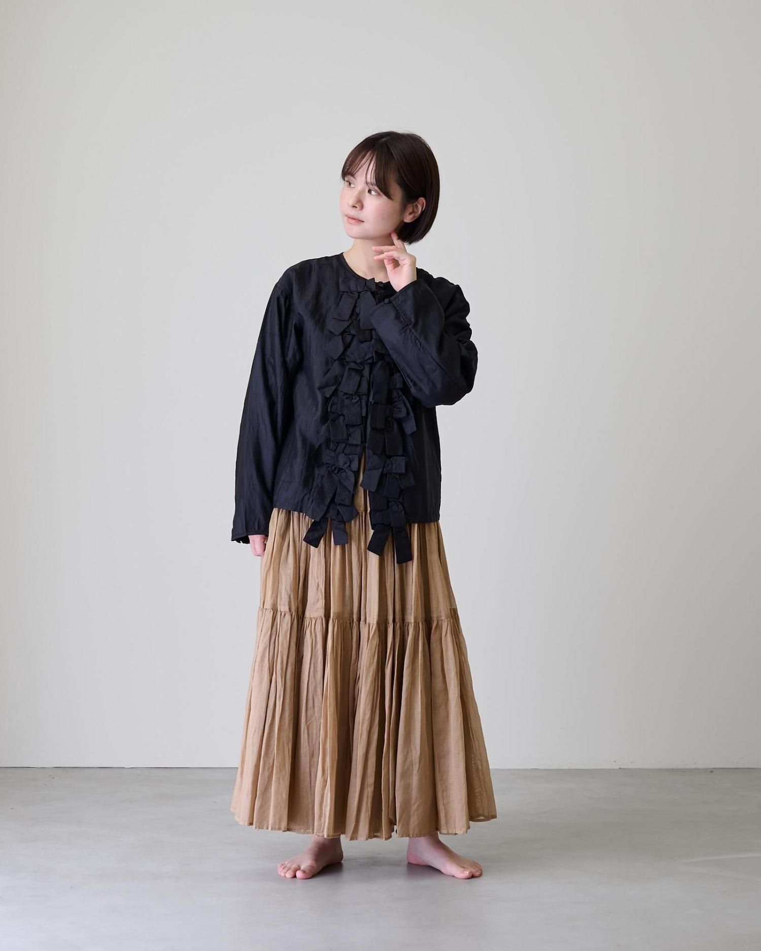 前身頃に配したリボンがポイントで、コートやジャケットの下に合わせ、リボンを見せるコーデも素敵です。