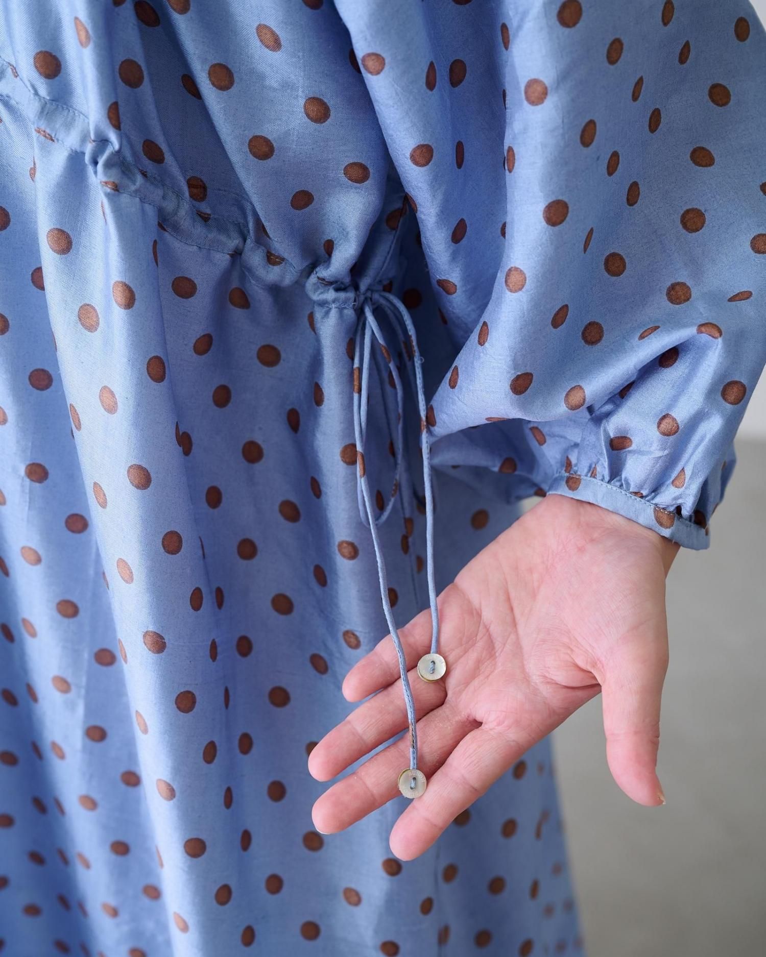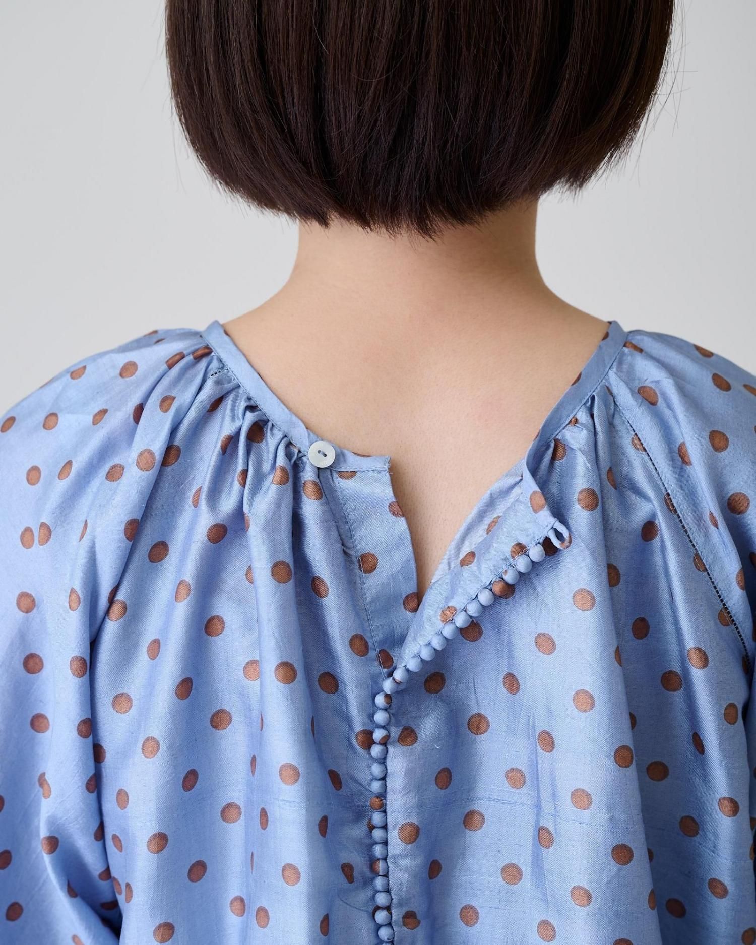 襟元と袖口には繊細なギャザーを入れて美しドレープと膨らみを生み出しています。