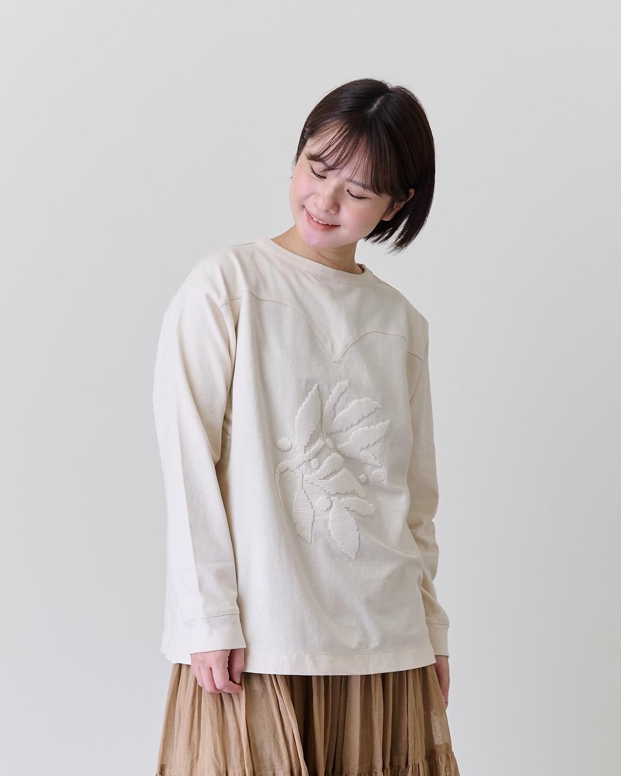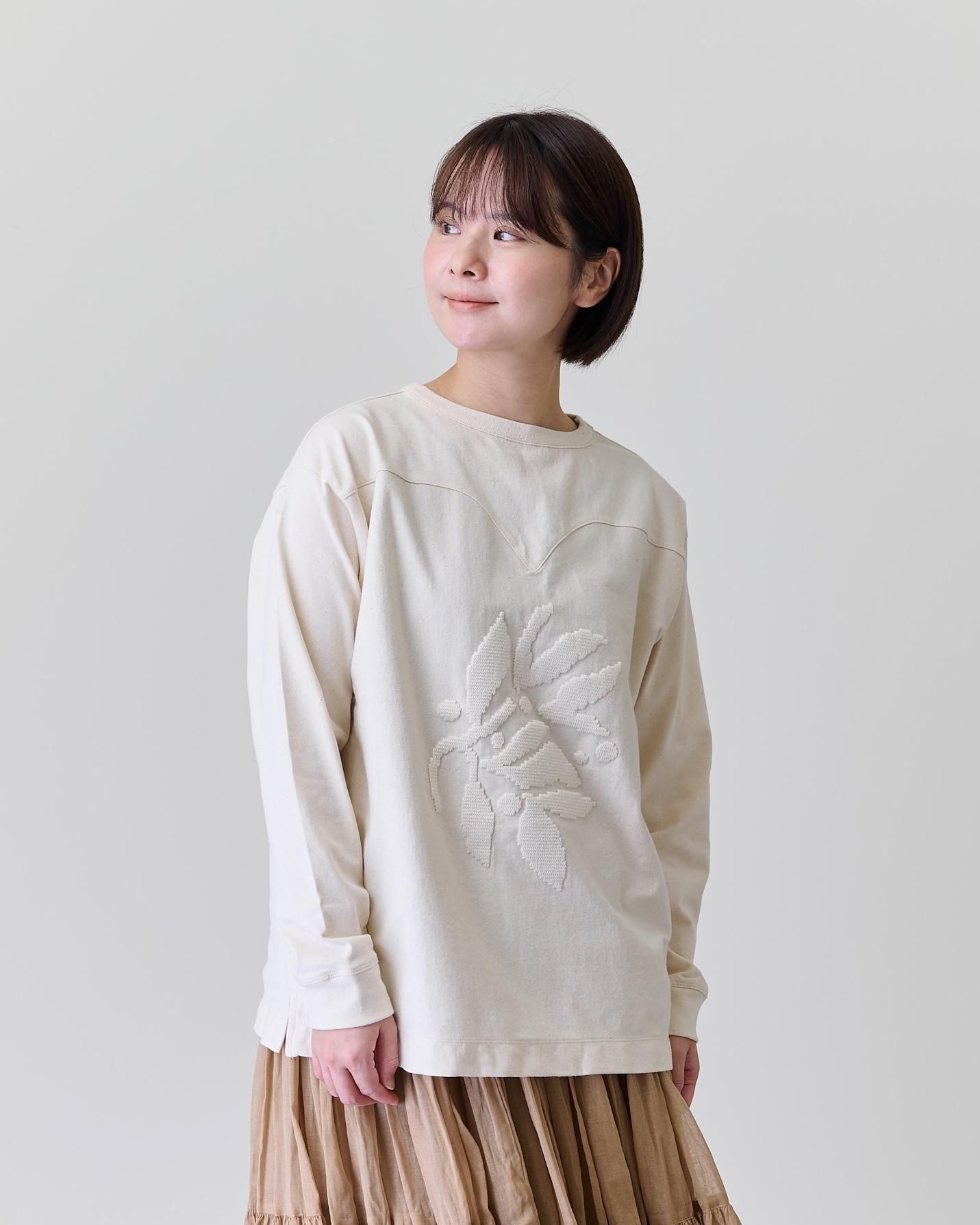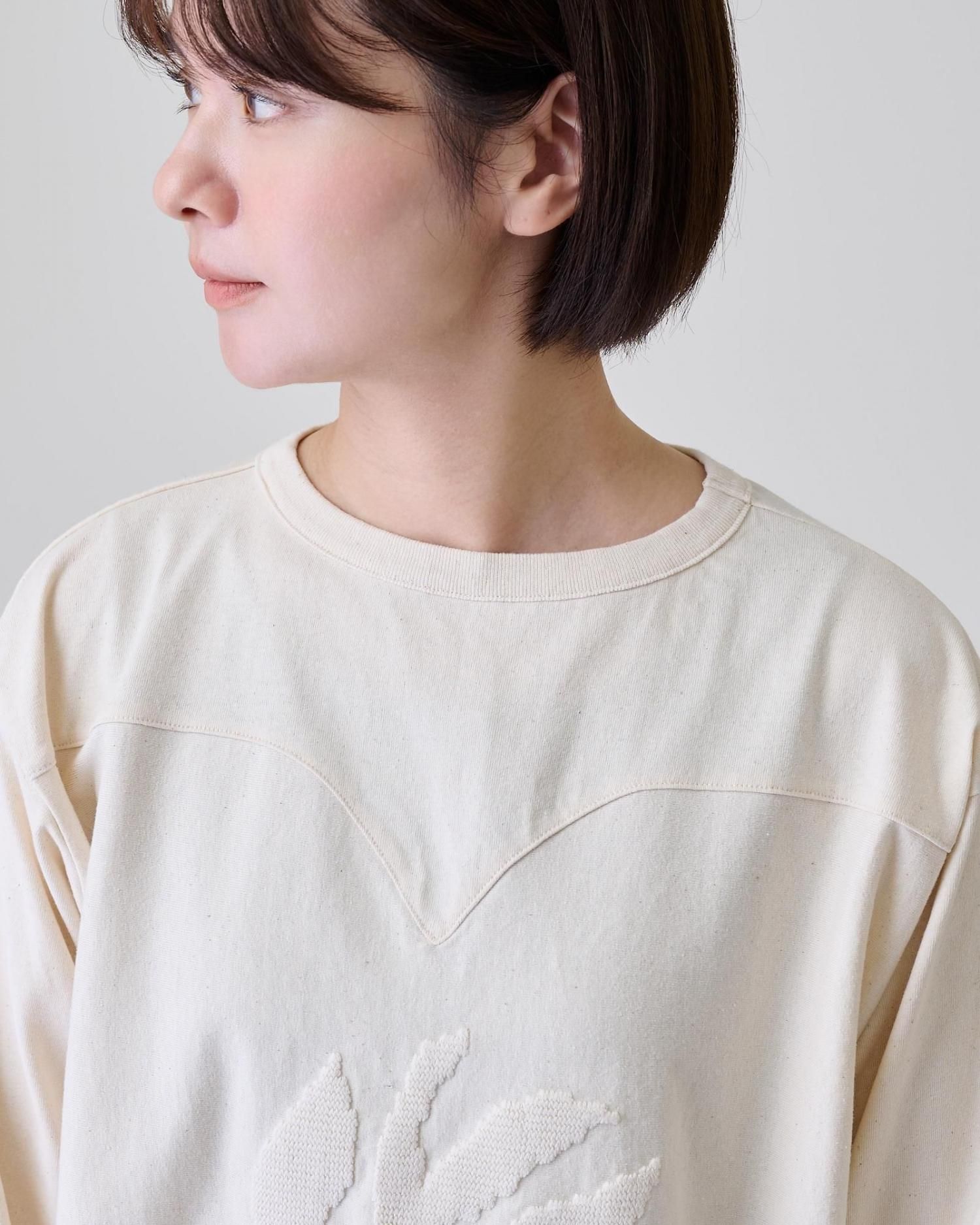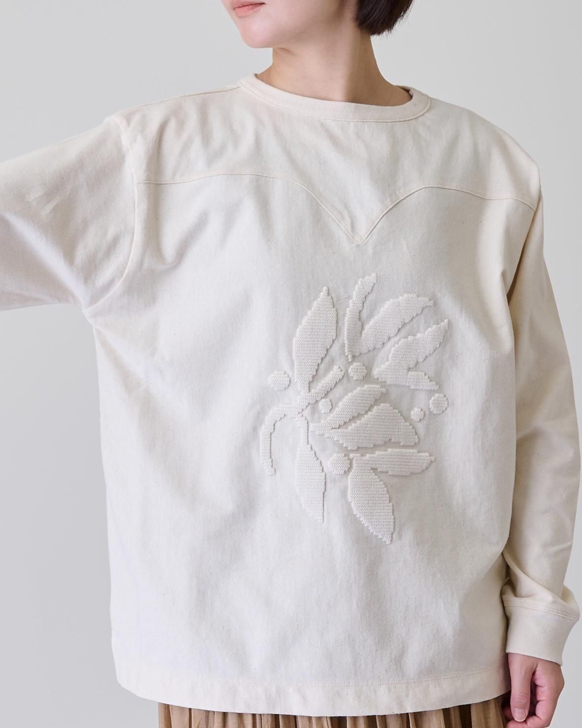 クロスステッチを浮かすことで、優しくて懐かしい風合いのある独特な立体感の刺繍に仕上げています。