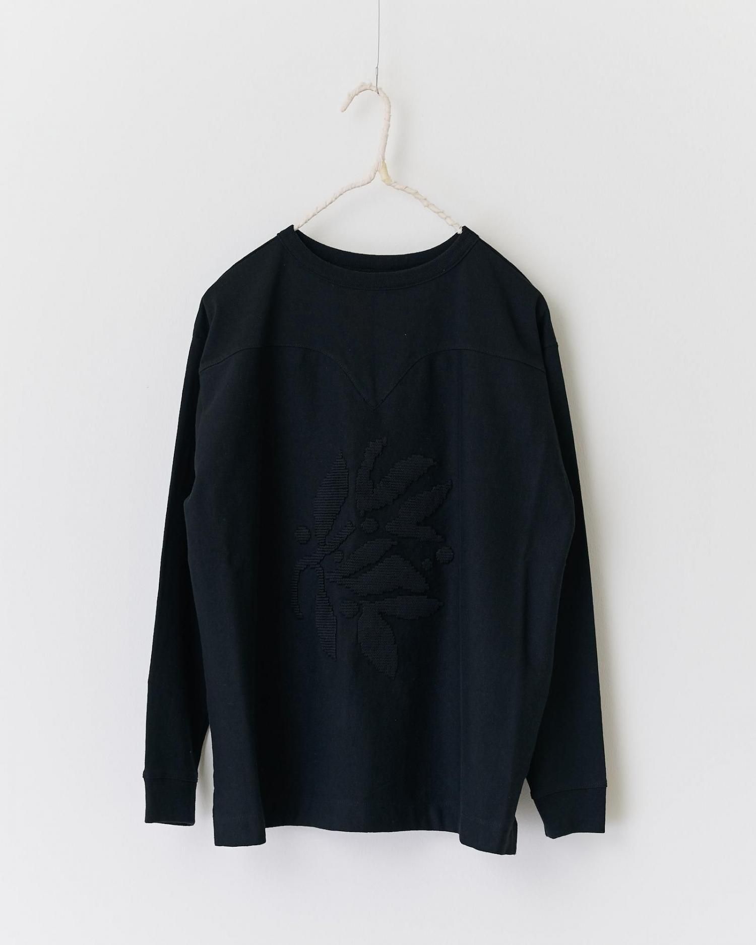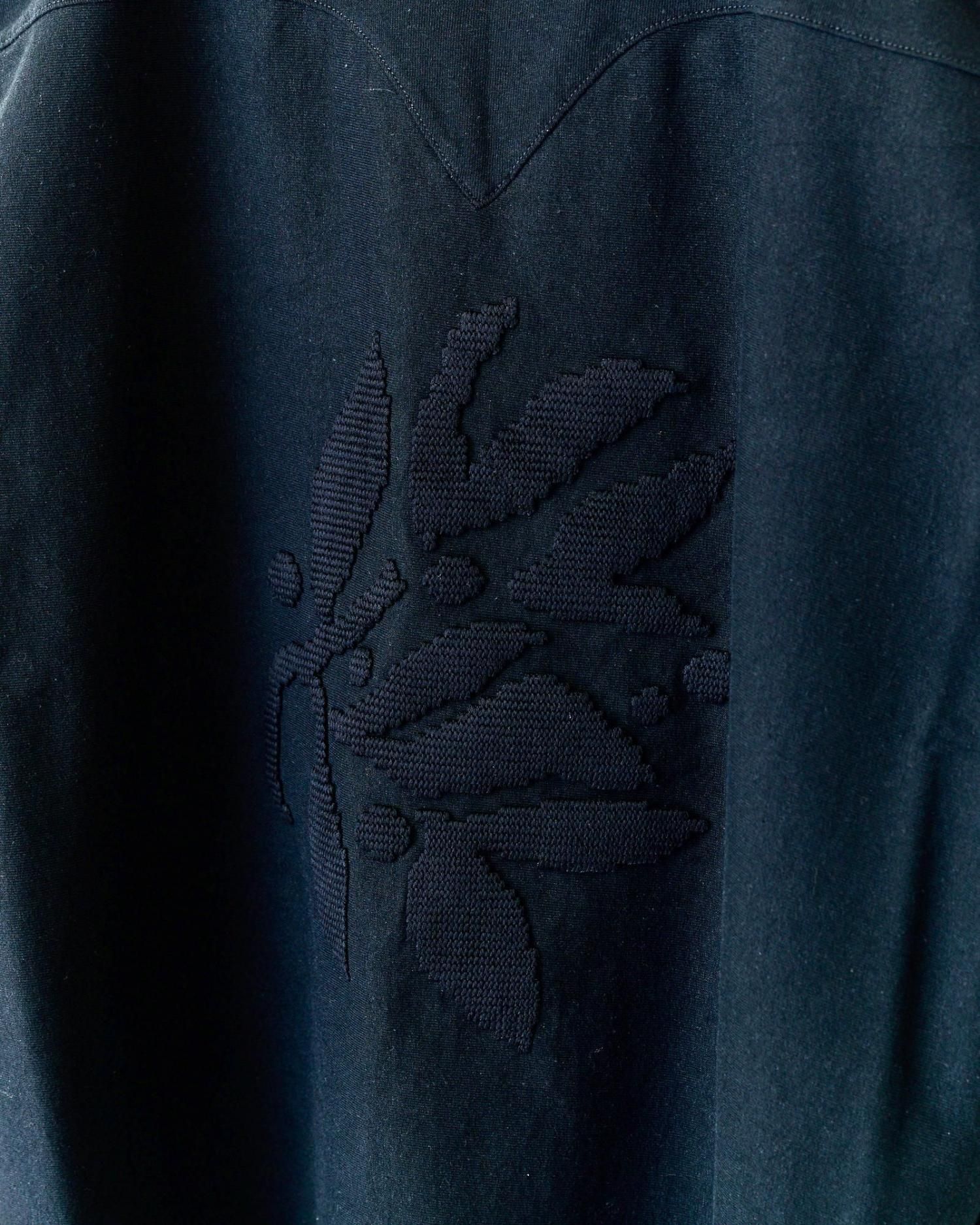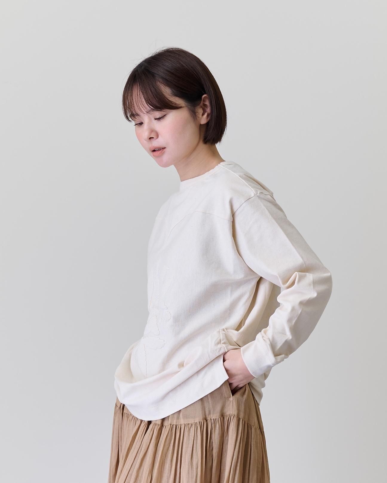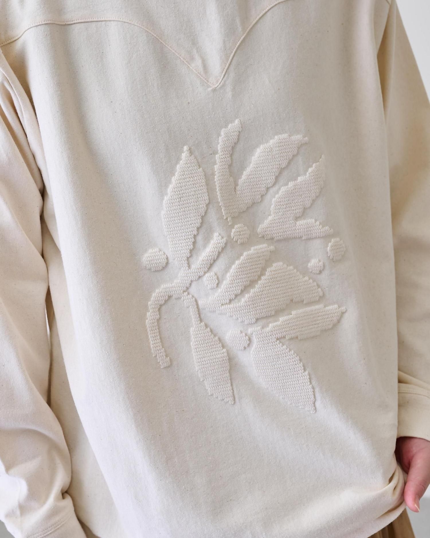 クロスステッチを浮かすことで、優しくて懐かしい風合いのある独特な立体感の刺繍に仕上げています。