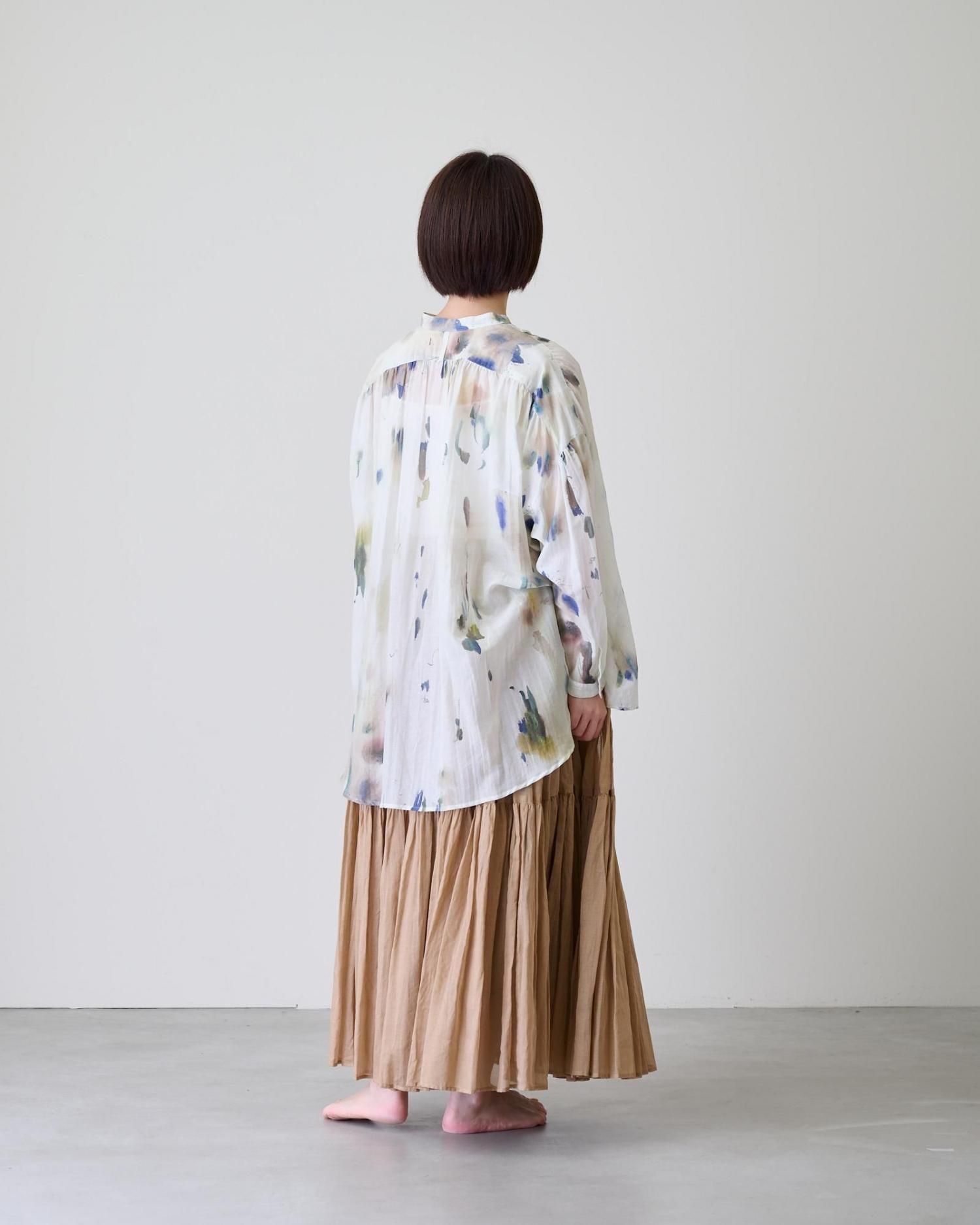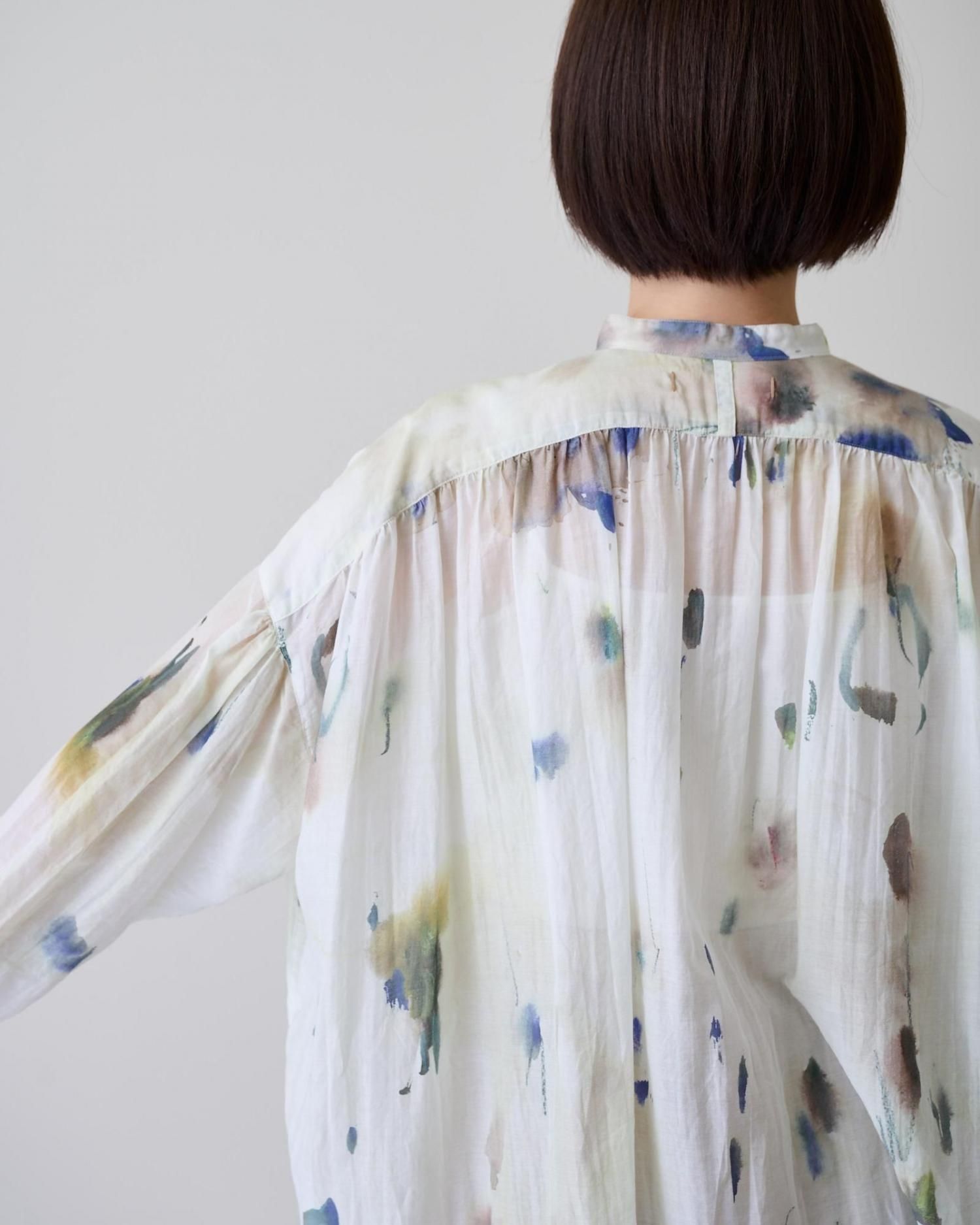 スッキリとしたデザインを損なわないよう、後ろのヨーク切り替え部分にギャザーを入れることでエレガントなボリューム感を生み出しています。