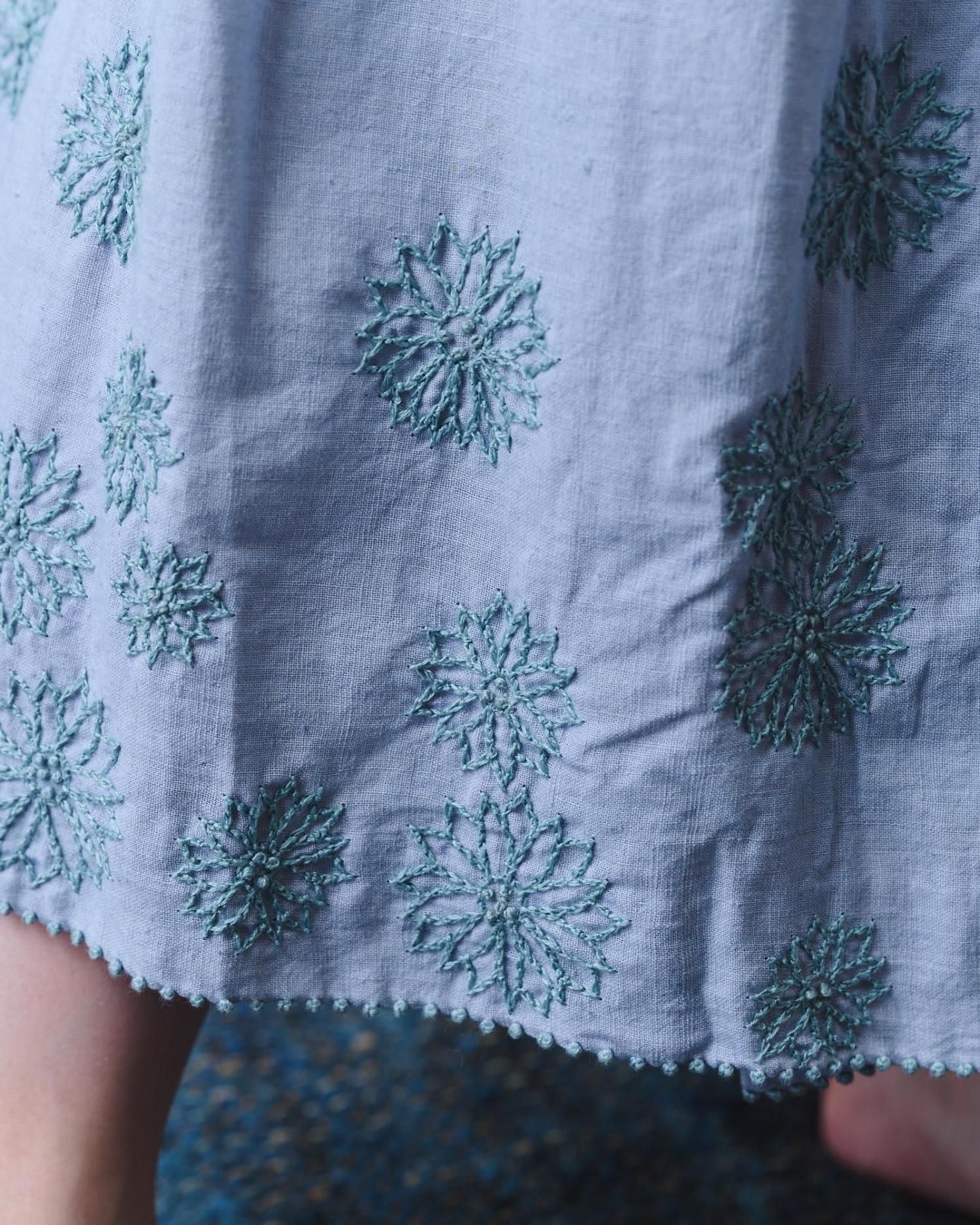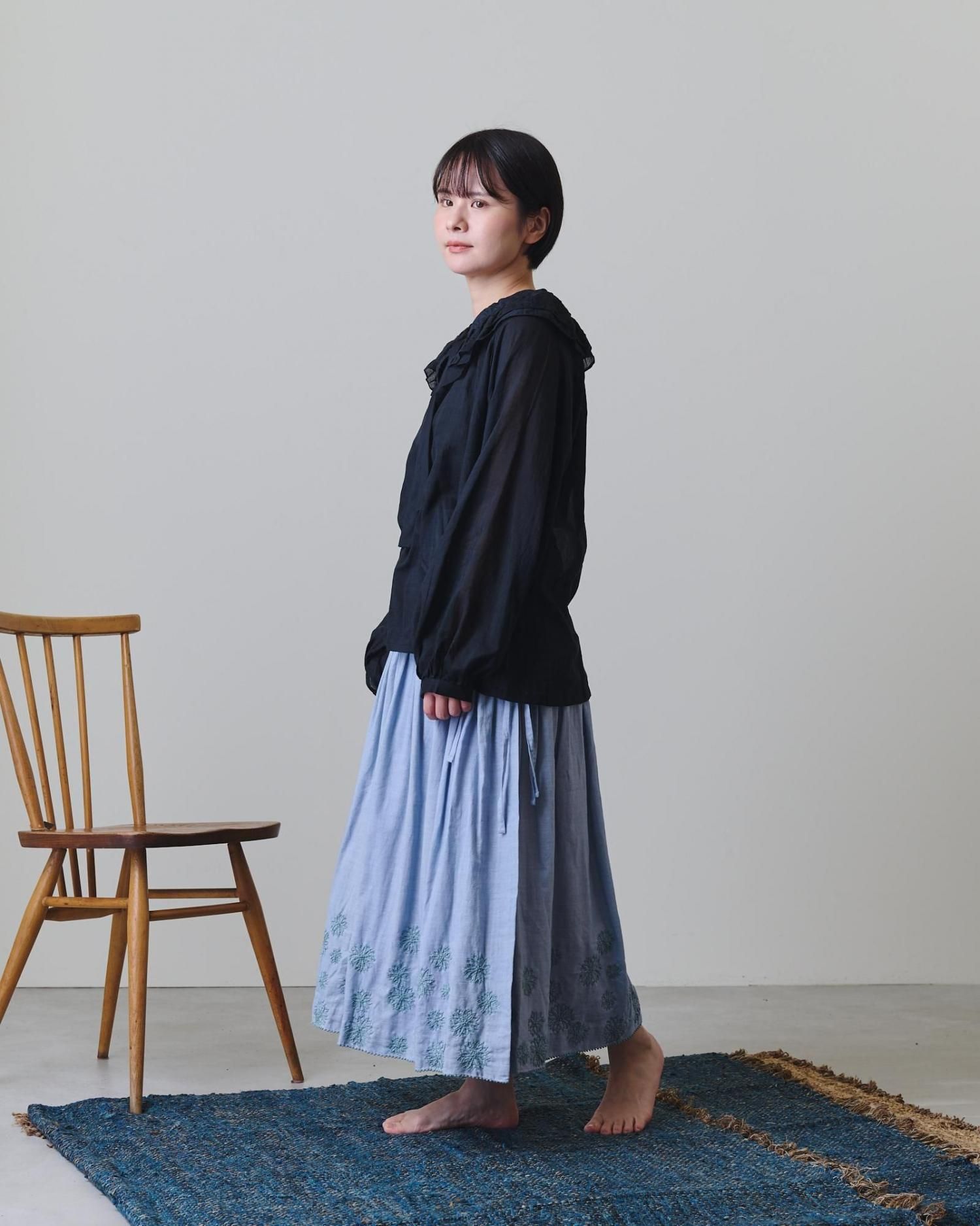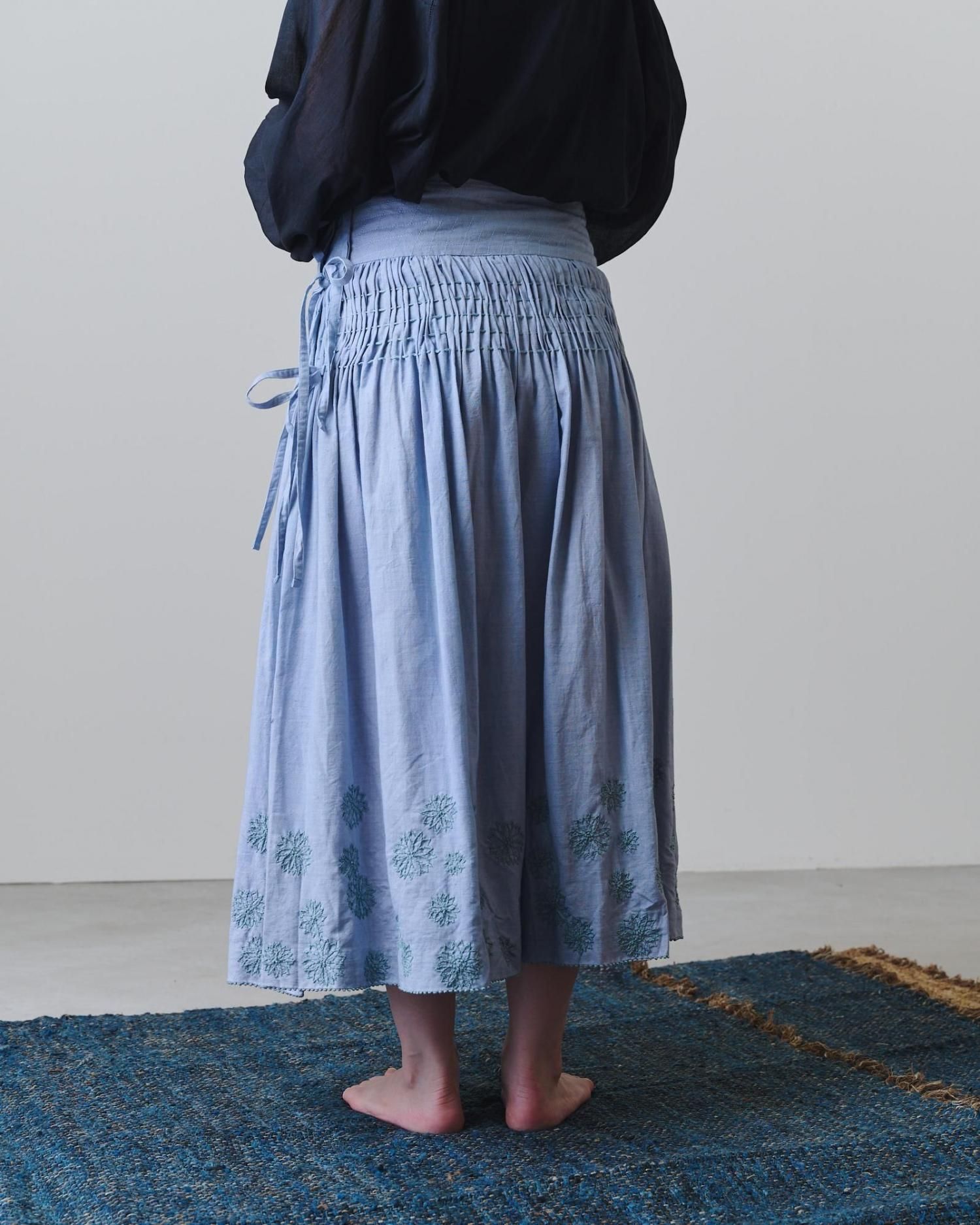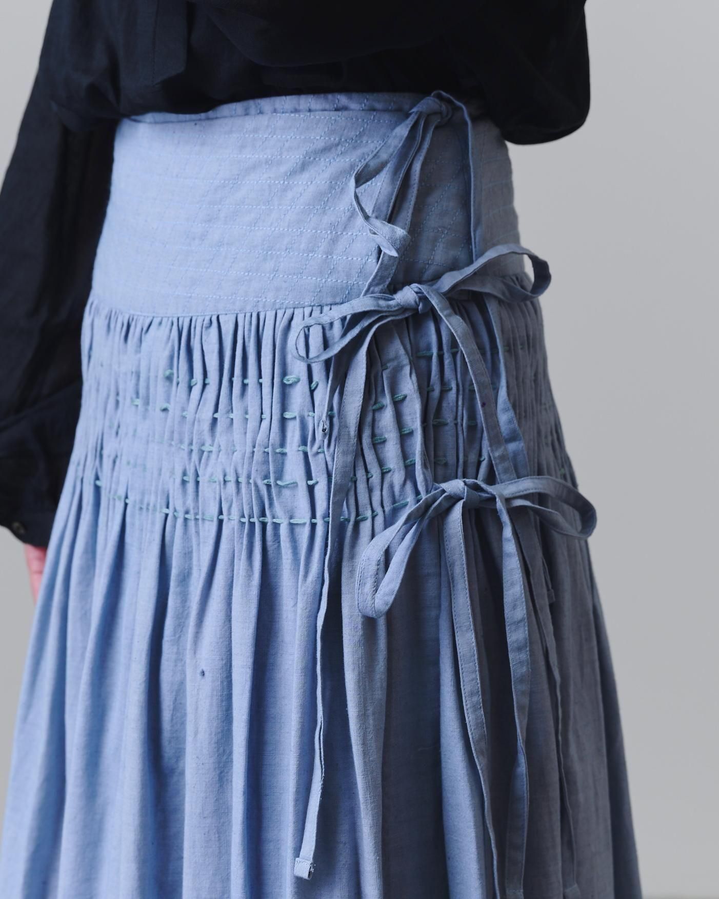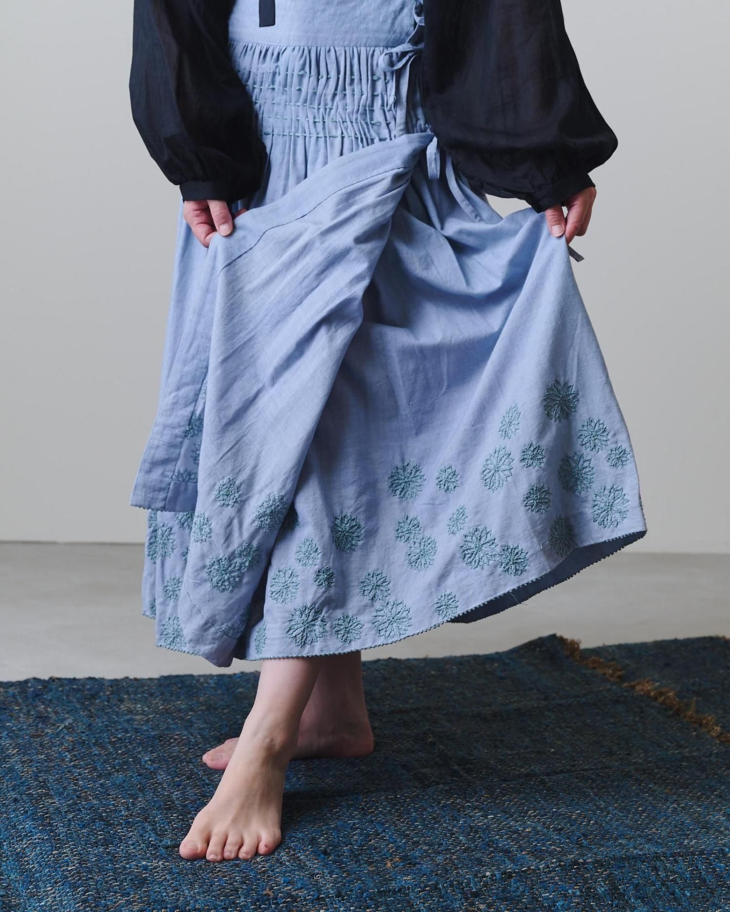 そんなカディを贅沢に使い、ステッチや刺繍など、手の込んだ手仕事をふんだんに盛り込みスカートに仕立てました。