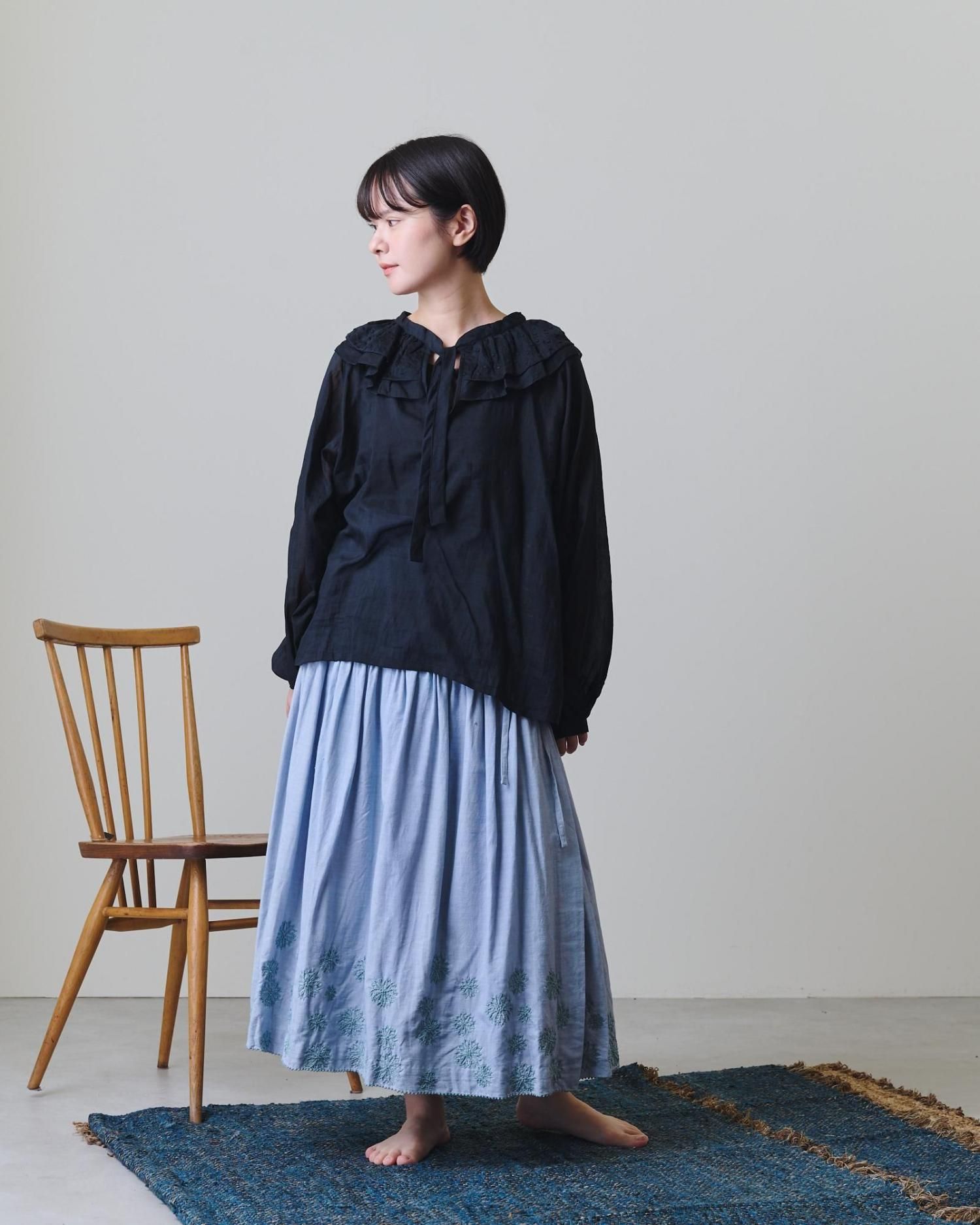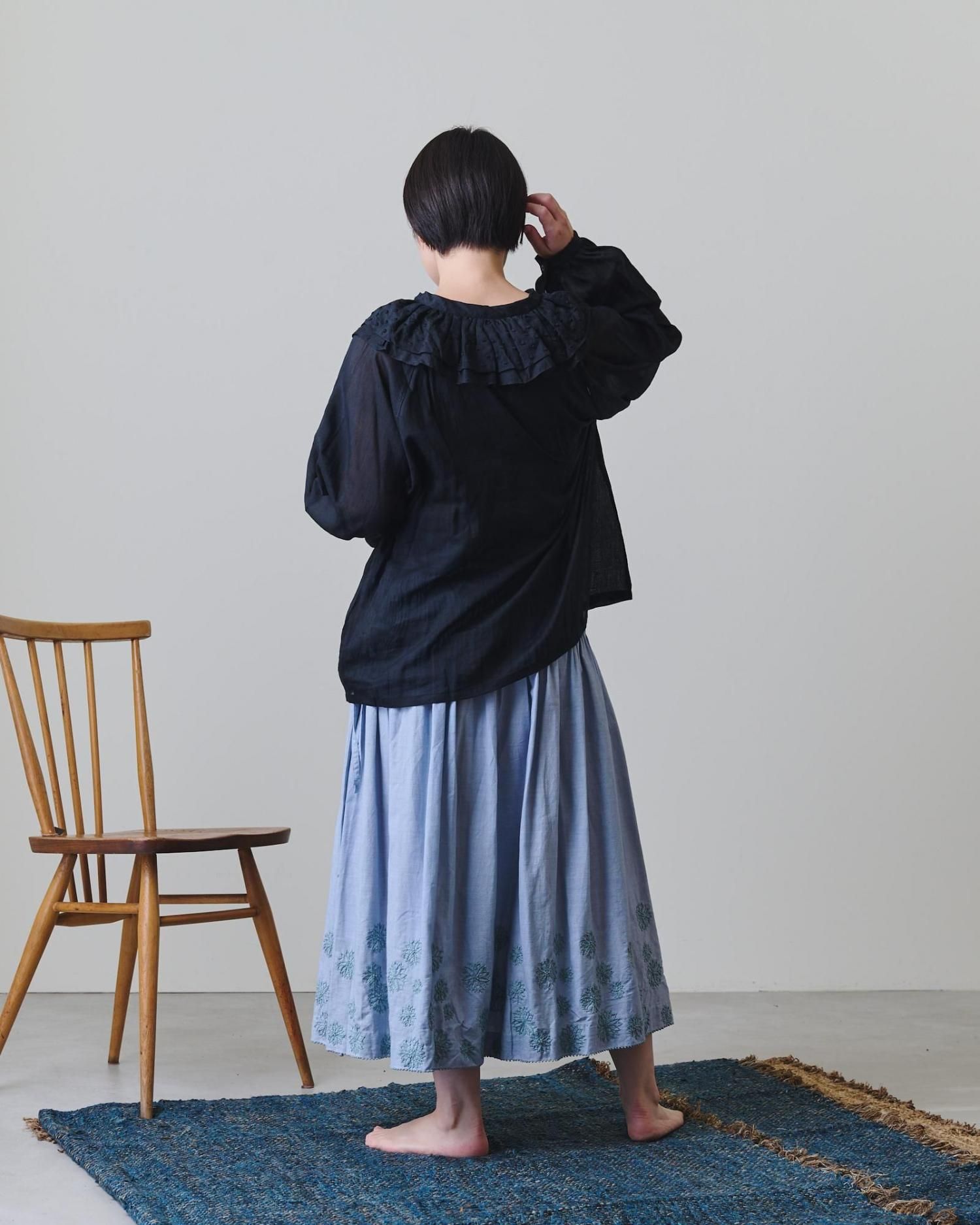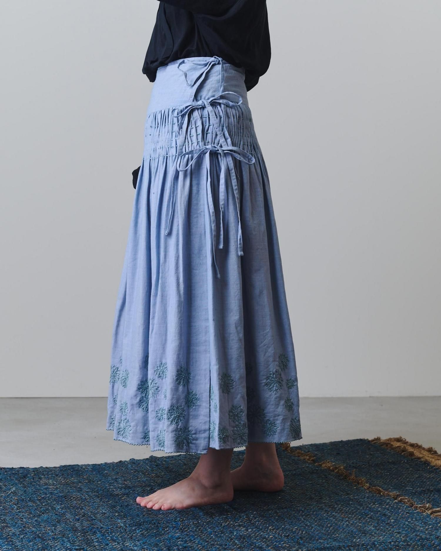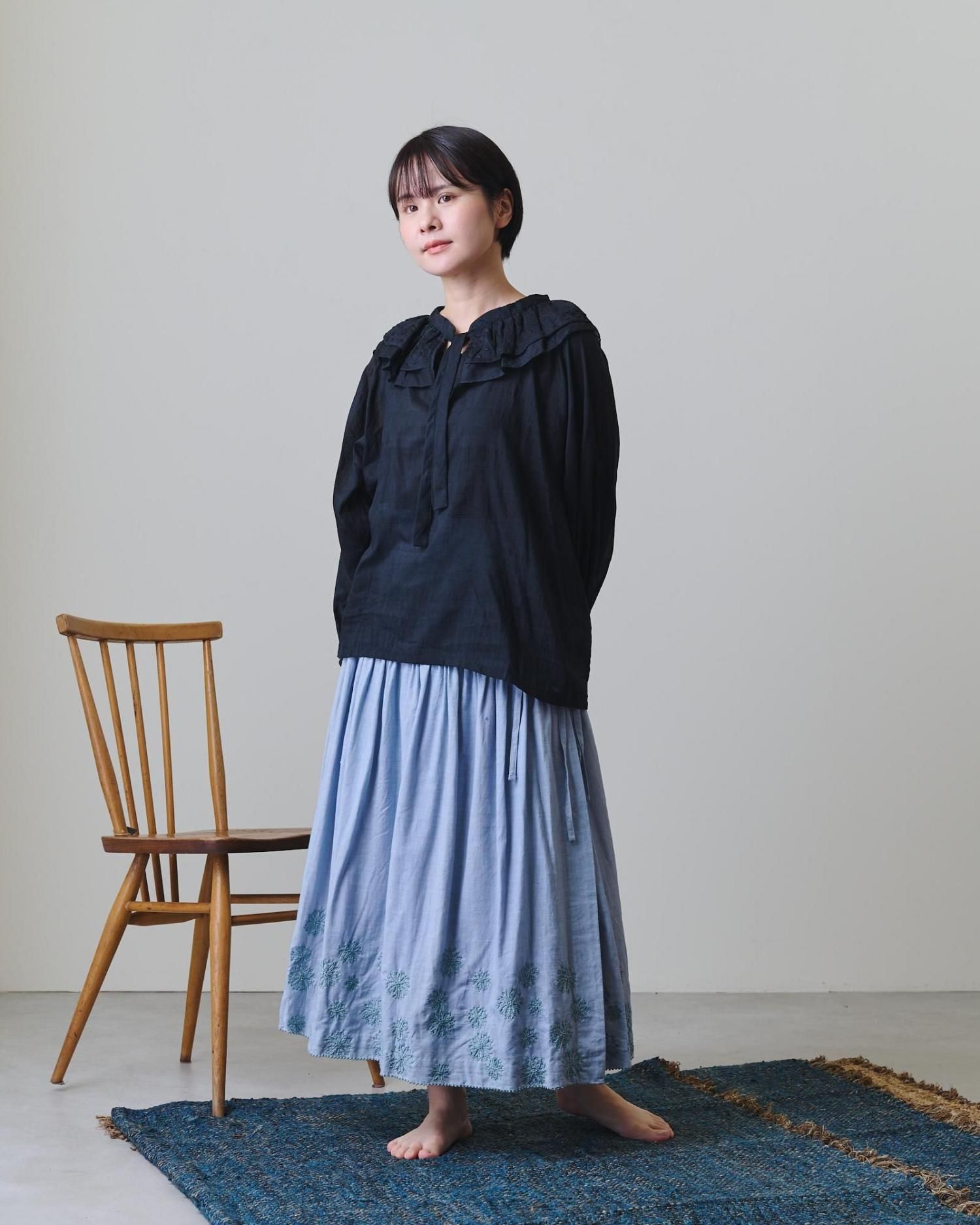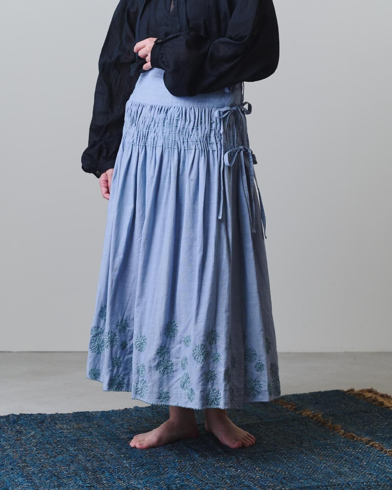 そんなカディを贅沢に使い、ステッチや刺繍など、手の込んだ手仕事をふんだんに盛り込みスカートに仕立てました。