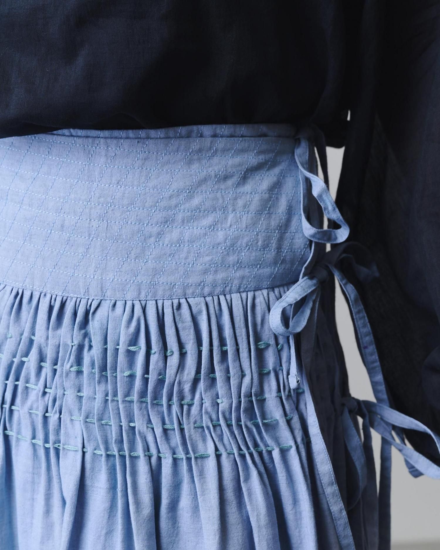 凝った作りのラップスカートは、手紡ぎ・手織りで生み出されるカディコットンの生地によるものです。