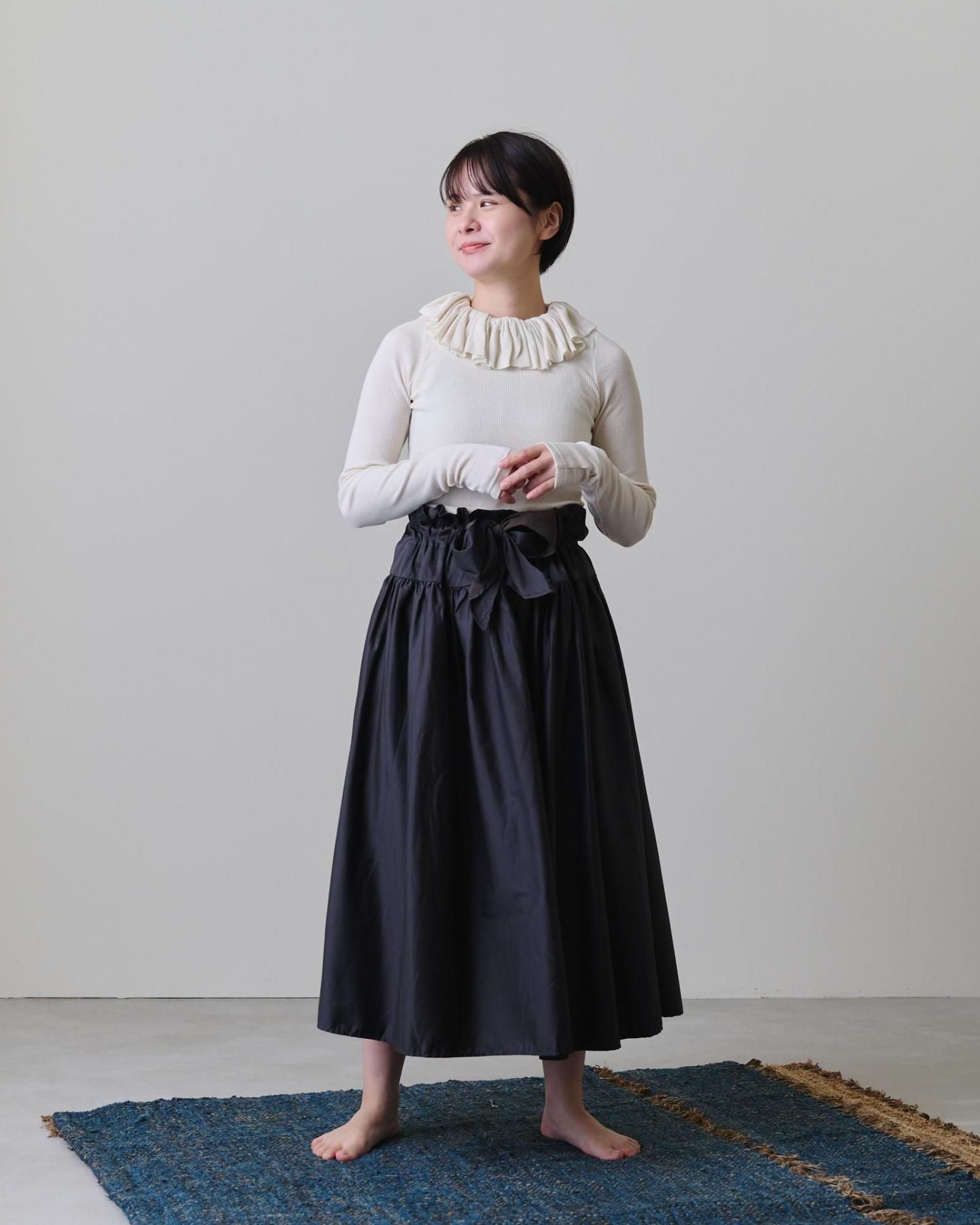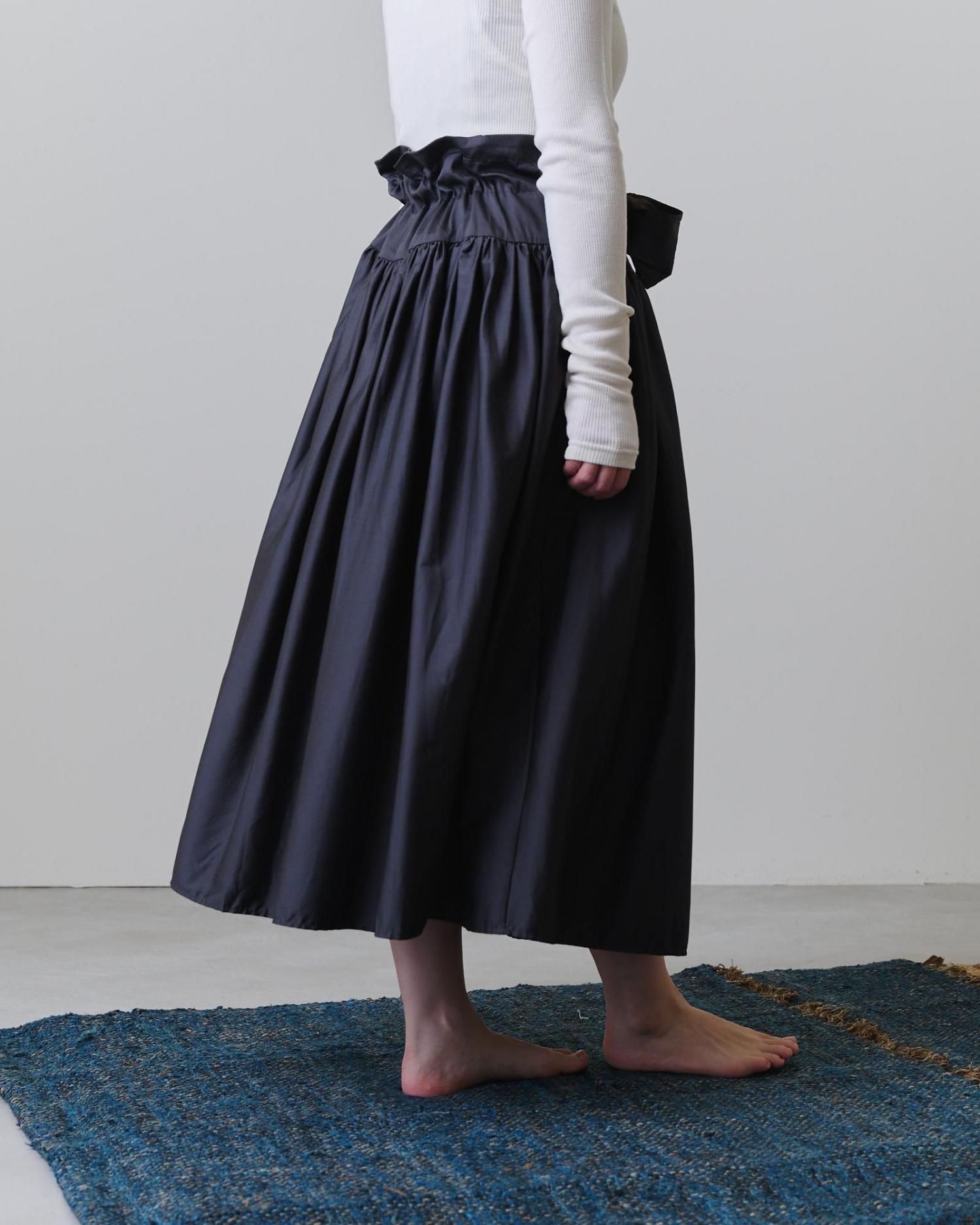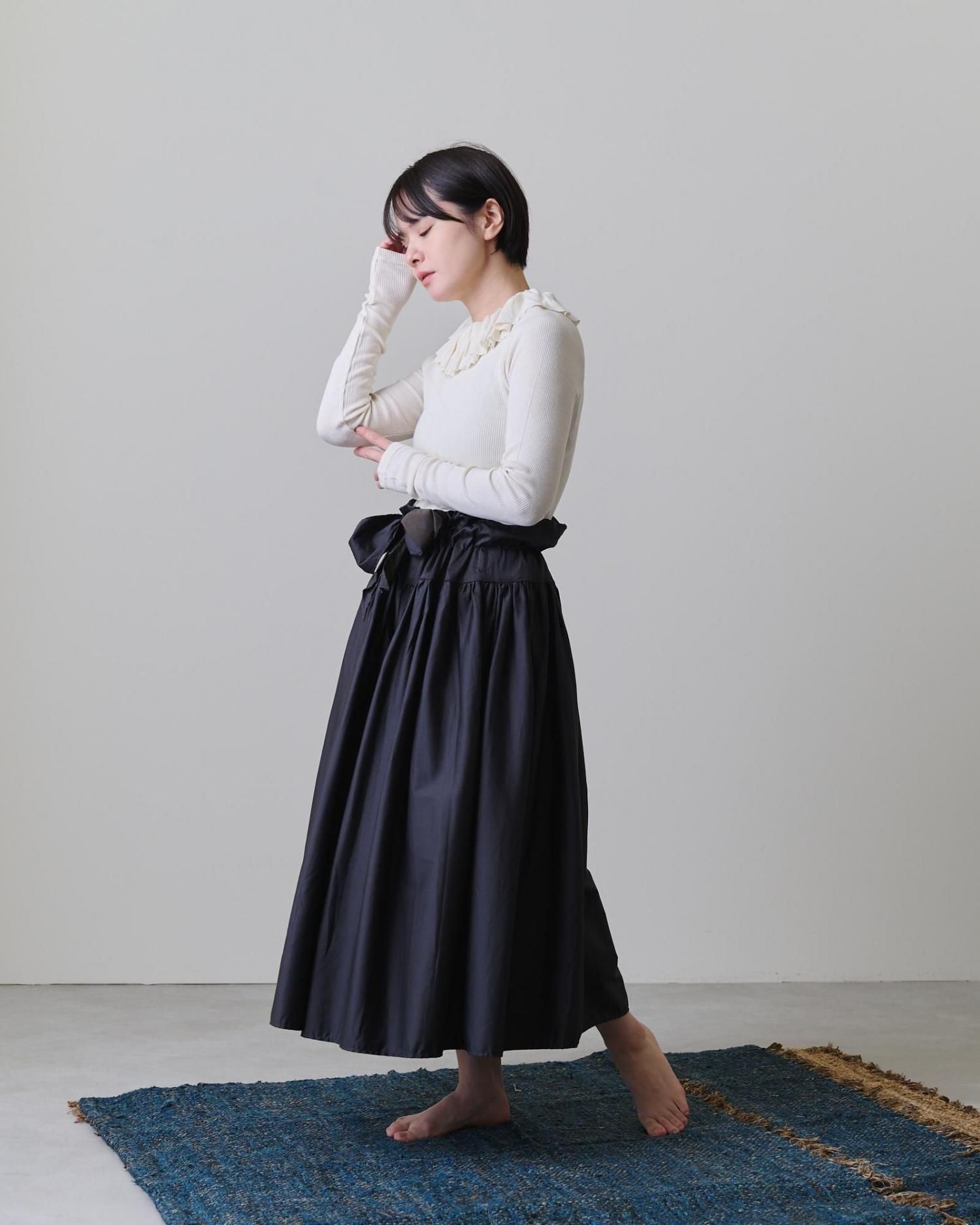 柔らかながらも張りのある生地を贅沢に使い、切り替え部分にもたっぷりとギャザーを入れたスカートは、ドレープが美しい、エレガントなシルエットに仕上がっています。