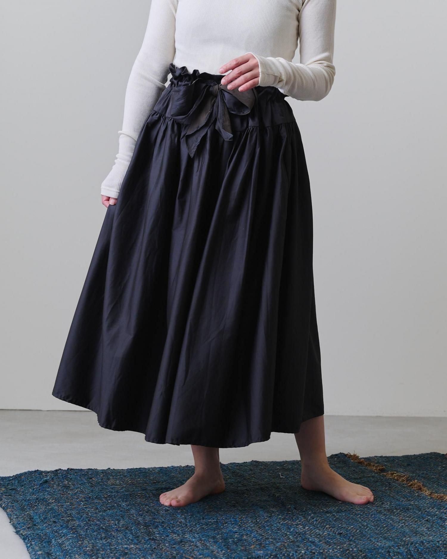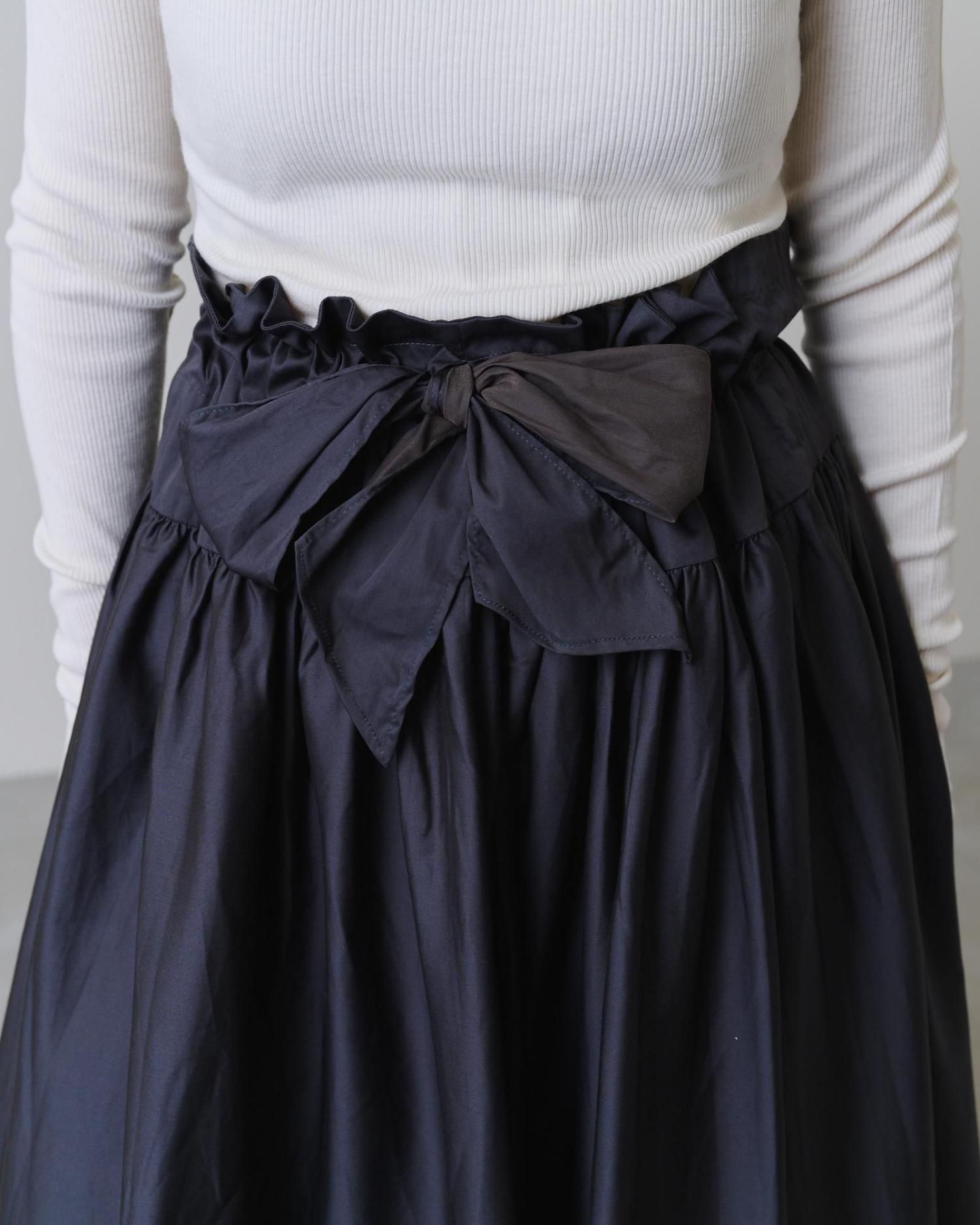 ウエストのリボンを絞ることでサイズ調節ができるようになっていて、大きなリボンはデザインのポイントにもなっています。