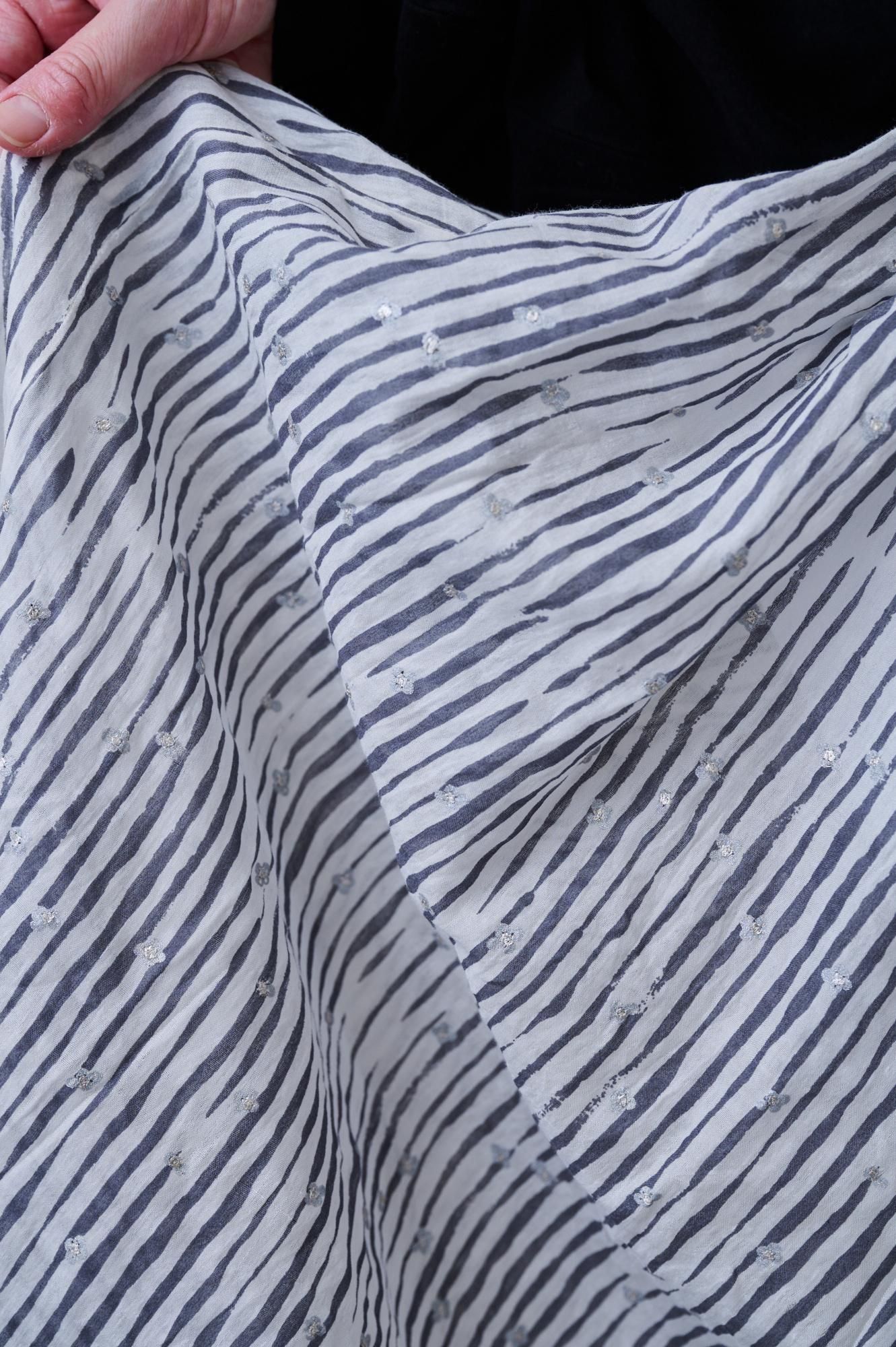 シルバーの小花プリントの中心には、シルバーの糸で立体的な刺繍が施されています。