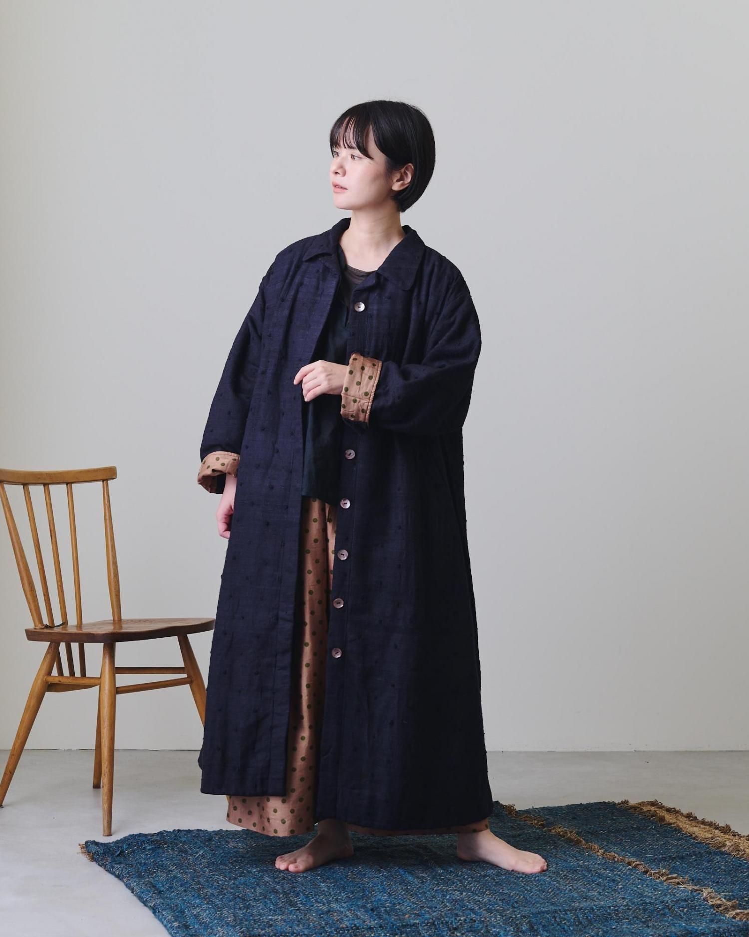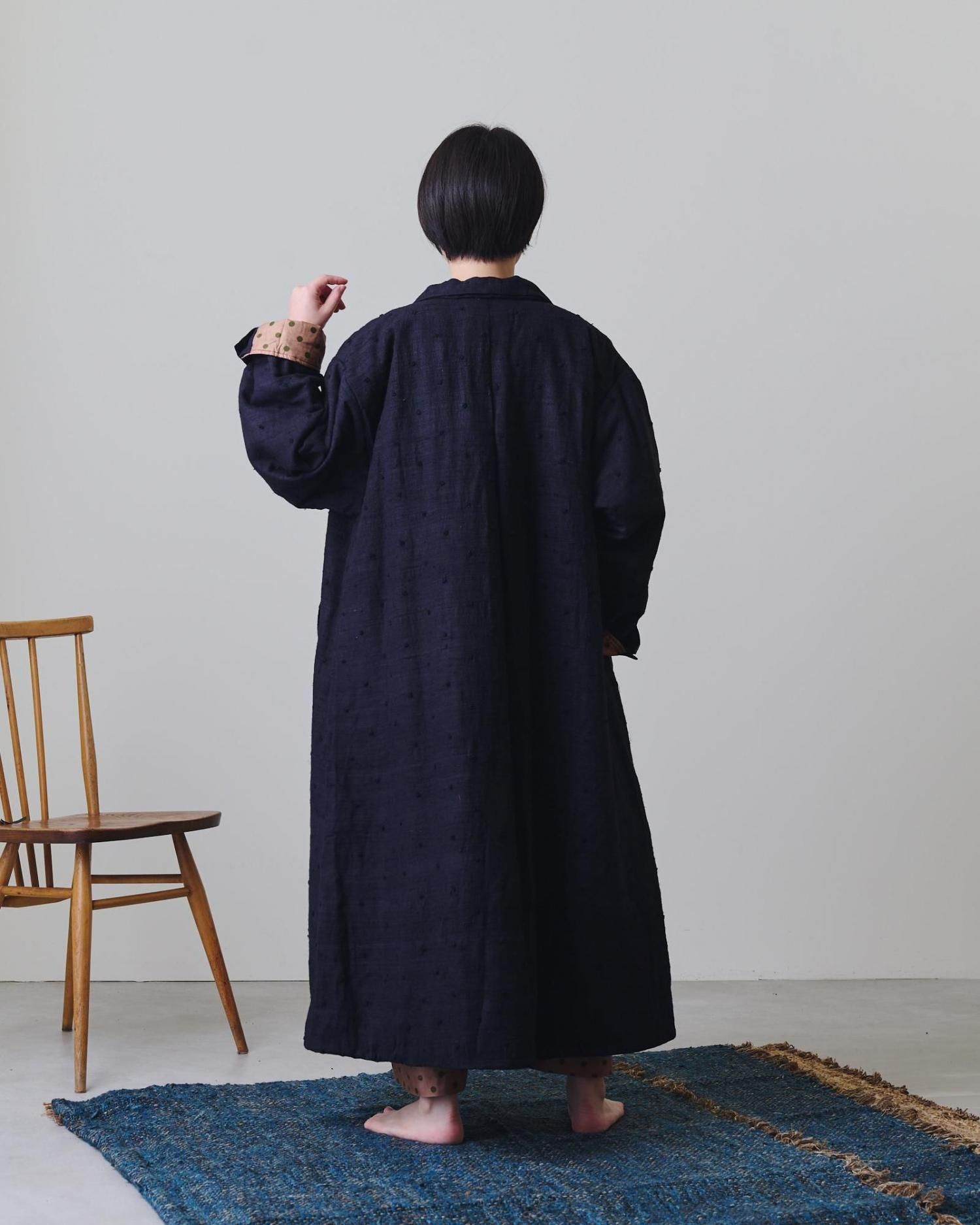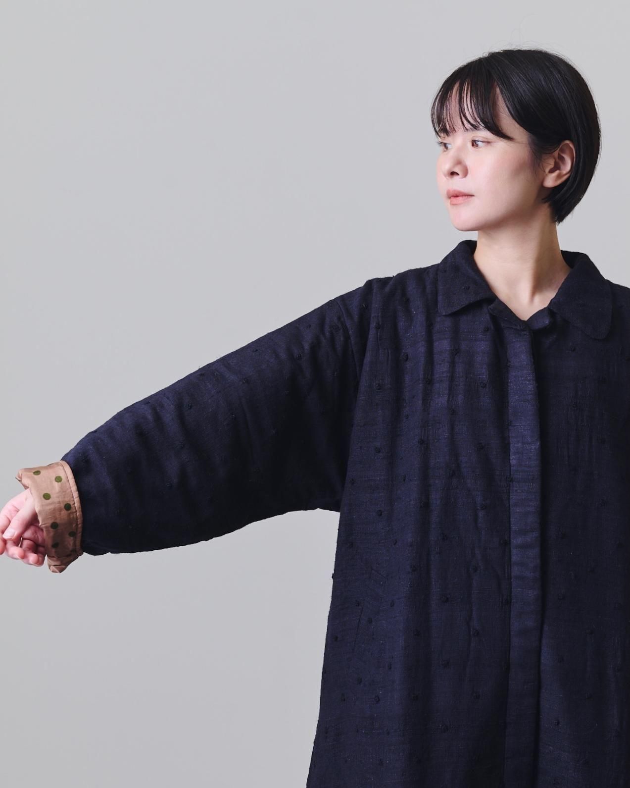 表地にはシルク、裏地にはコットンを用い、キルト仕立てに仕上げた贅沢なコートです。