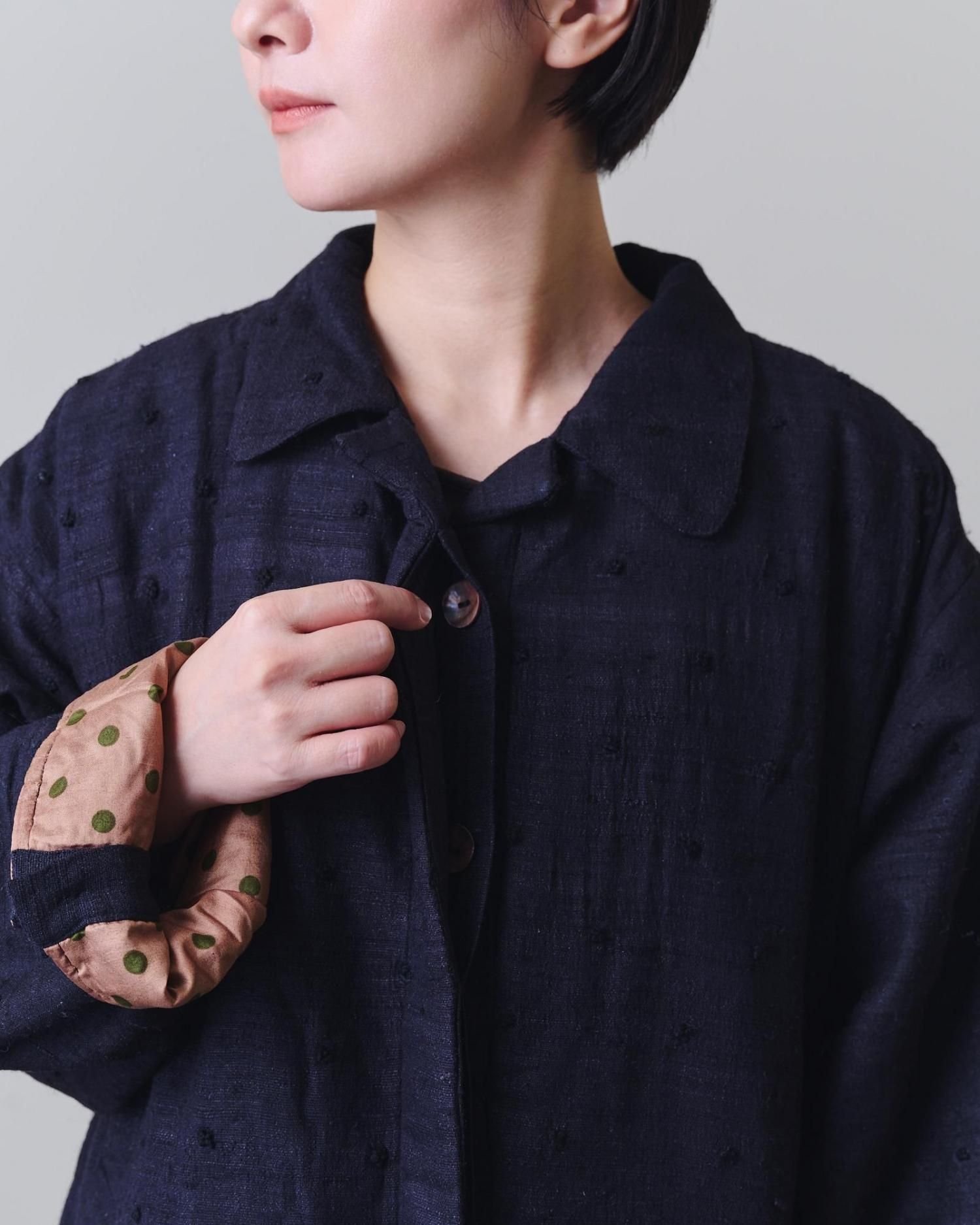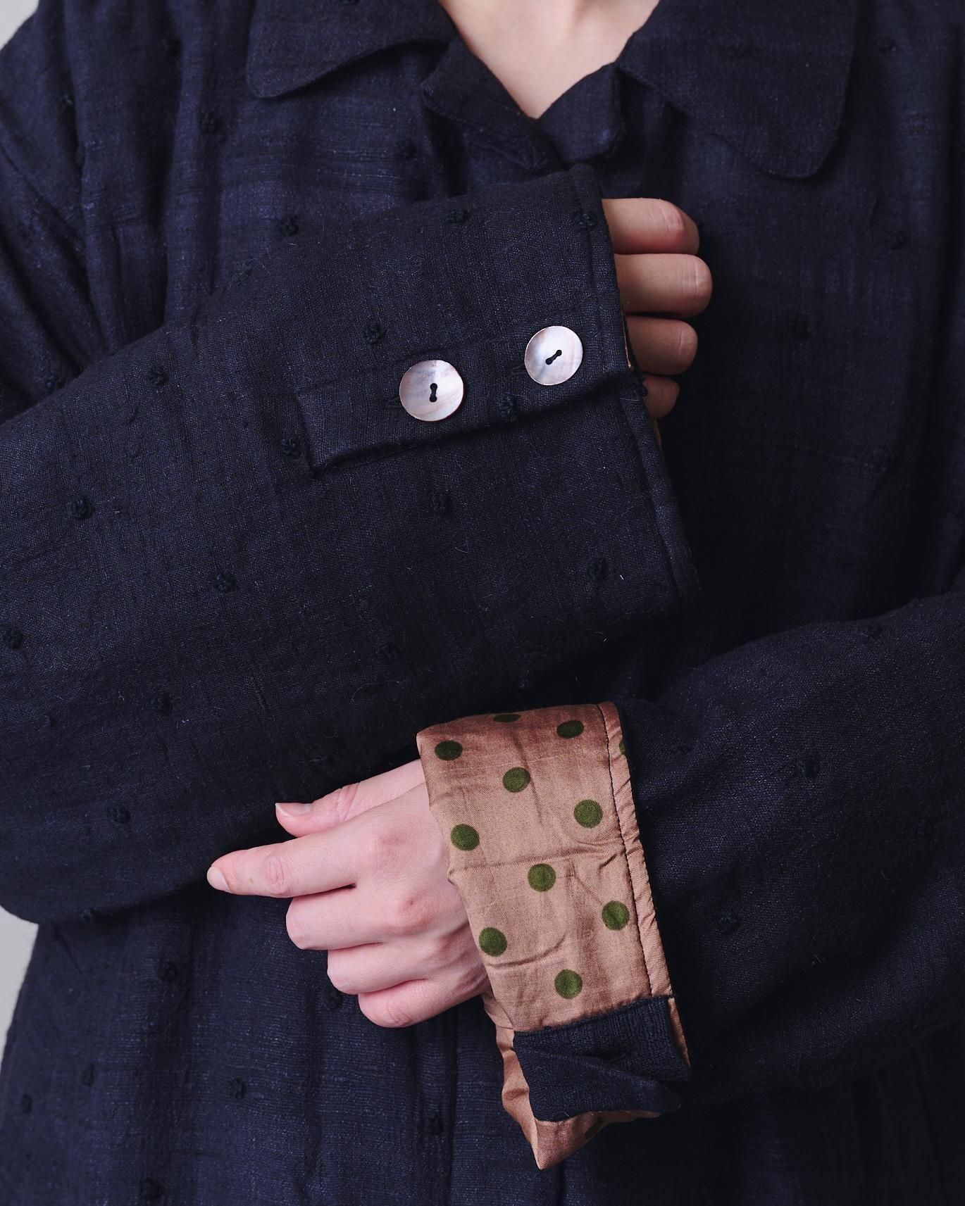 袖部分の裏地にはドット柄のシルク生地が用いられていて、袖を折り返して裏地を見せて着ると可愛いです。