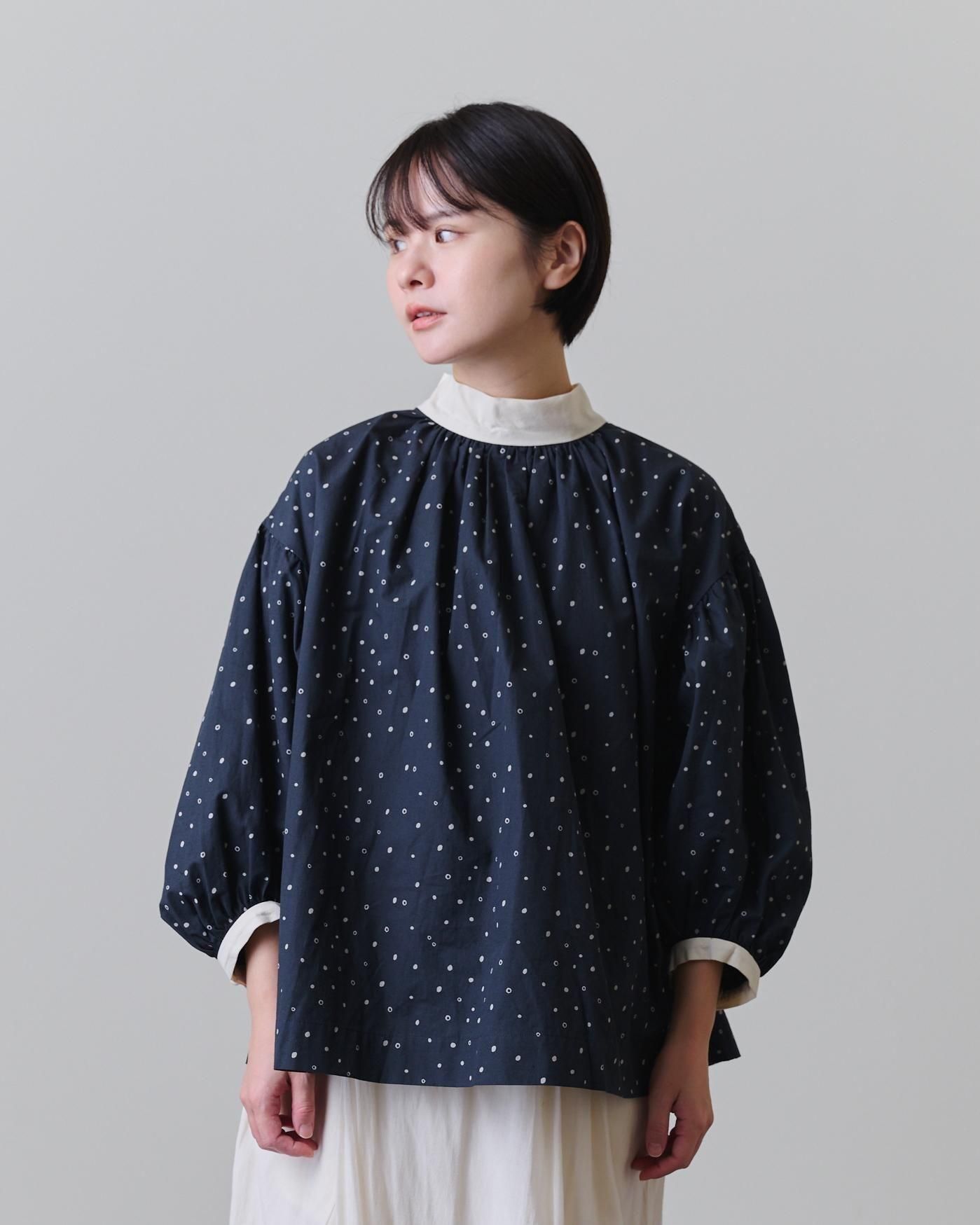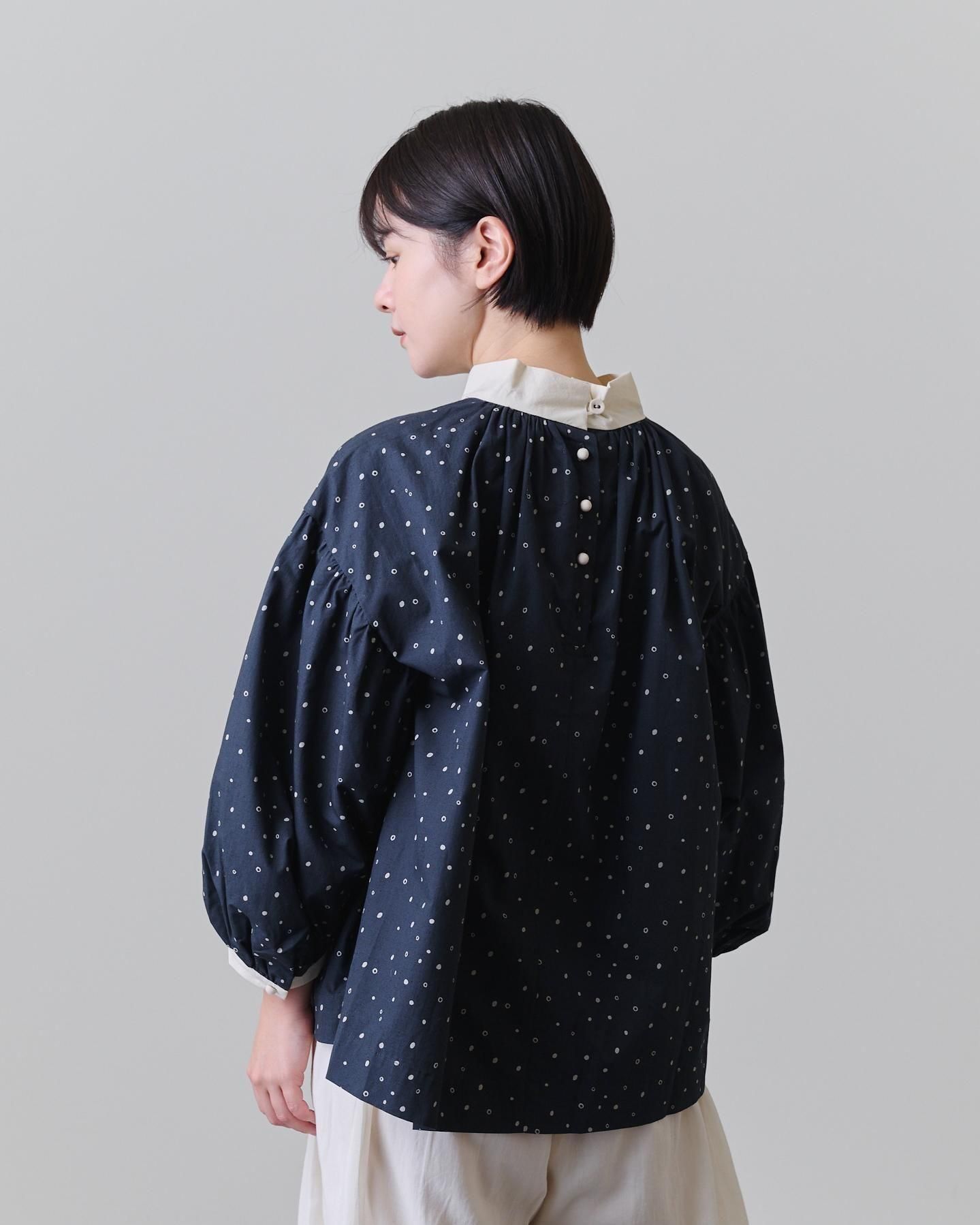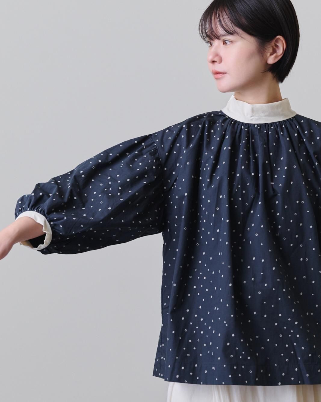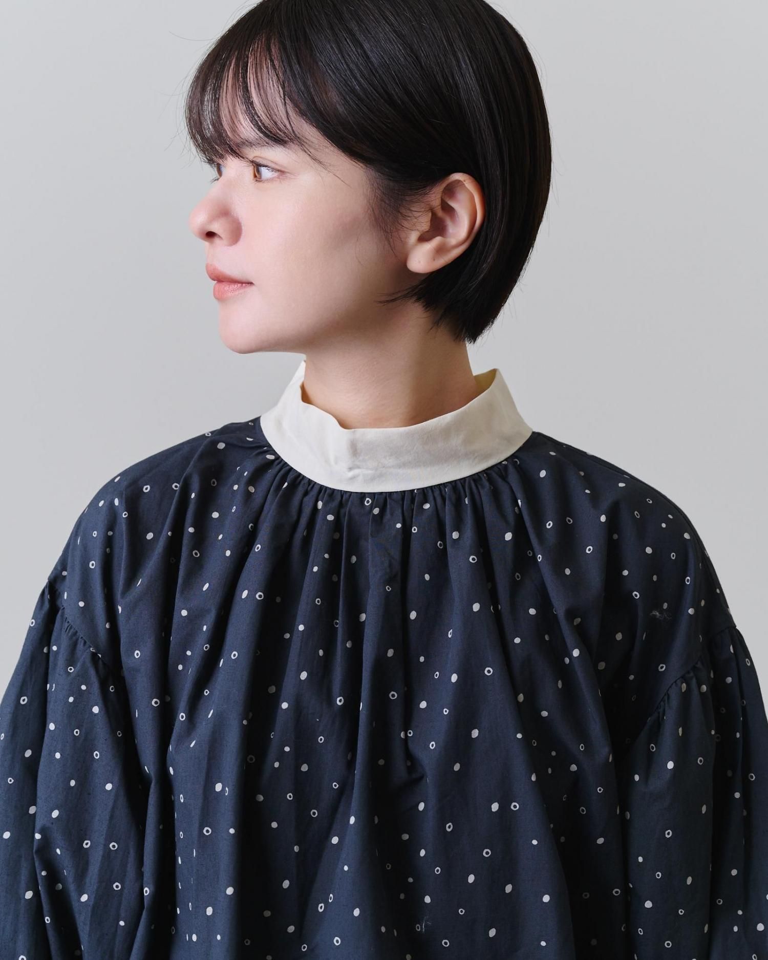 袖口だけでなく襟元にもぎゅっとギャザーを寄せ、
