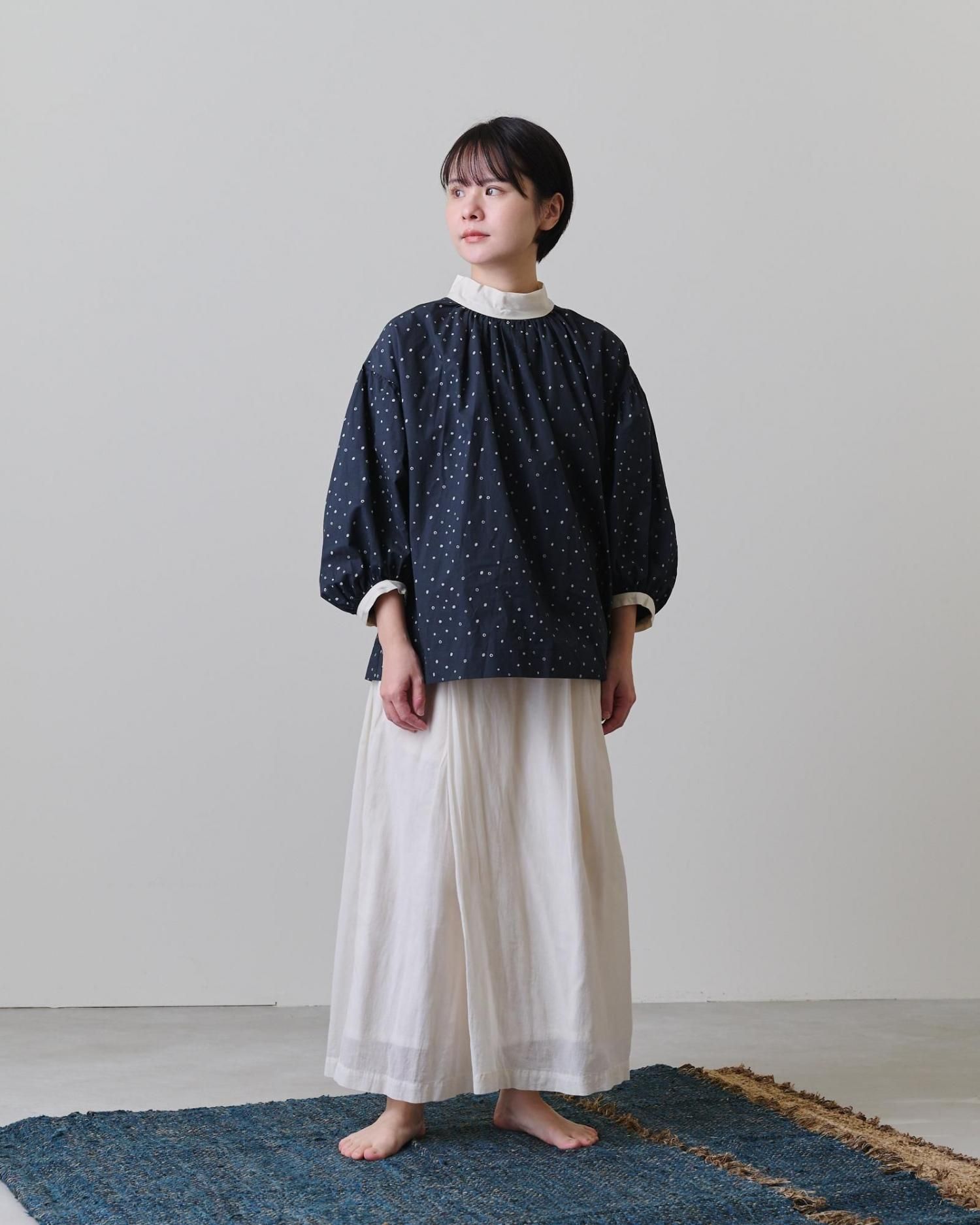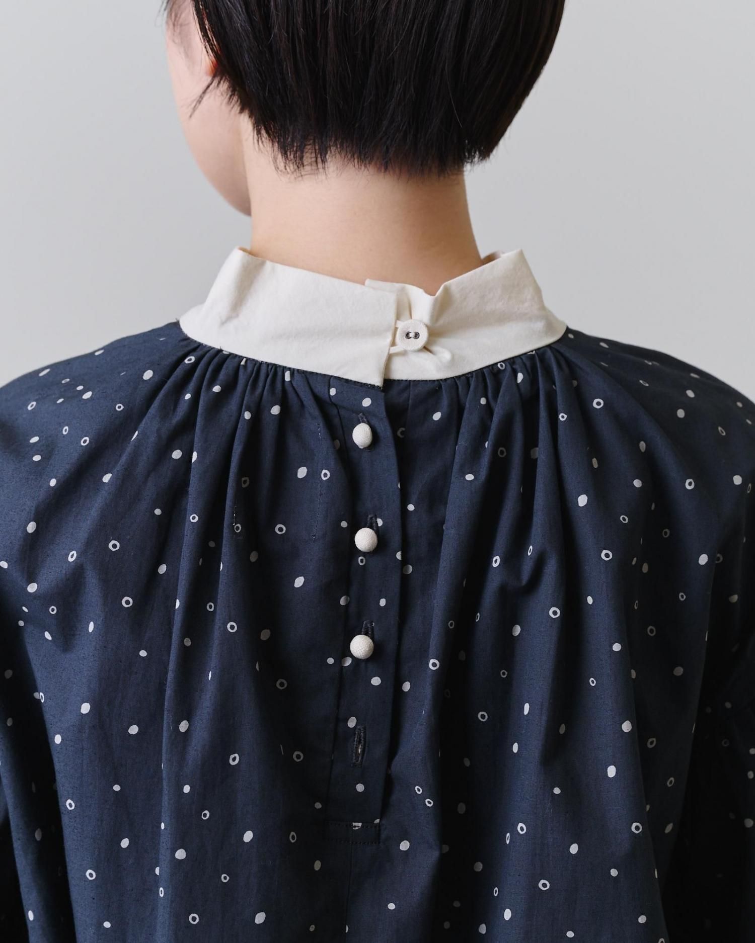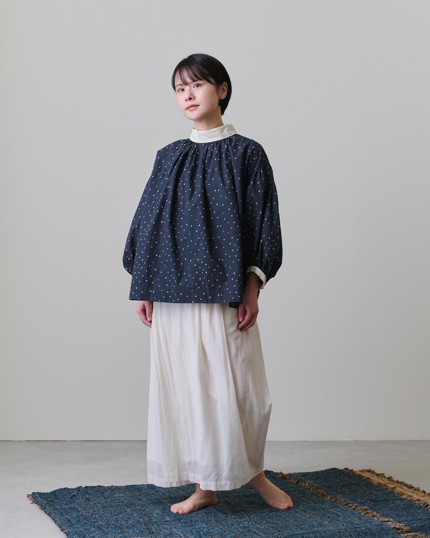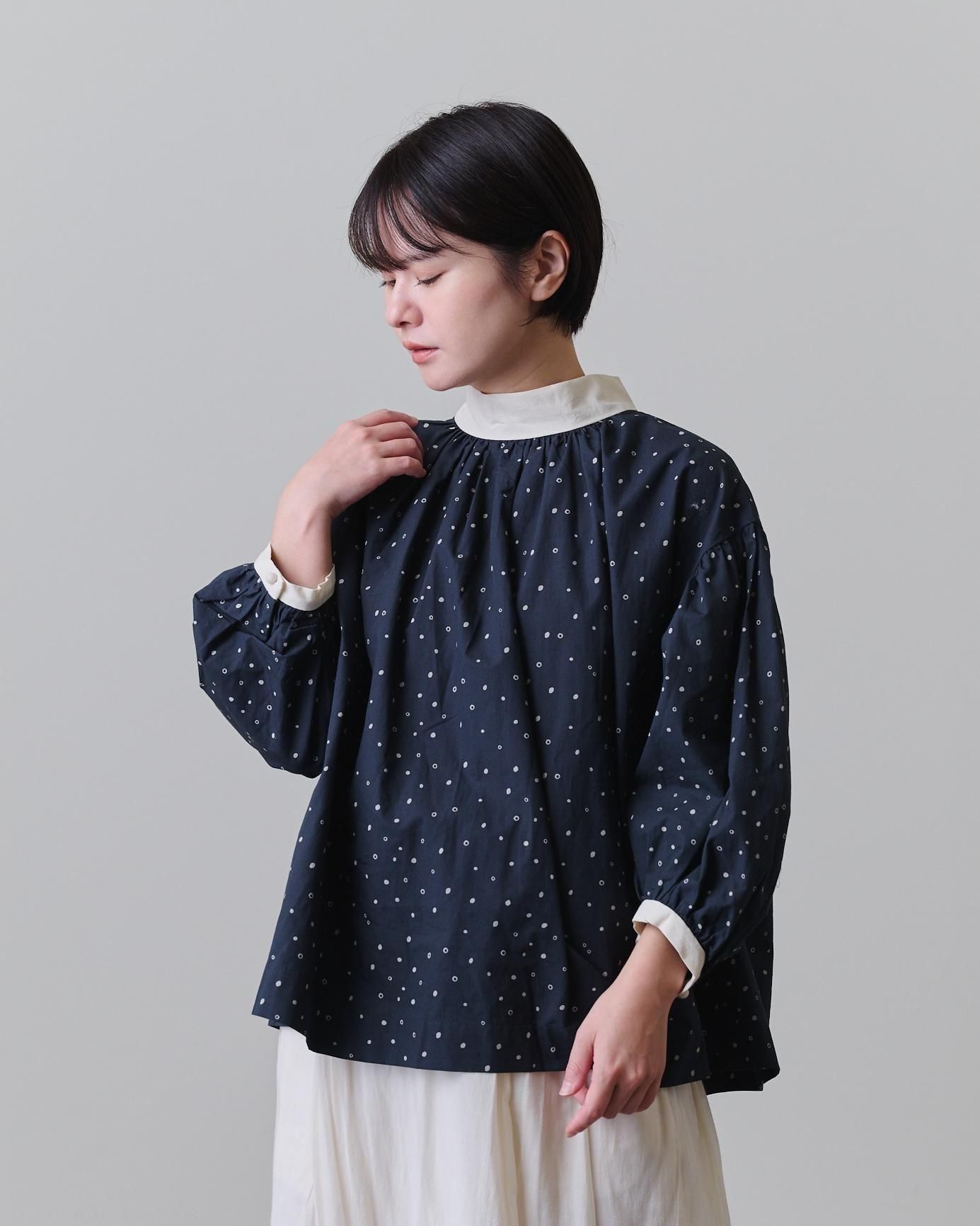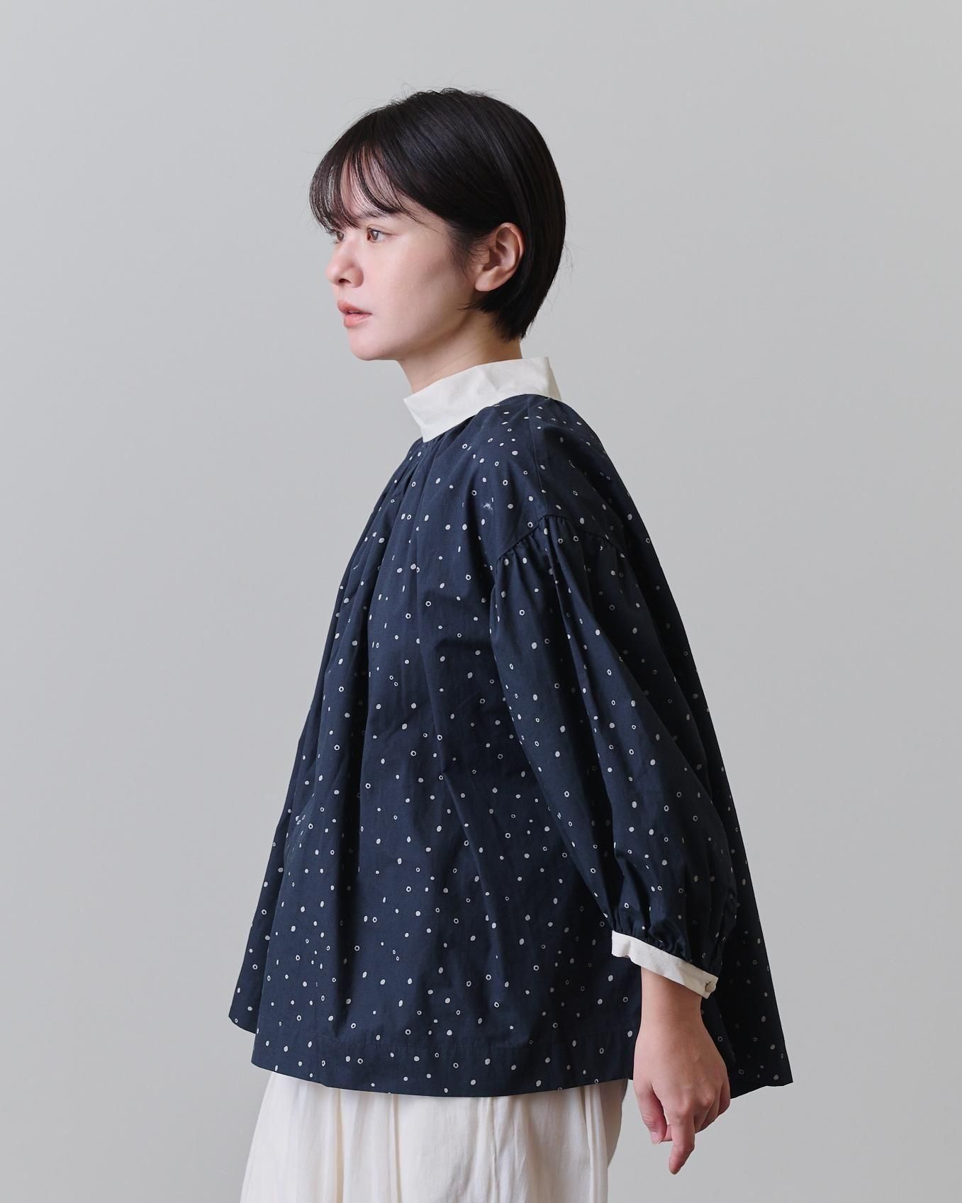 袖口だけでなく襟元にもぎゅっとギャザーを寄せ、