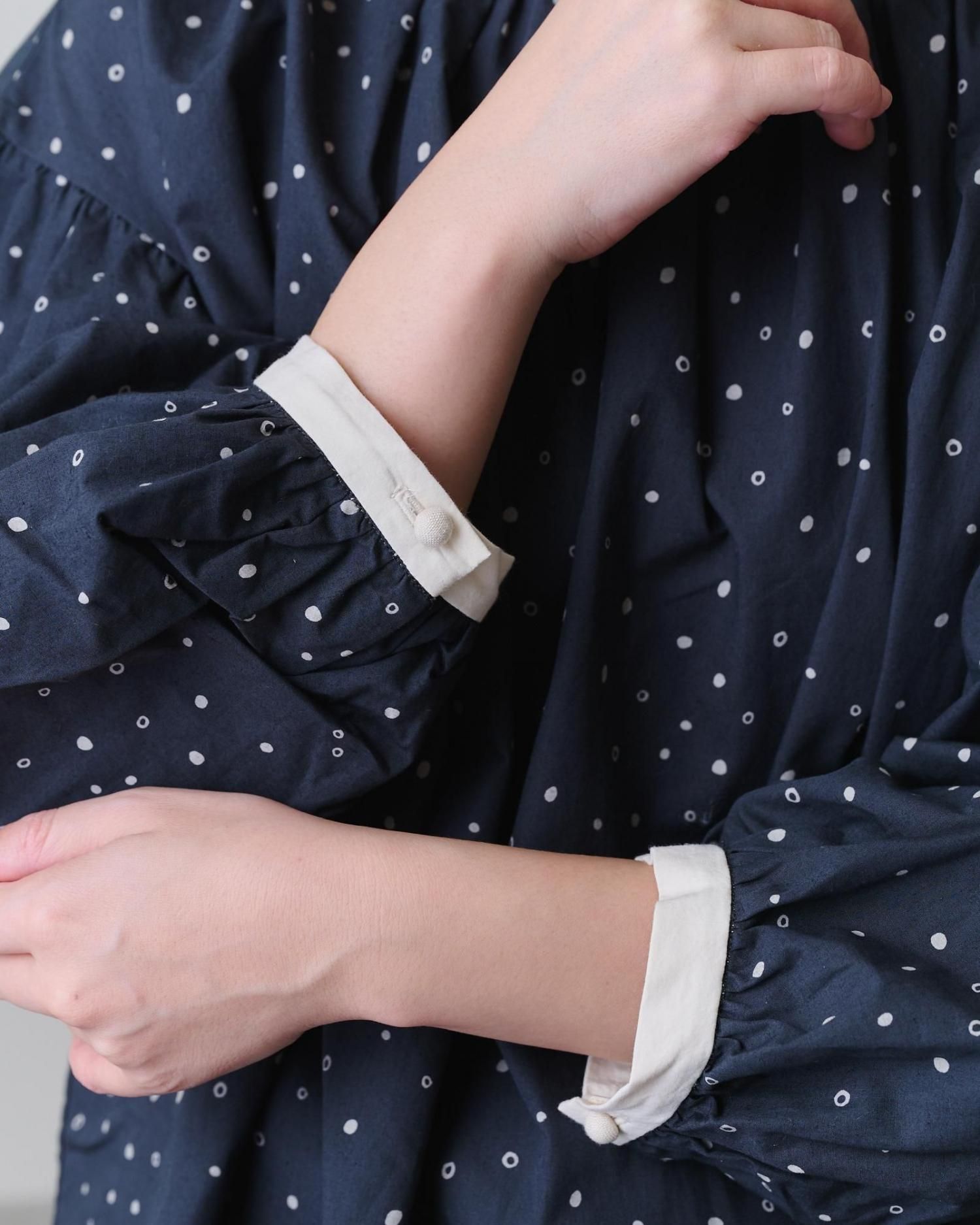袖と後ろの開きには、ころころと小さなくるみボタンをあしらっています。
