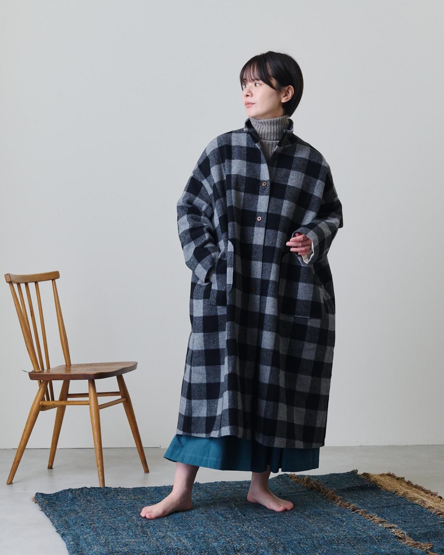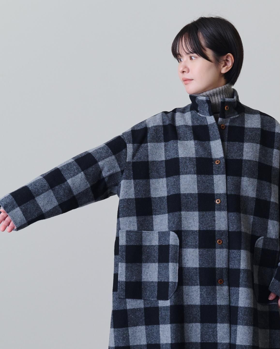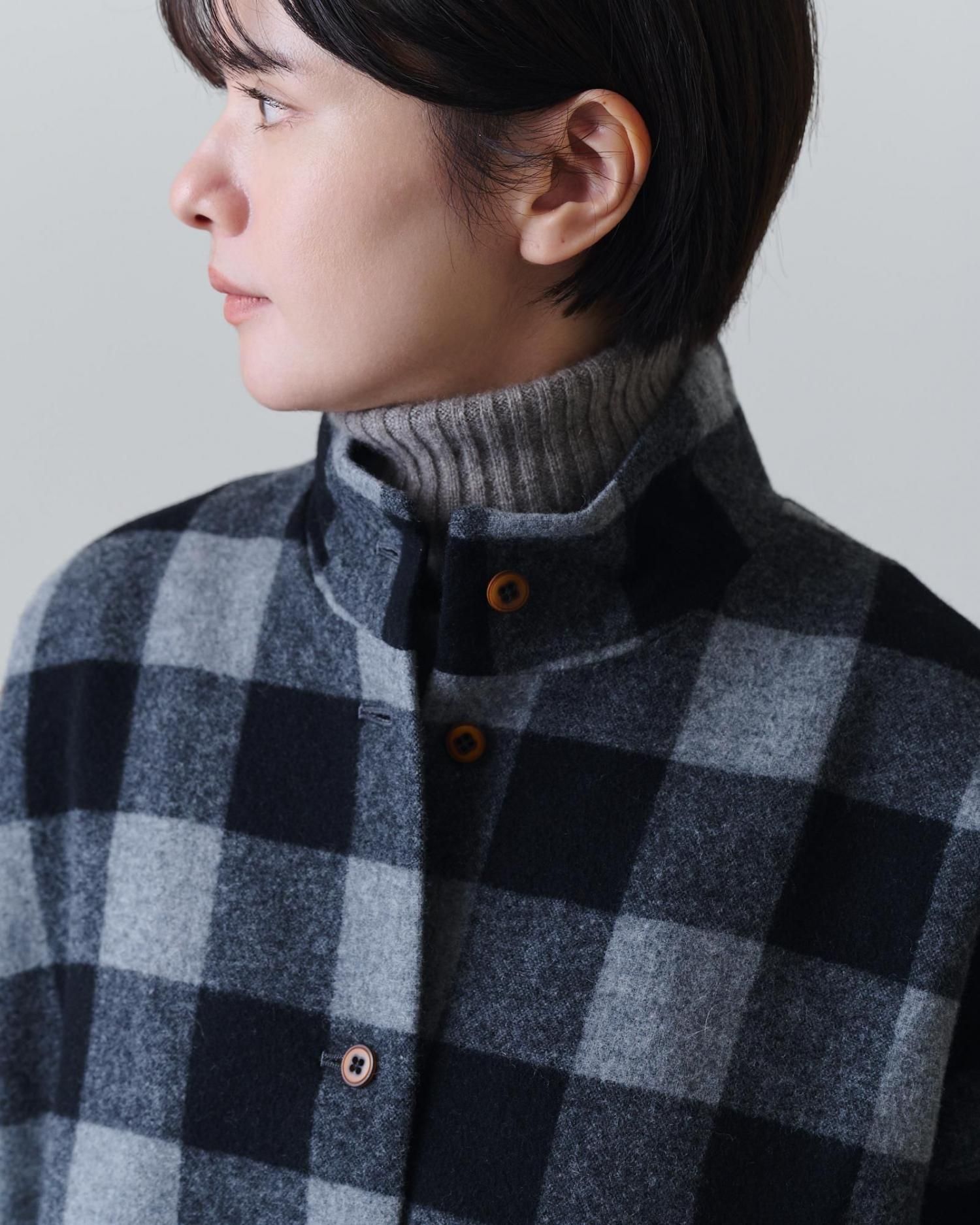 ブロックチェックウール・ハイネックコート