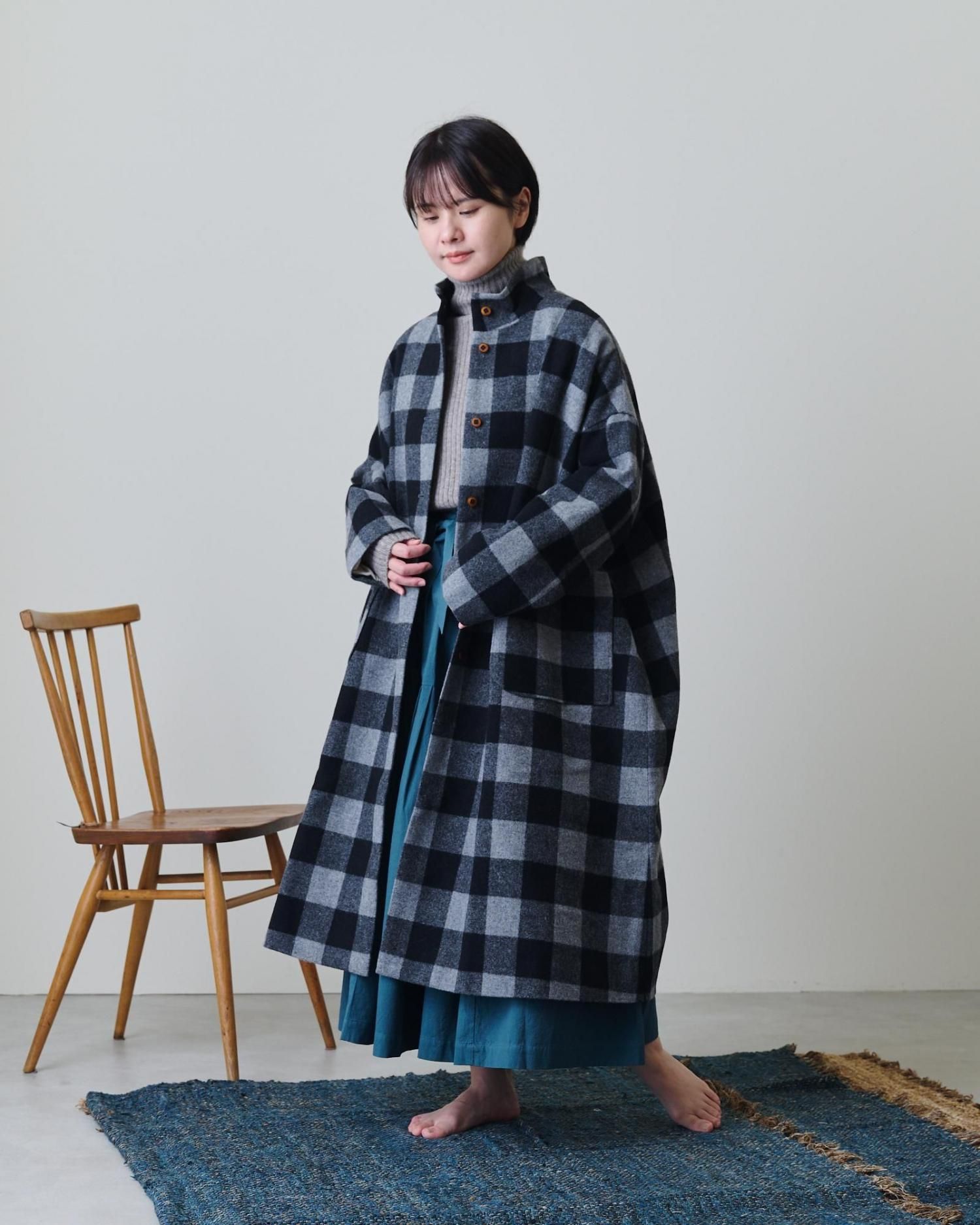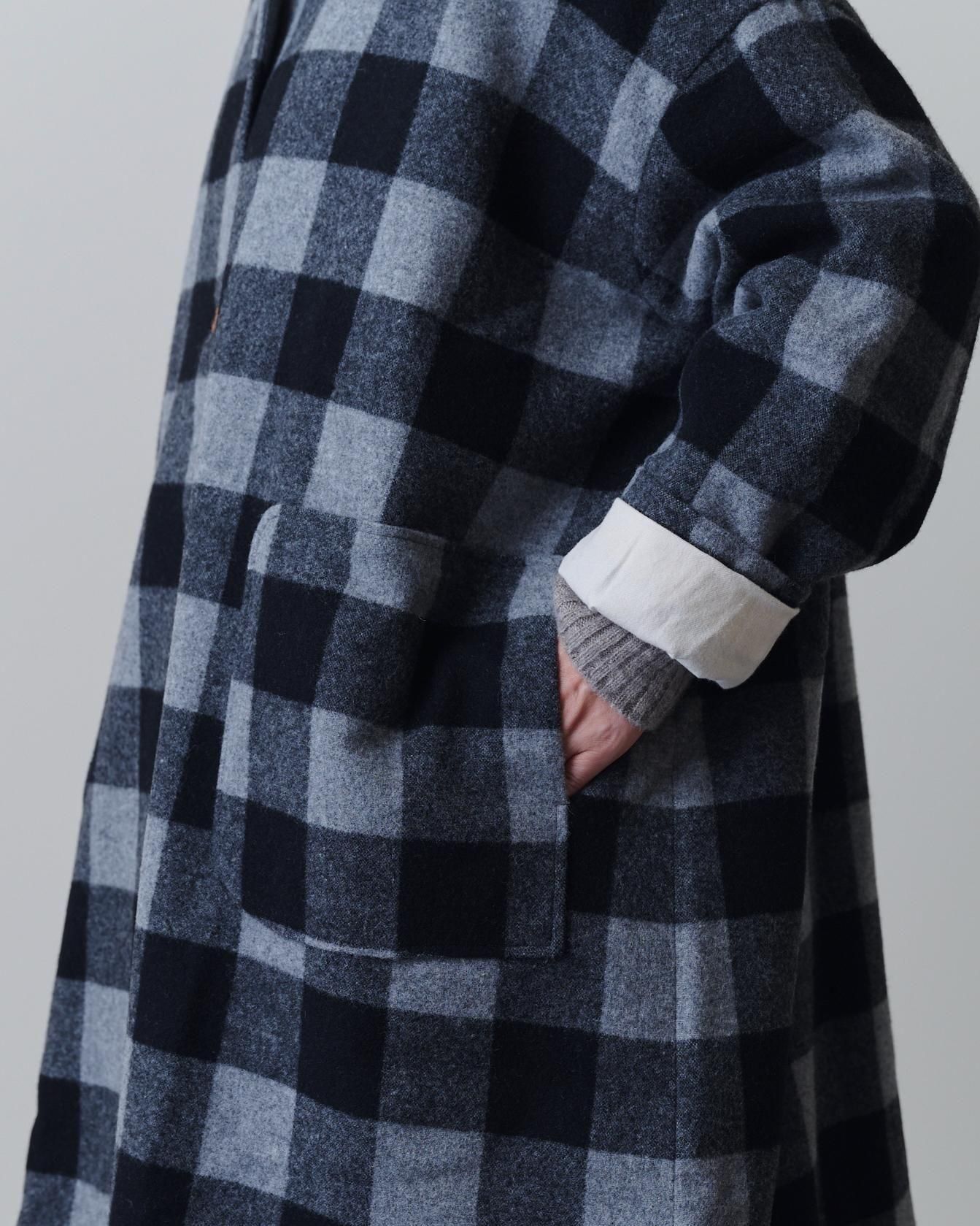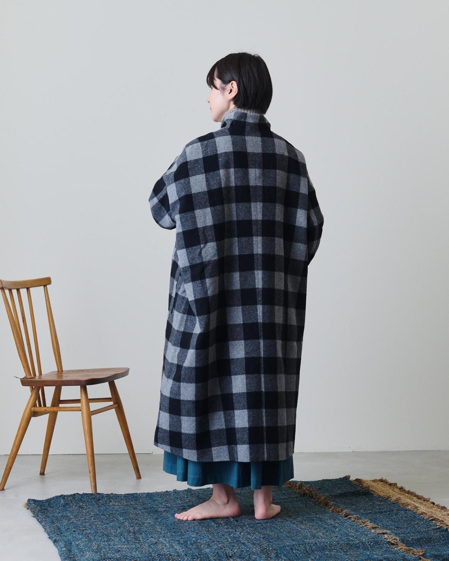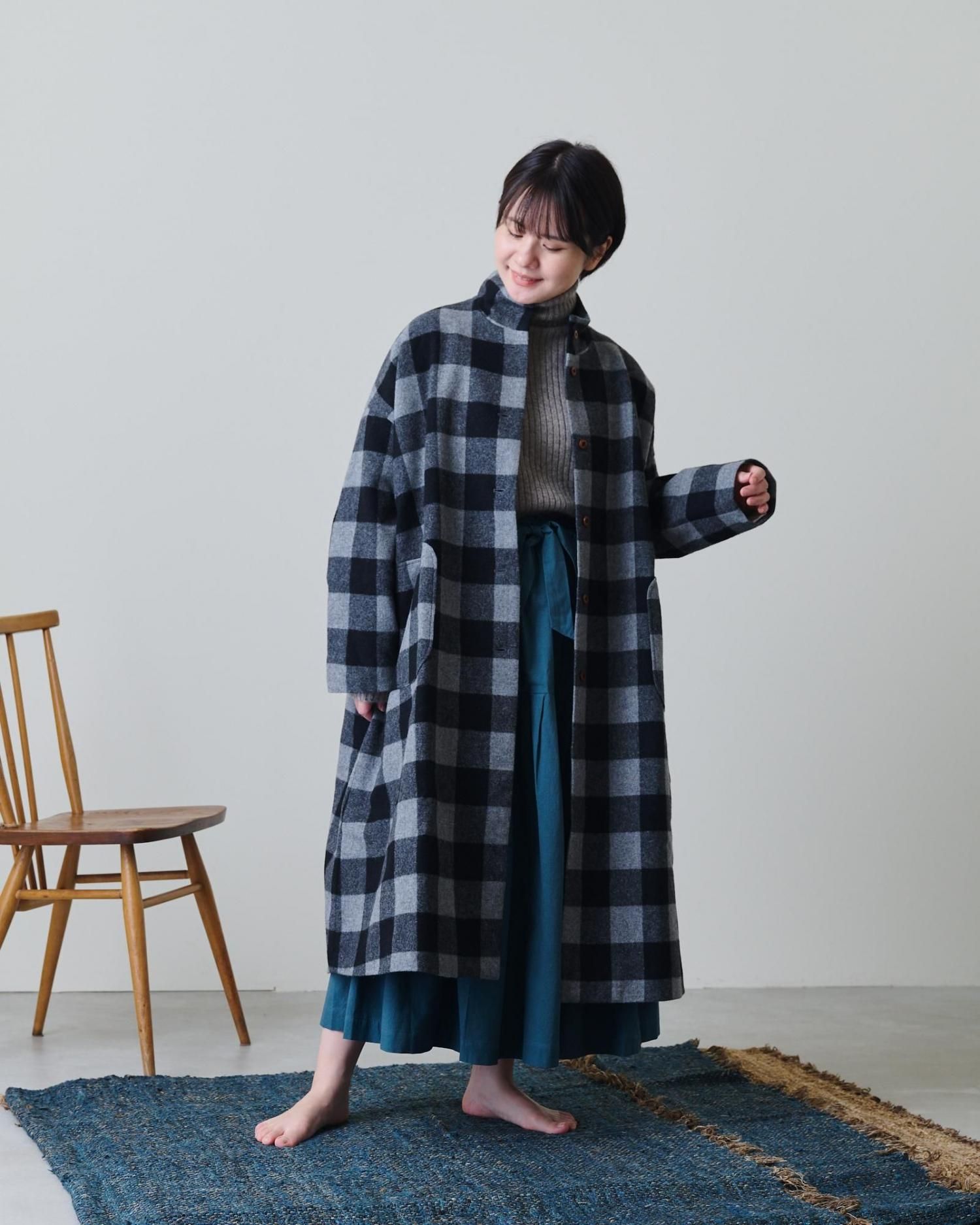ブロックチェックウール・ハイネックコート