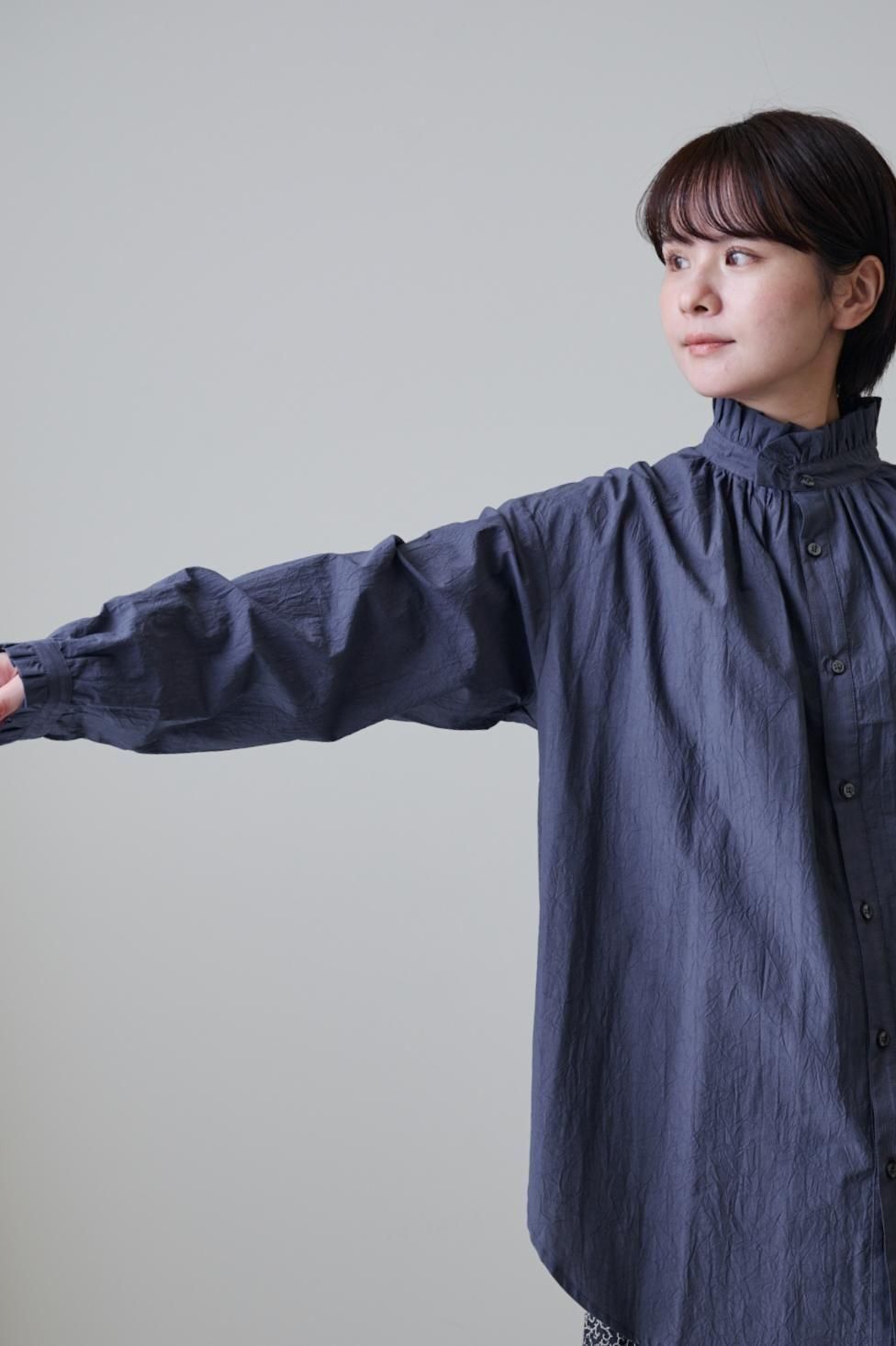襟のプリーツを首周りのギャザーへつなげることでドレープ感の良いシルエットを生み出したブラウス。