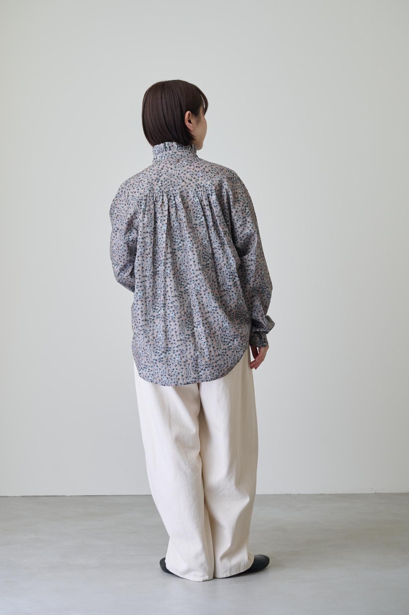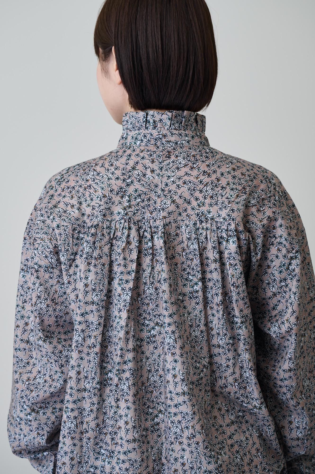 後身頃はヨーク切り替え部分にたっぷりとギャザーを入れ、ドレープ感のある柔らかなシルエットを生み出しています。