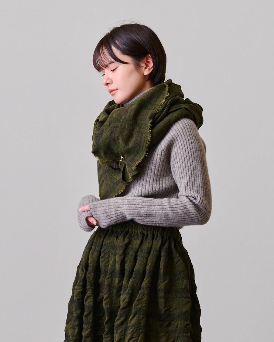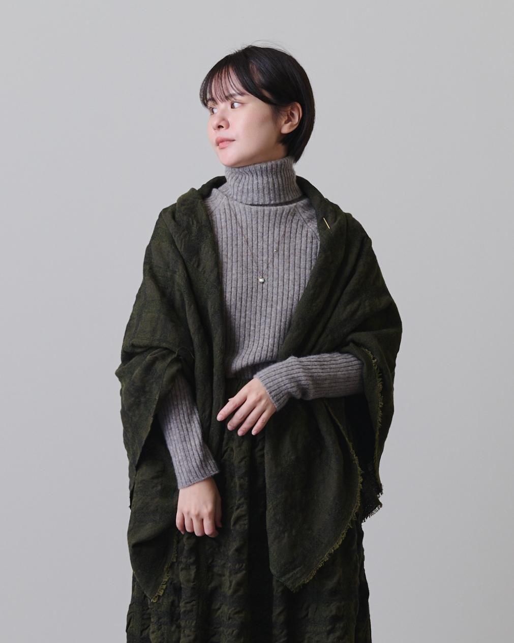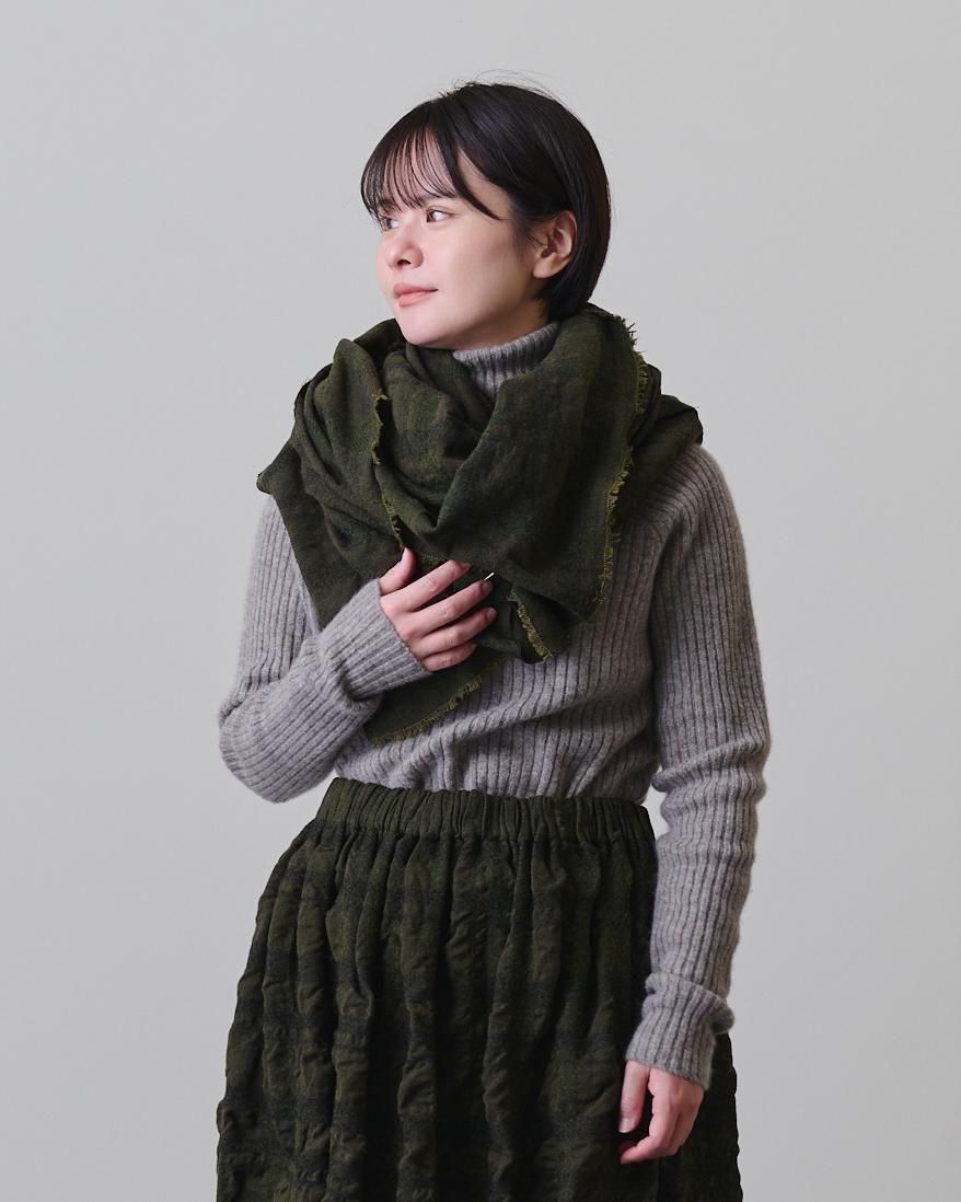 大判サイズのストールは、肩から掛けたり、首元に巻いたり、応用範囲の広さが魅力。