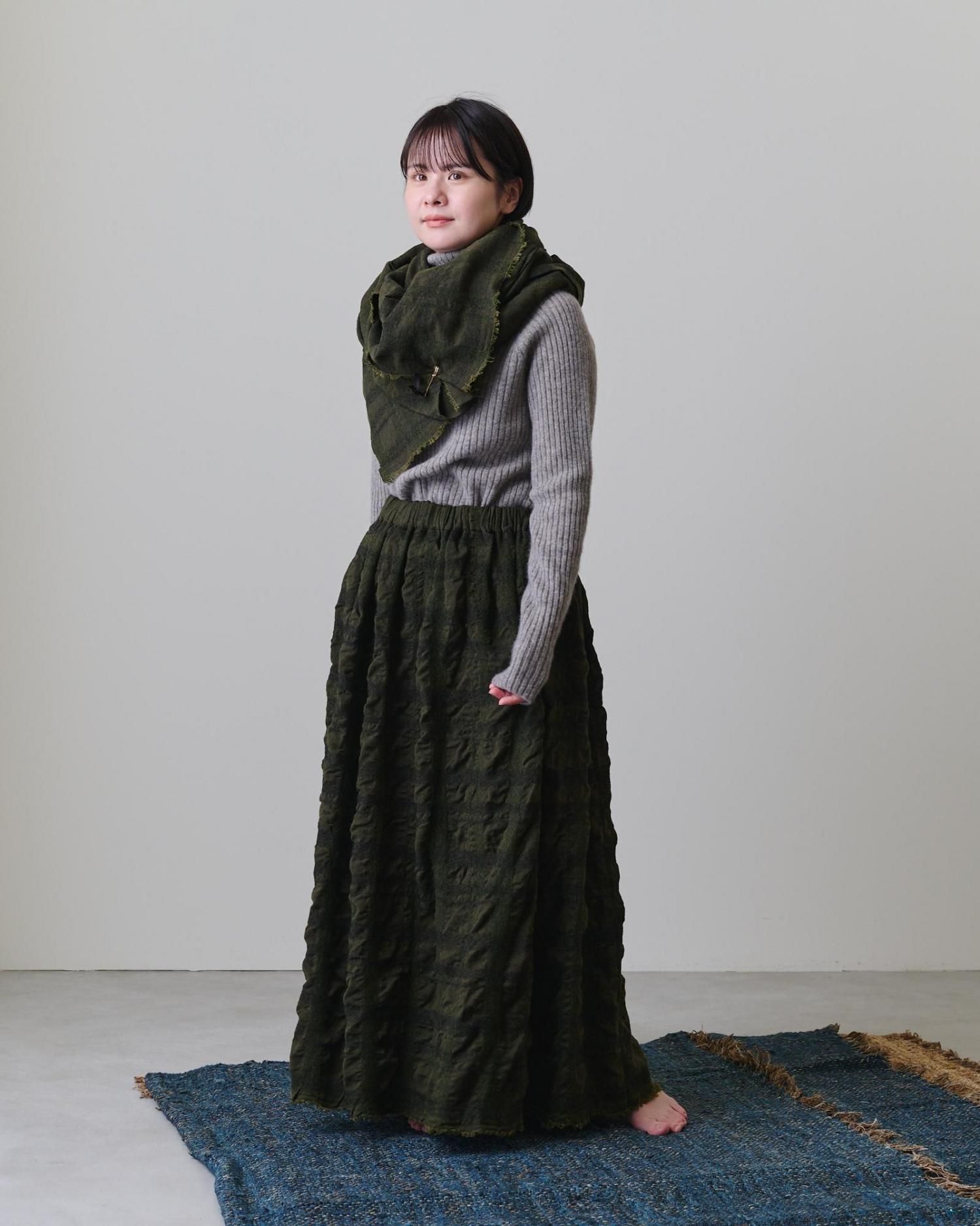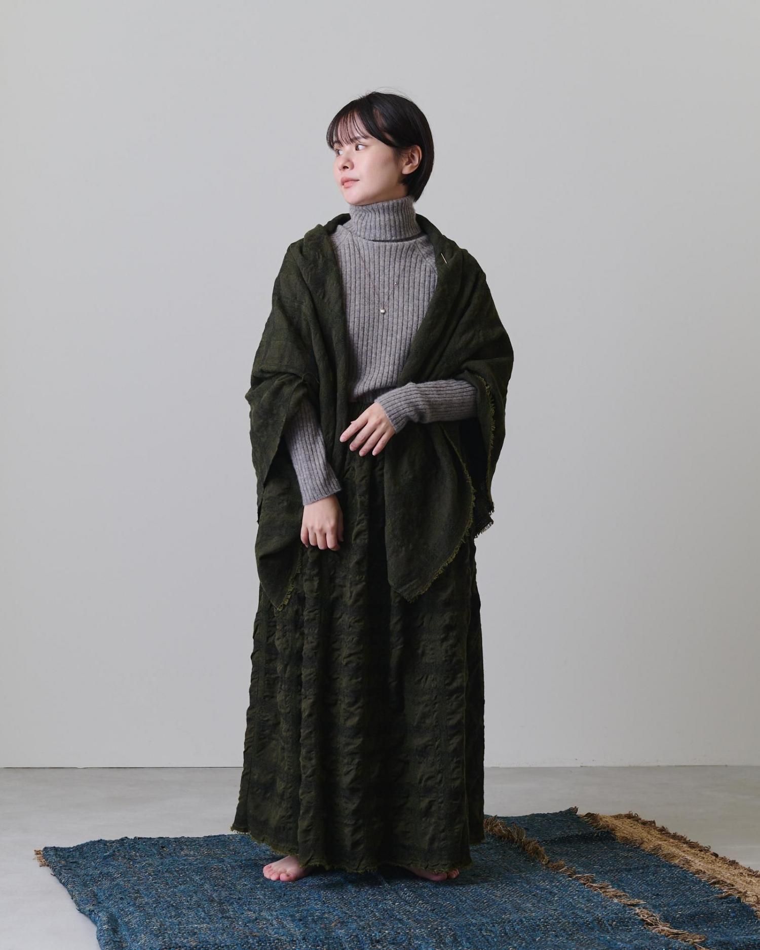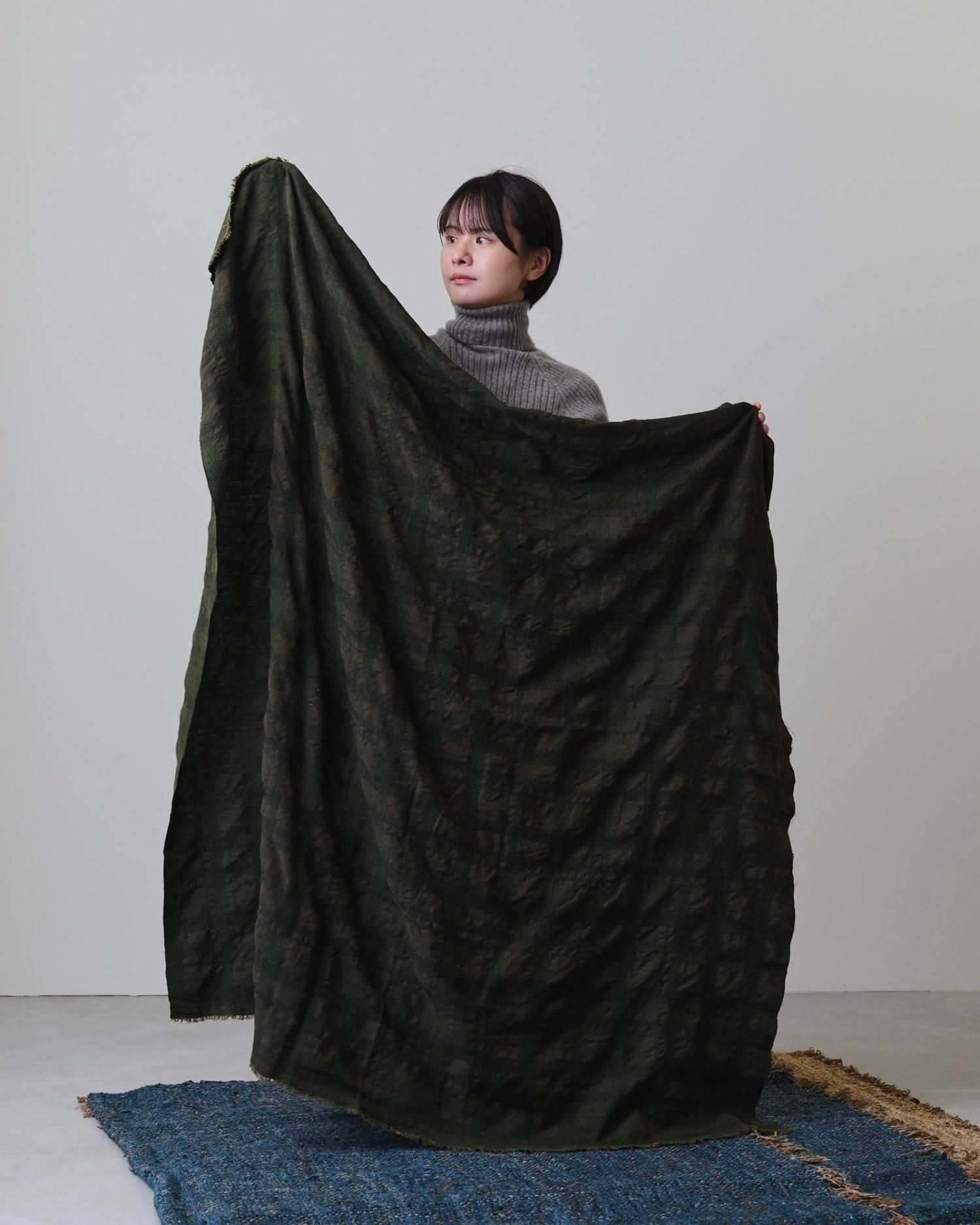 大判サイズのストールは、肩から掛けたり、首元に巻いたり、応用範囲の広さが魅力。