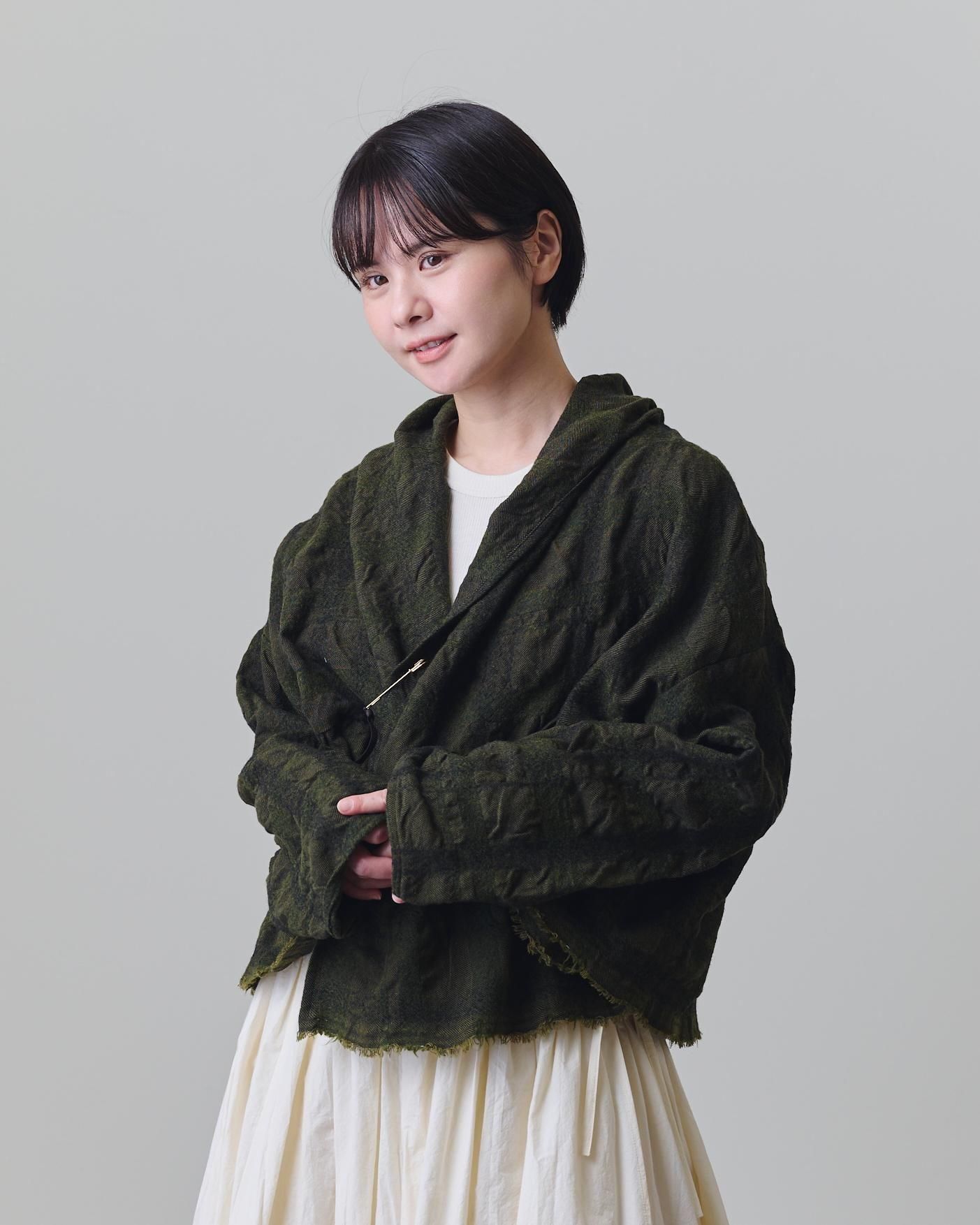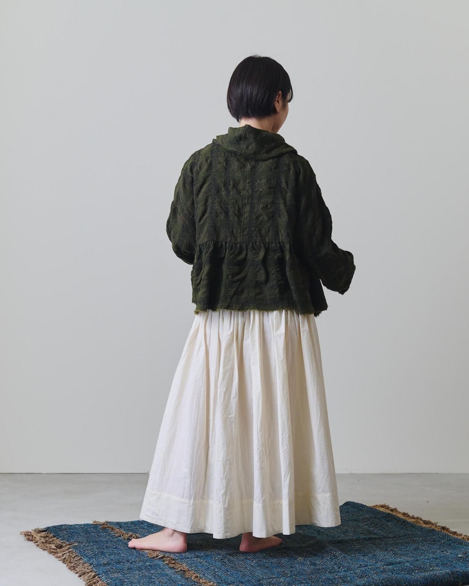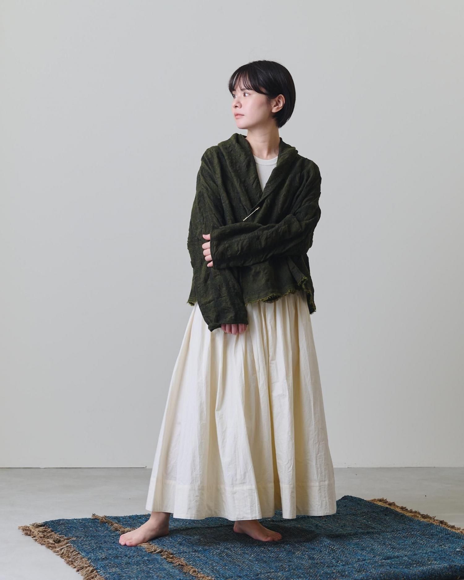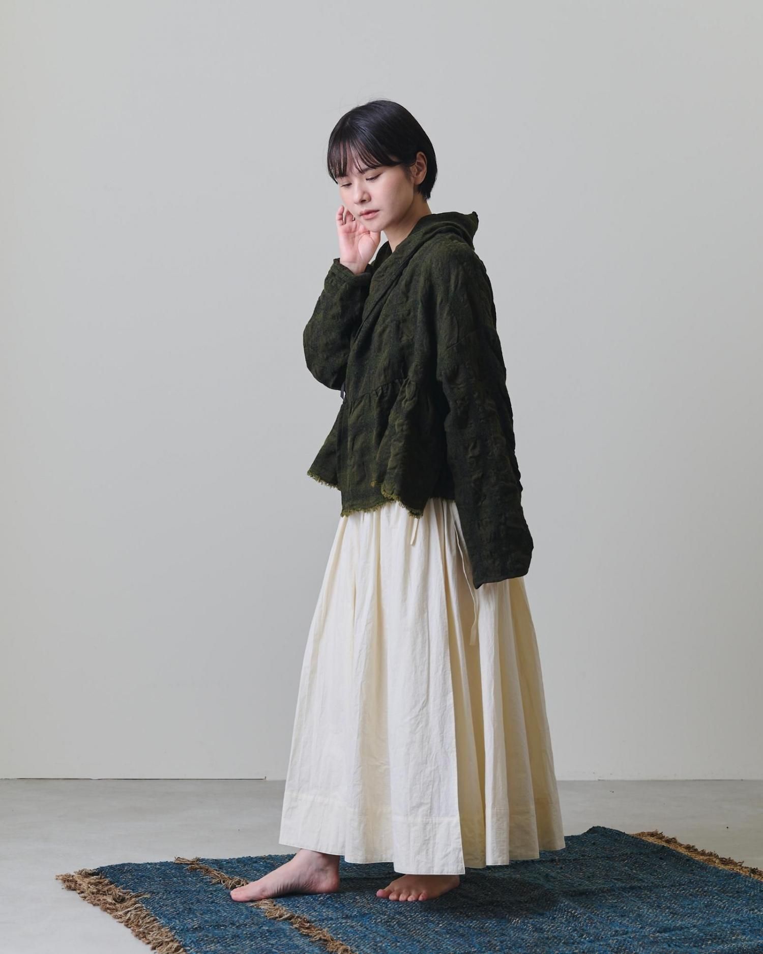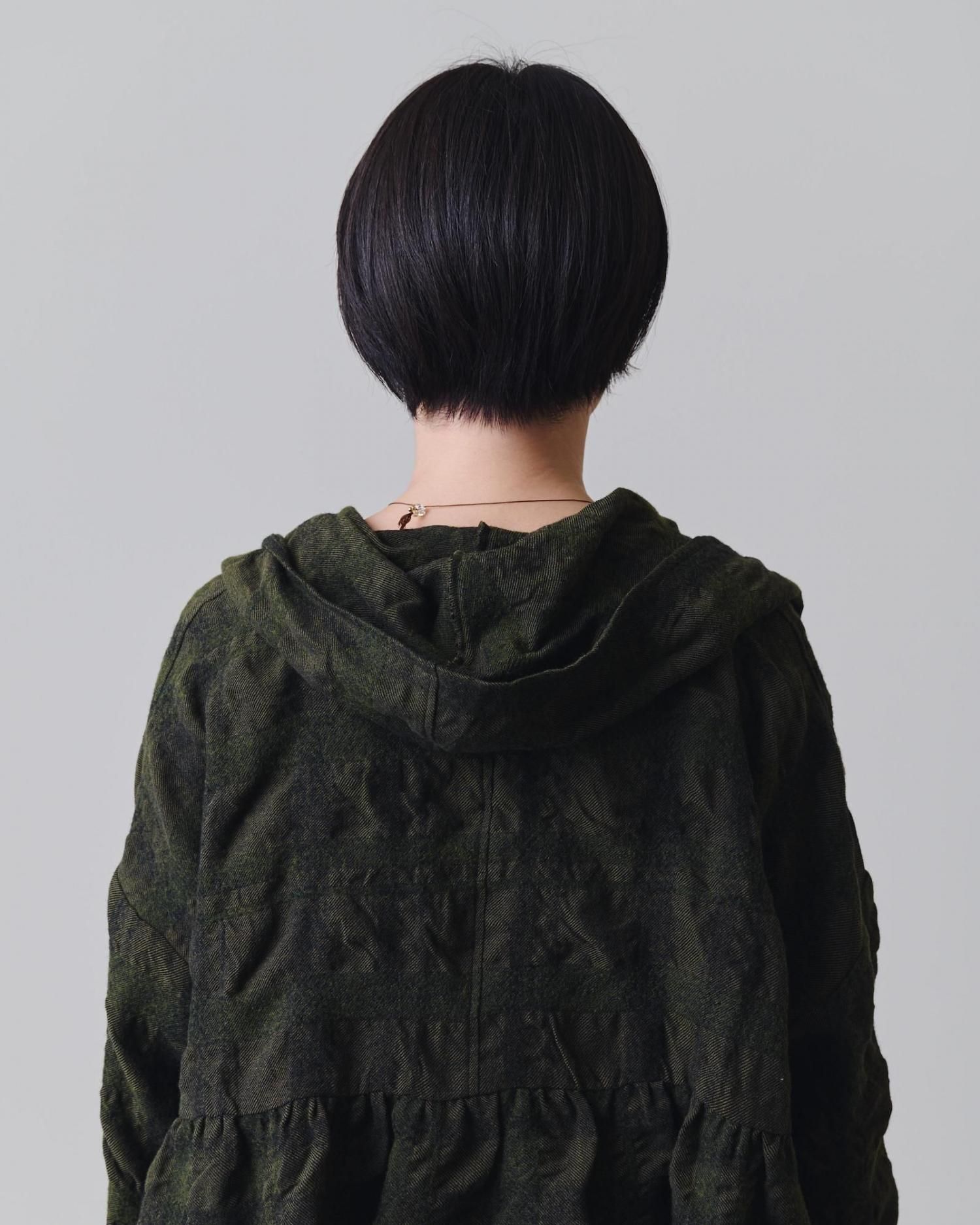 そんな生地で仕立てたのは、切替部分に入れたギャザーと、フードのようにアレンジできる襟が魅力のカーディガンです。