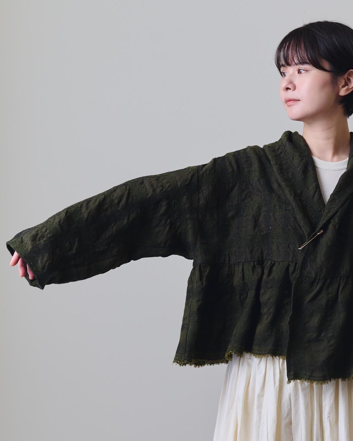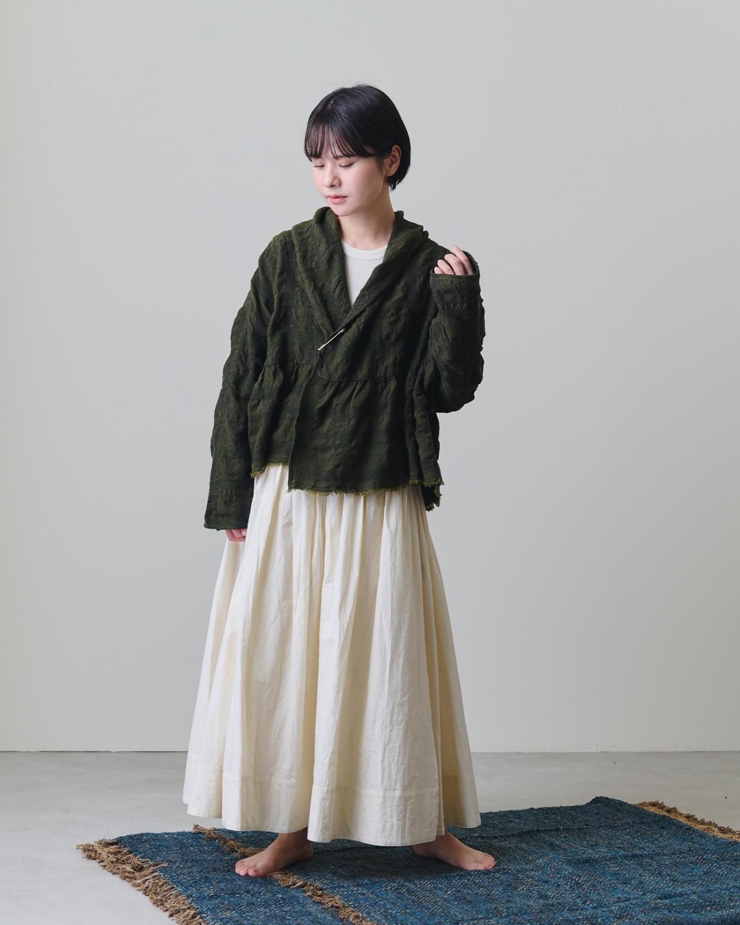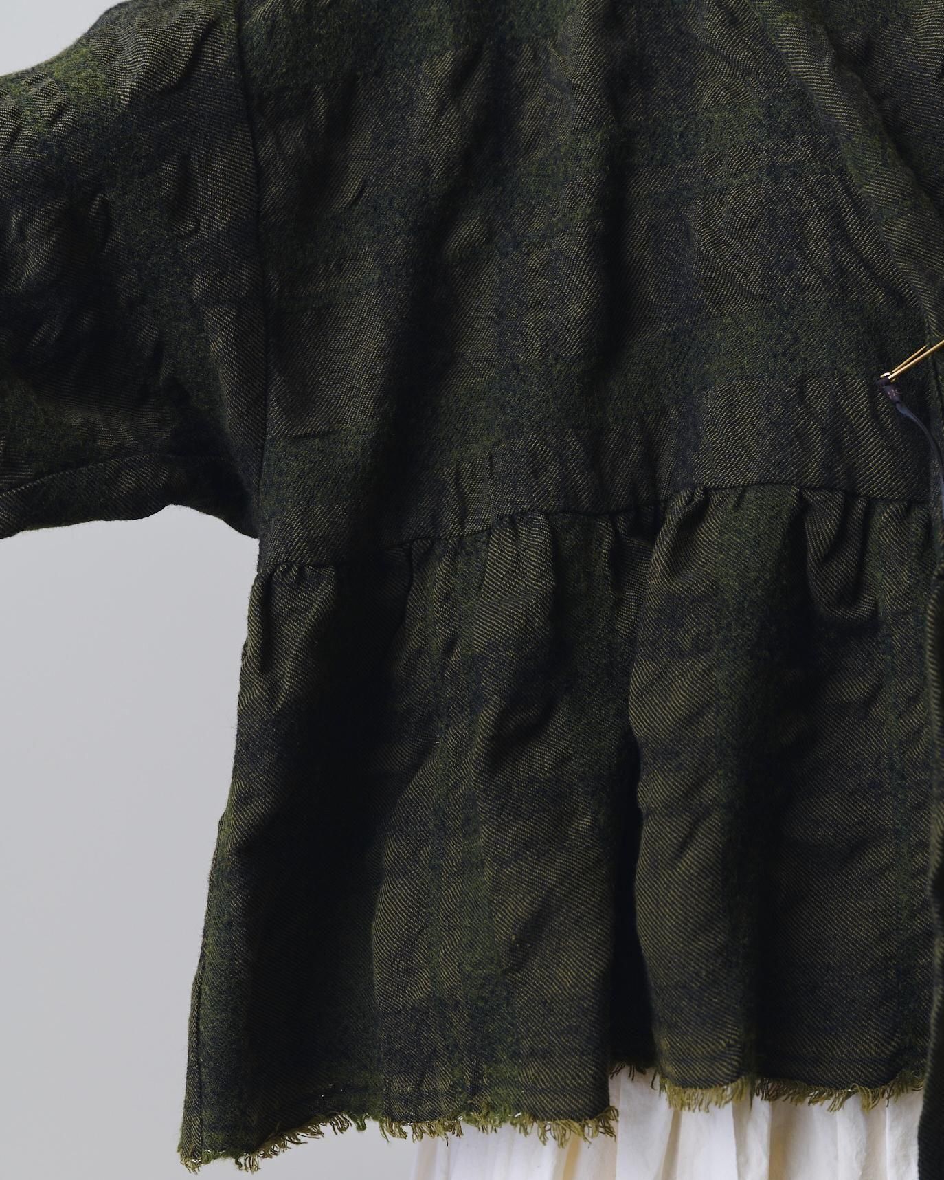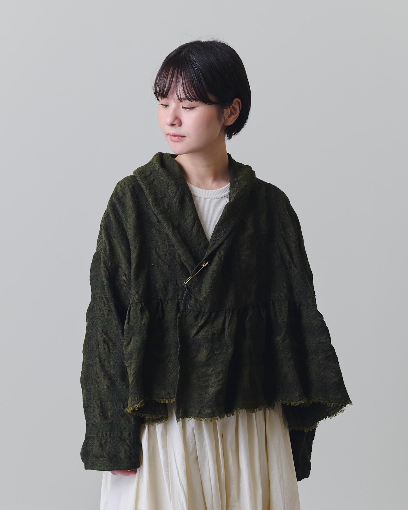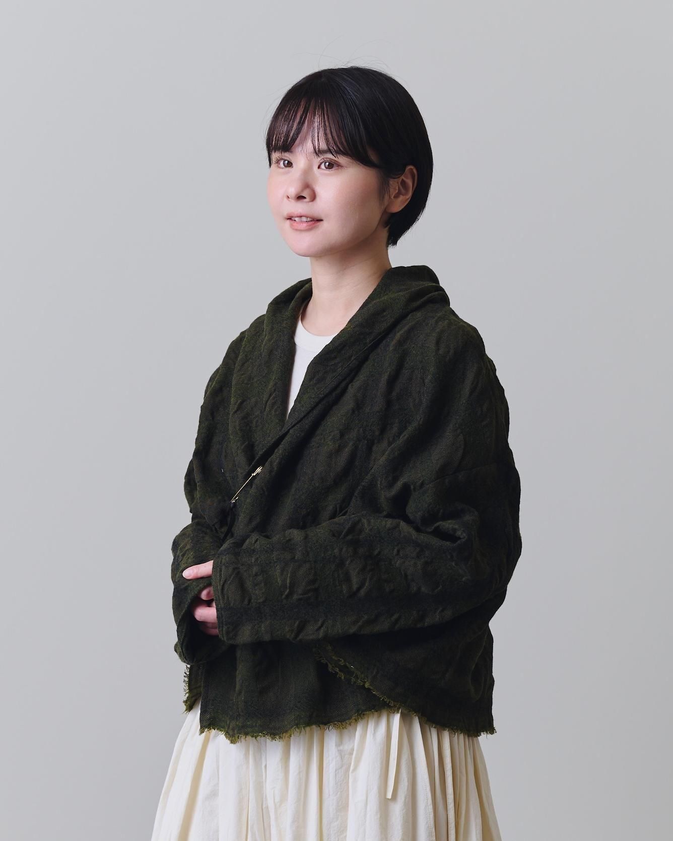 そんな生地で仕立てたのは、切替部分に入れたギャザーと、フードのようにアレンジできる襟が魅力のカーディガンです。