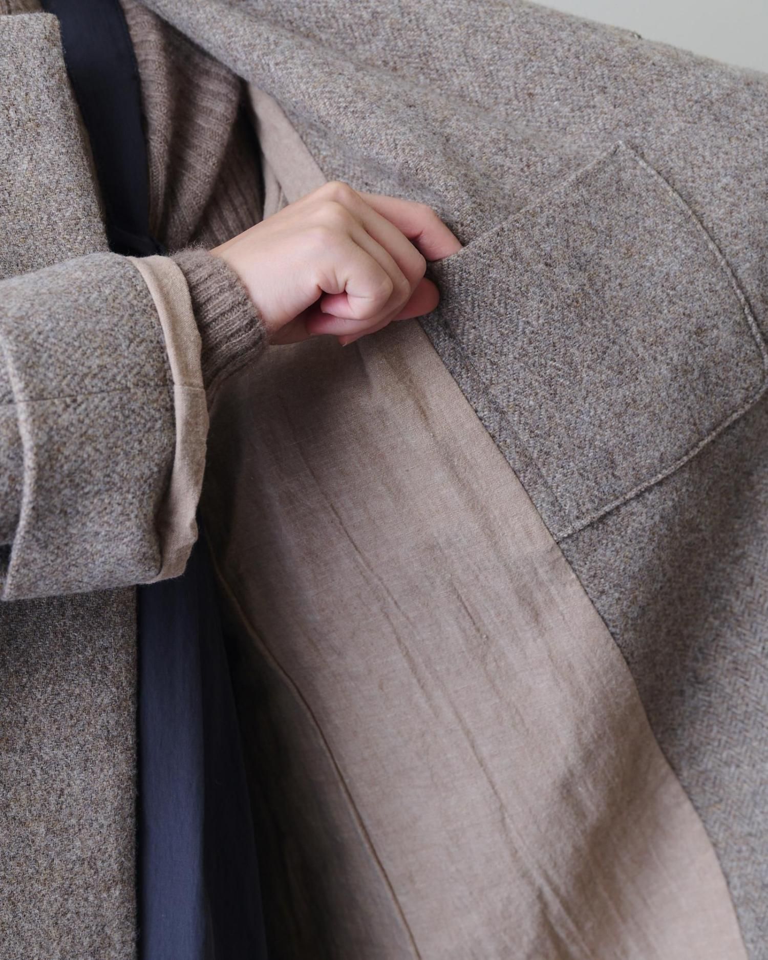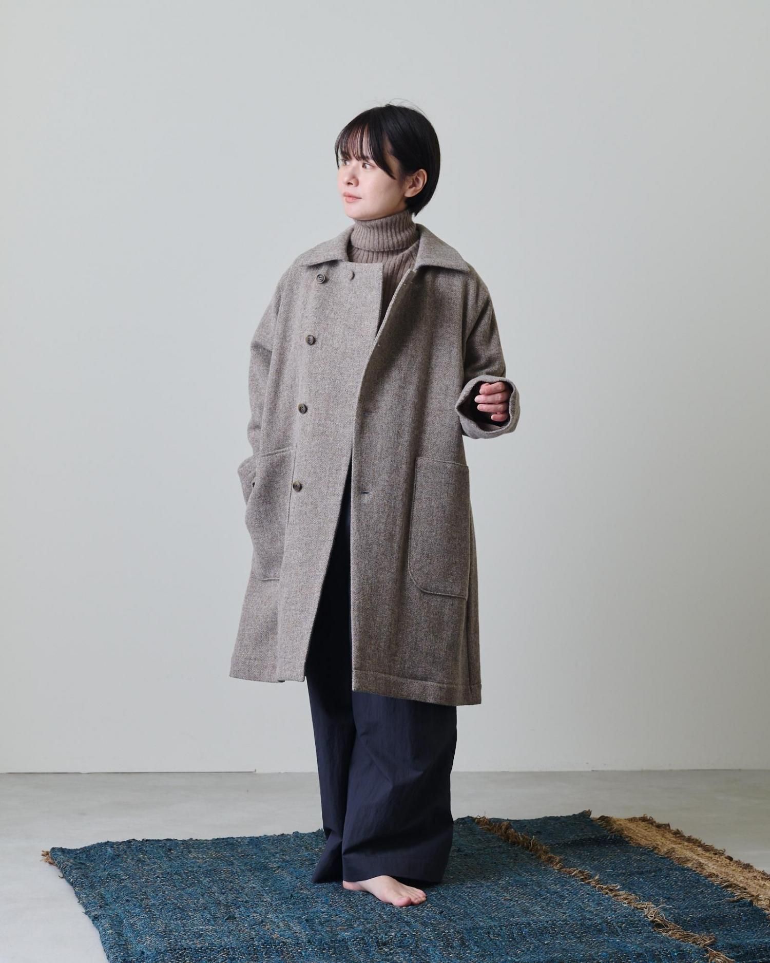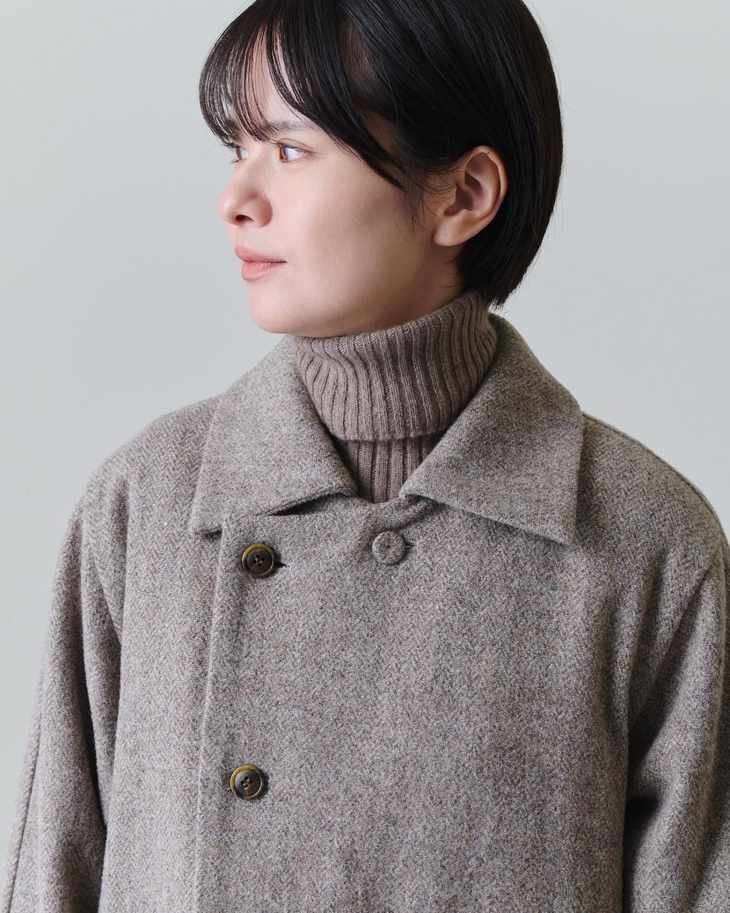 クラシカルな雰囲気のヘリンボーン柄のツィード生地で仕立てたコートは、飽きずに長く愛用できる一着になること間違いなしです。