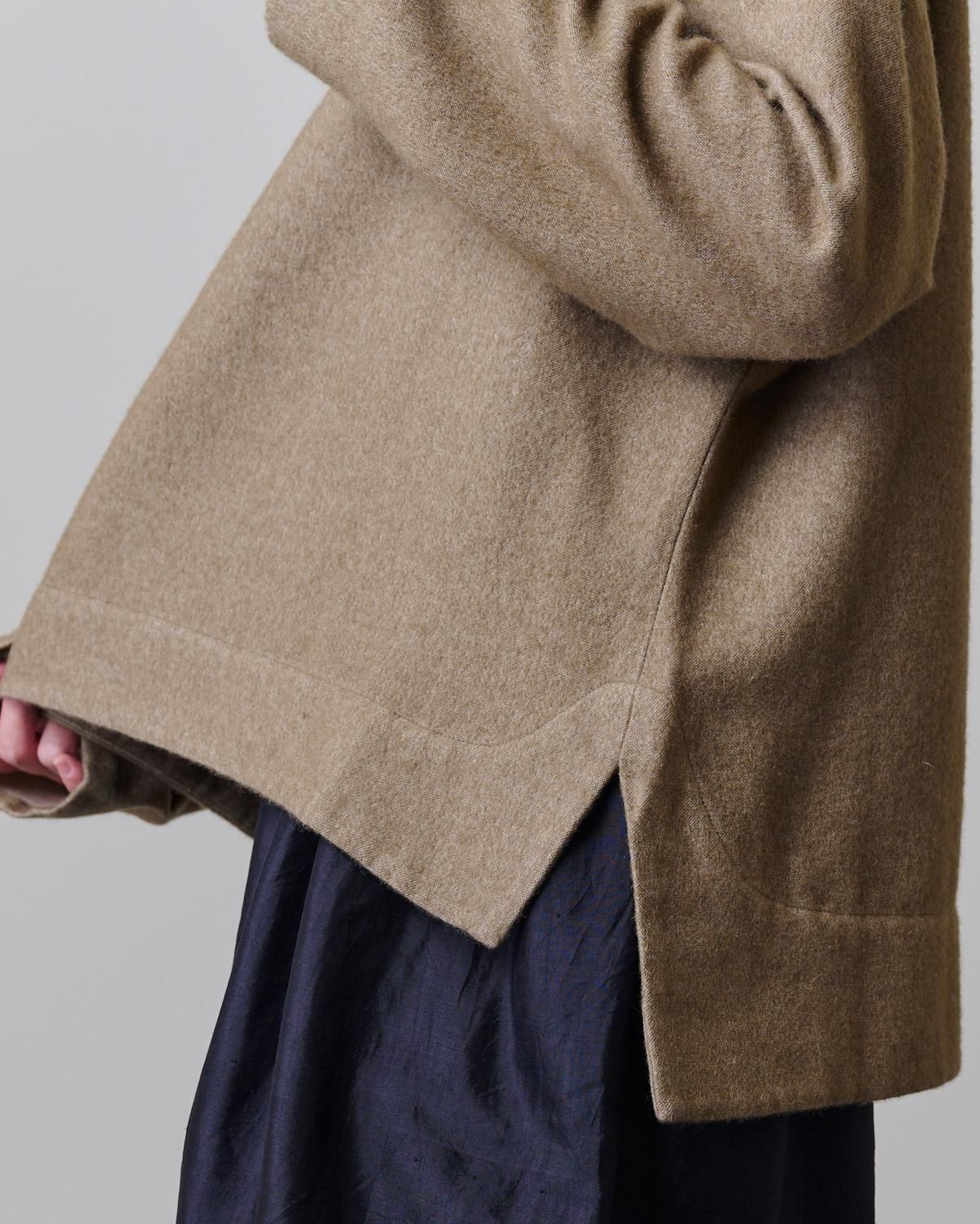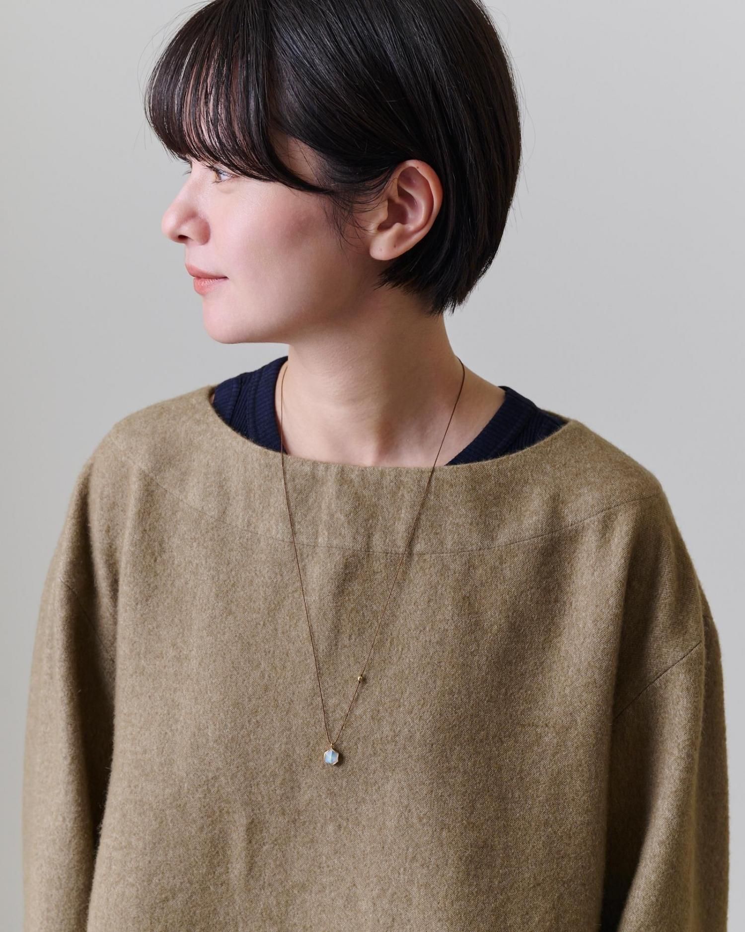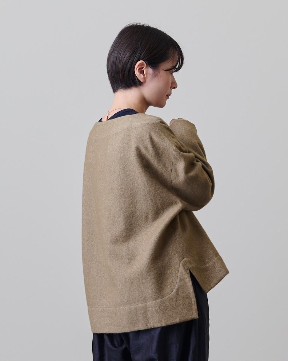 襟ぐりを少し広めのボートネックにし、後ろの着丈を一段落とすなど、COZY(居心地の良い、リラックスした)というデザインテーマにぴったりの、シンプルながらもこだわりの詰まった一枚です。
