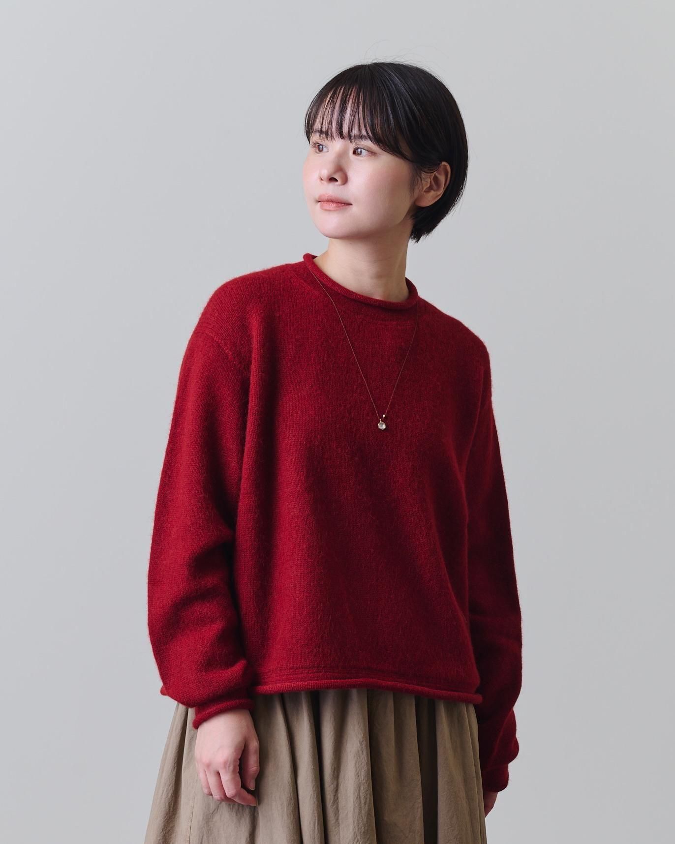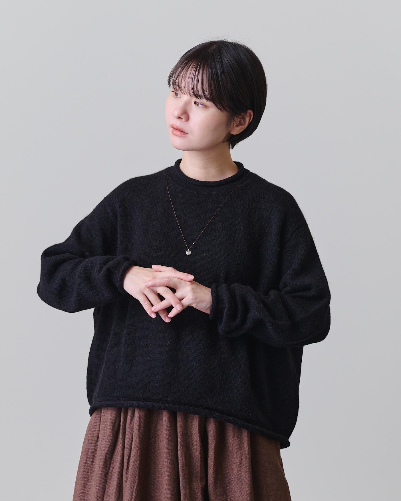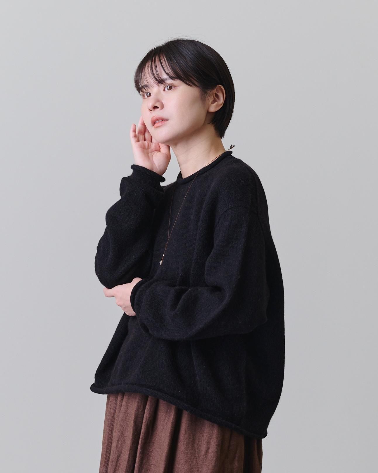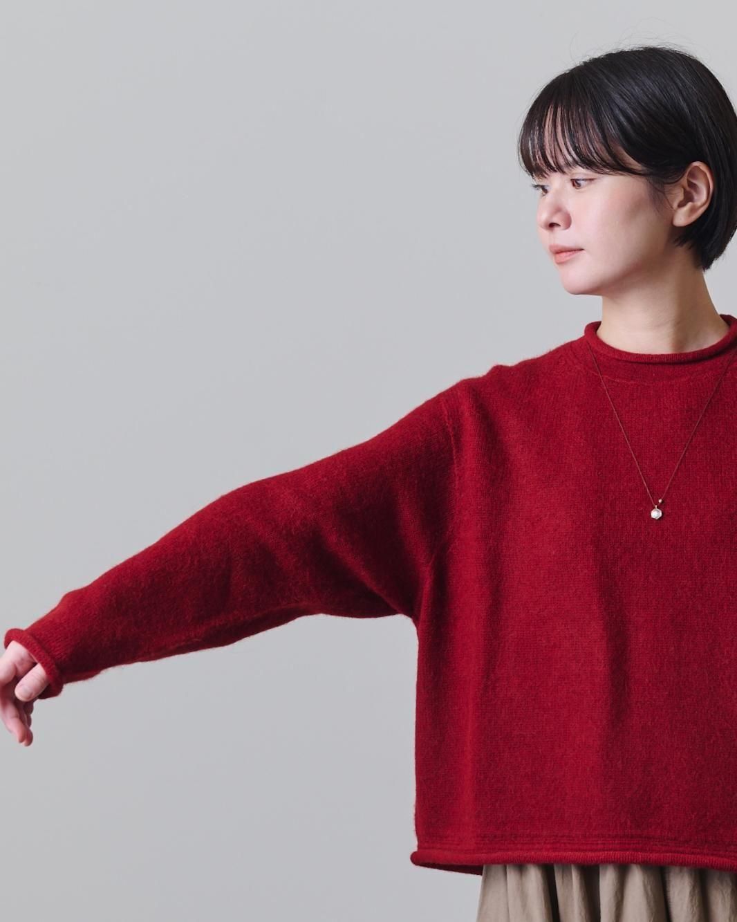 そんなキャメルで編み上げたのは、ロールさせた襟ぐり、裾、袖口がポイントのプルオーバーニット。