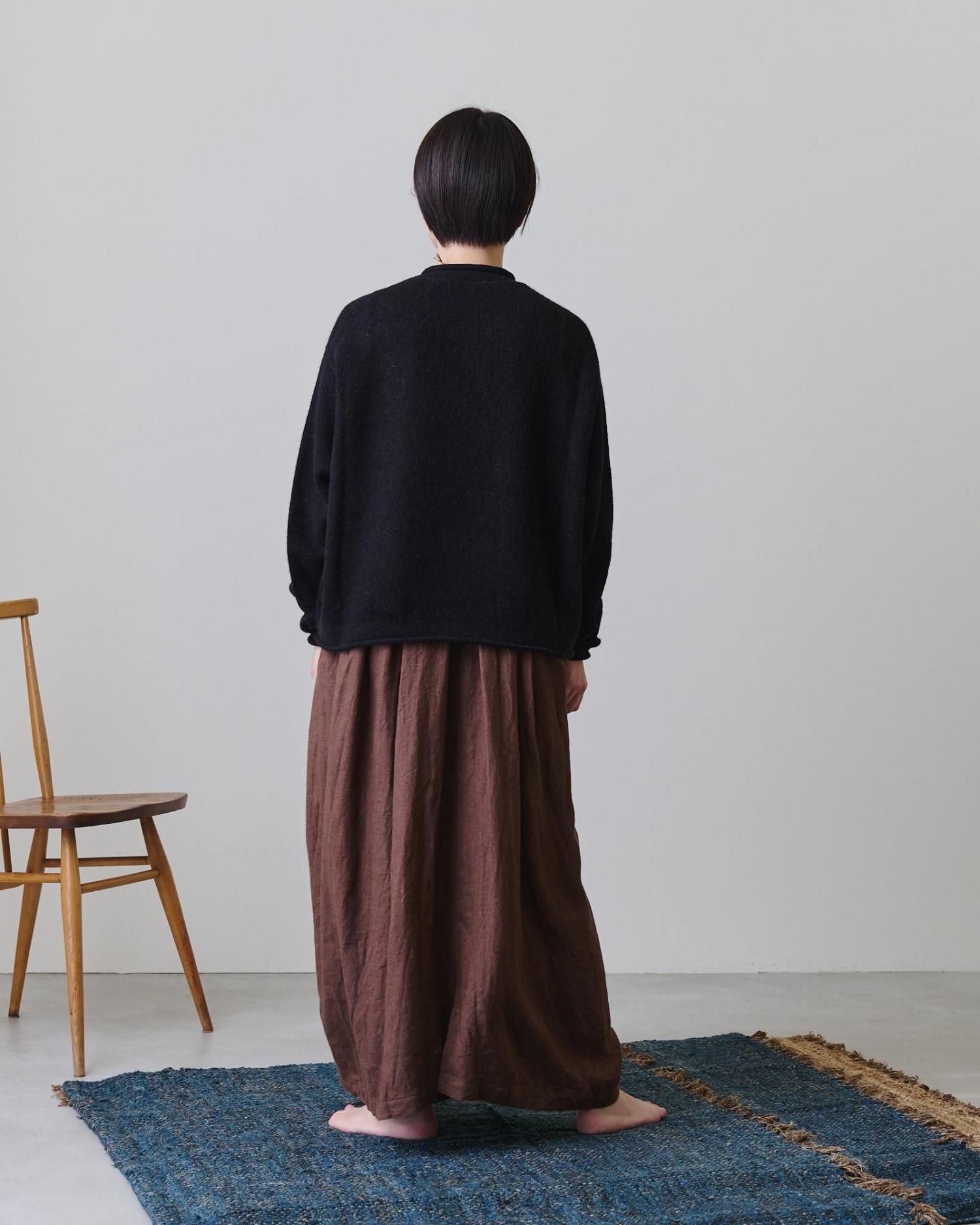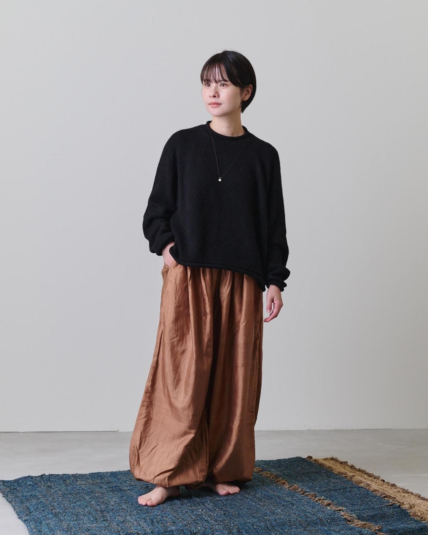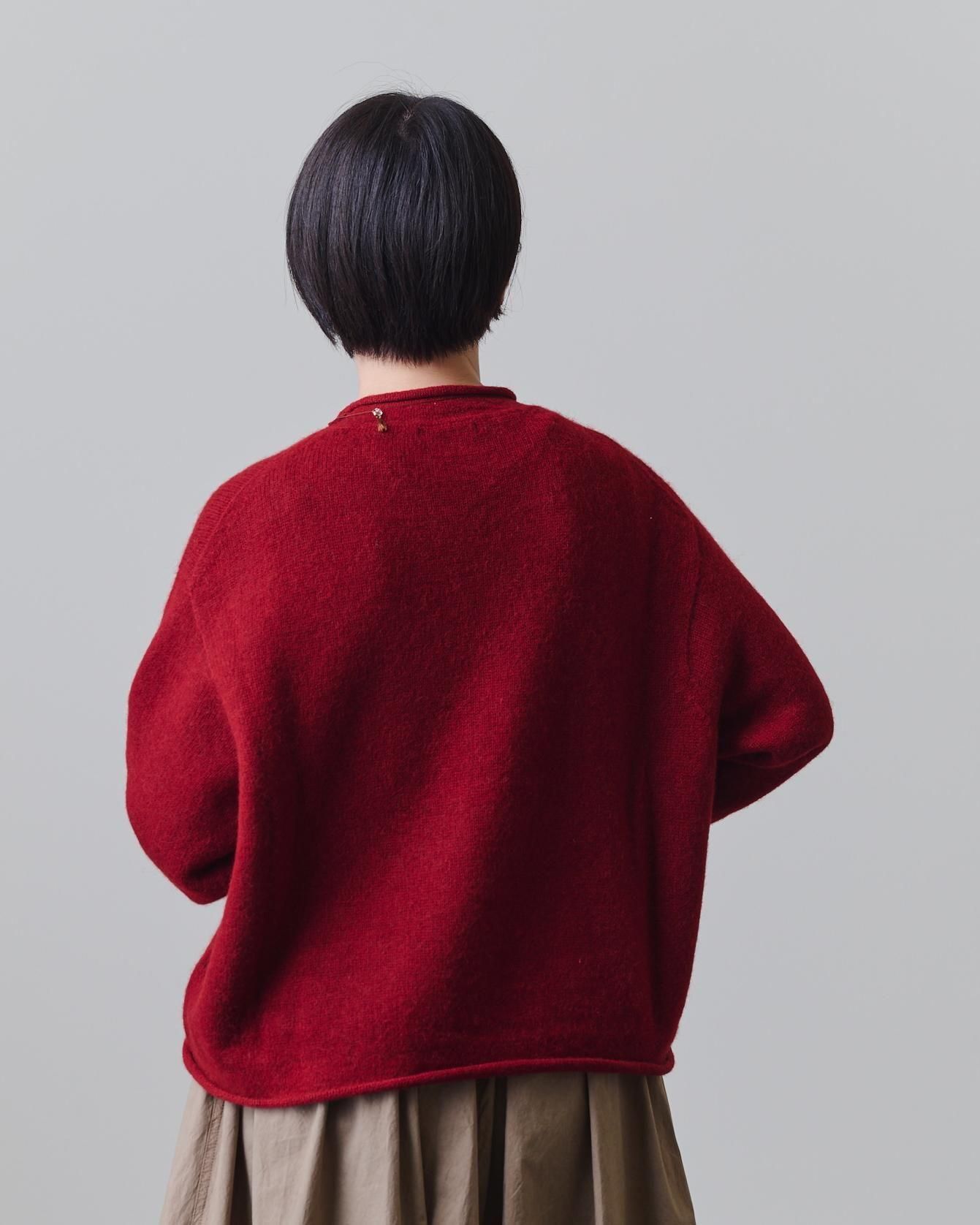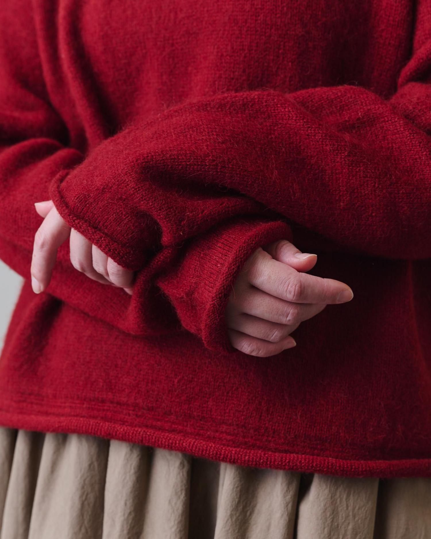 そんなキャメルで編み上げたのは、ロールさせた襟ぐり、裾、袖口がポイントのプルオーバーニット。