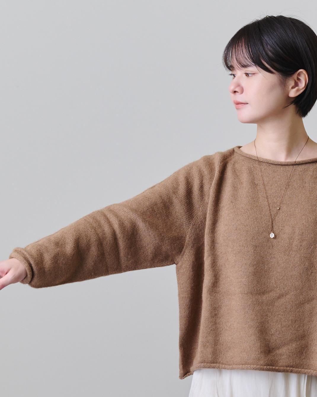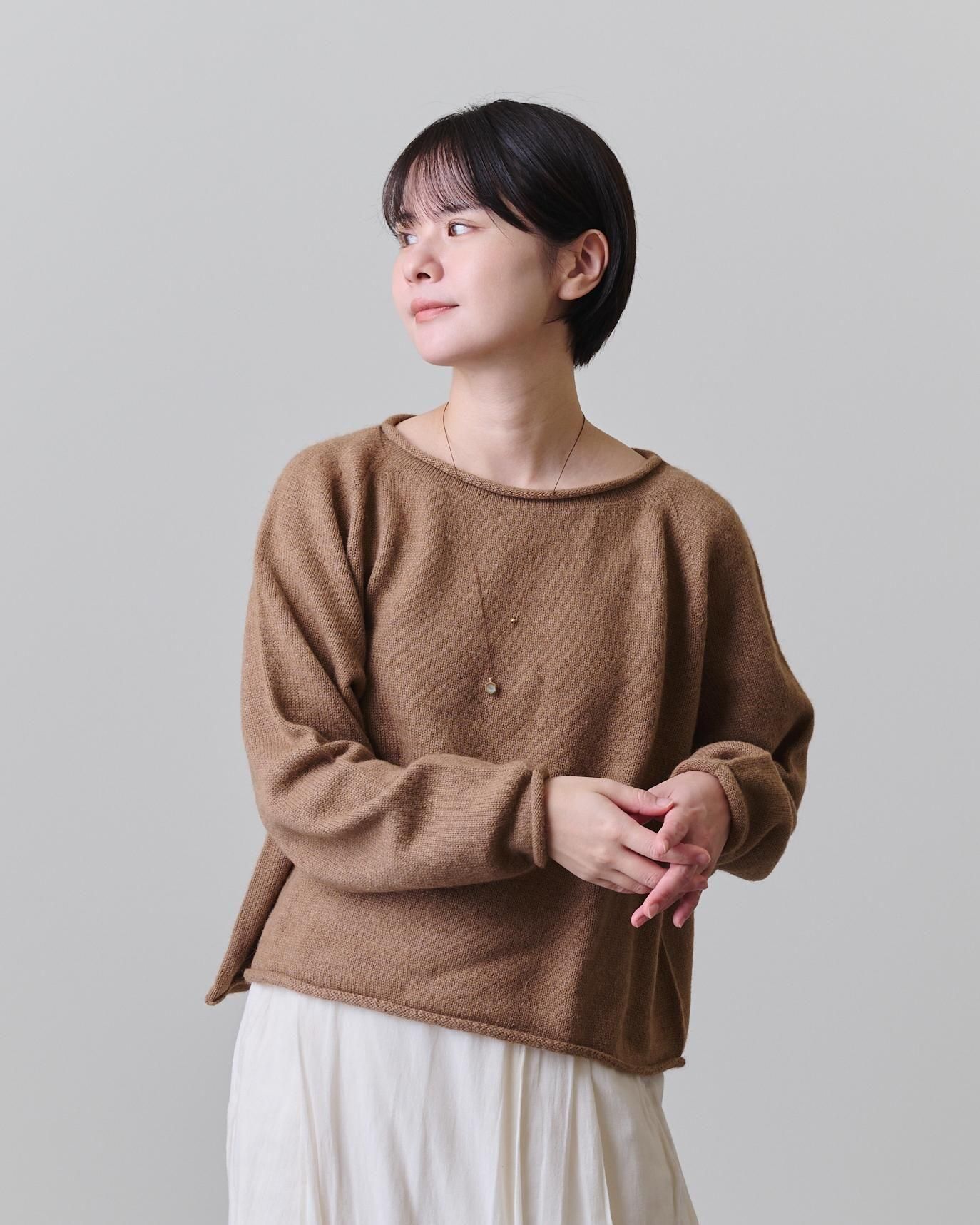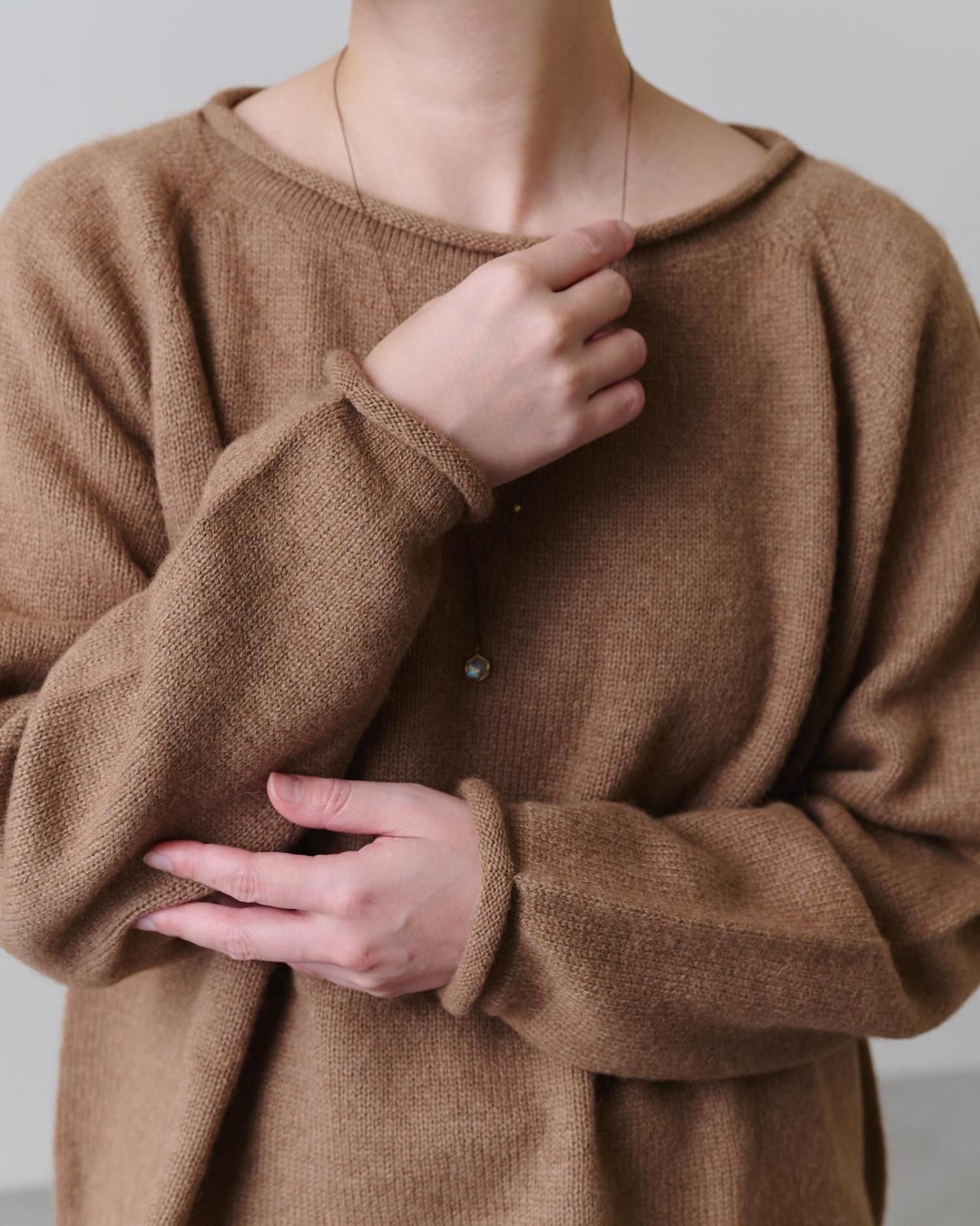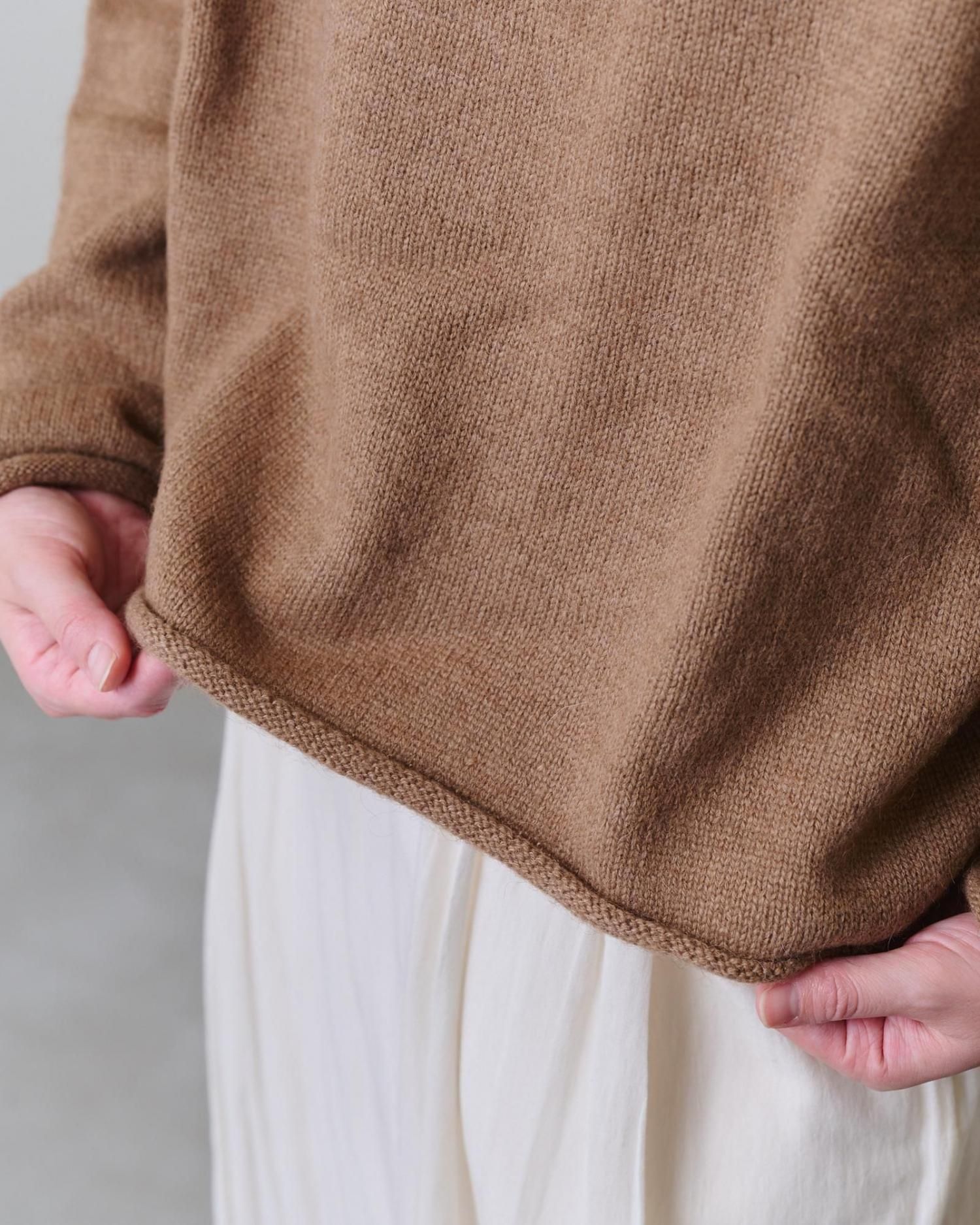 そんなキャメルで編み上げたのは、少し広めのロールネックが女性らしいプルオーバーニット。