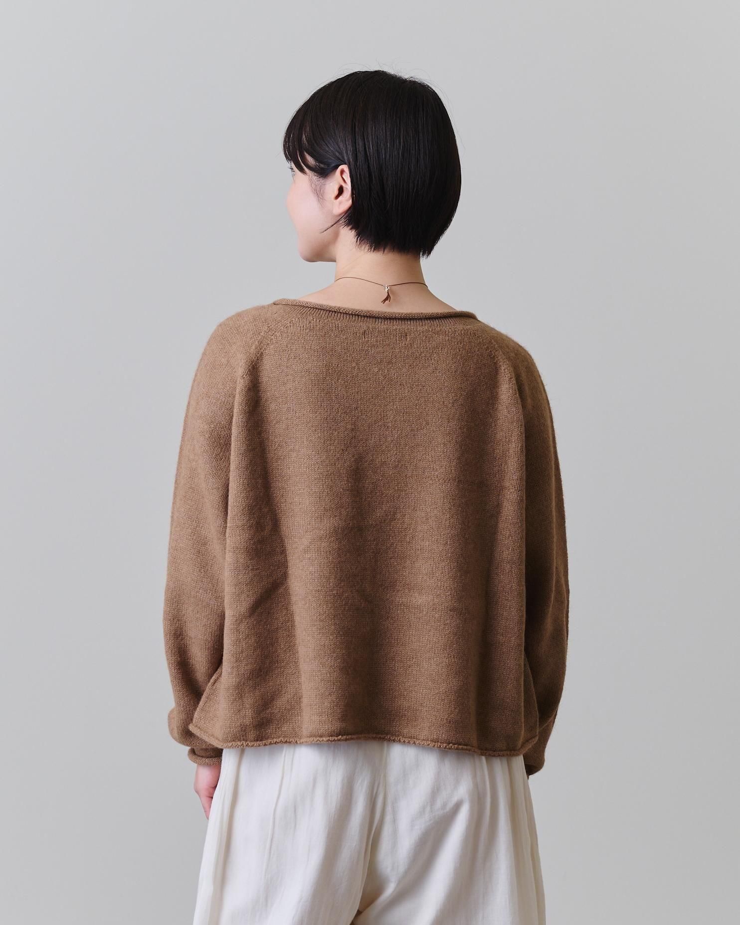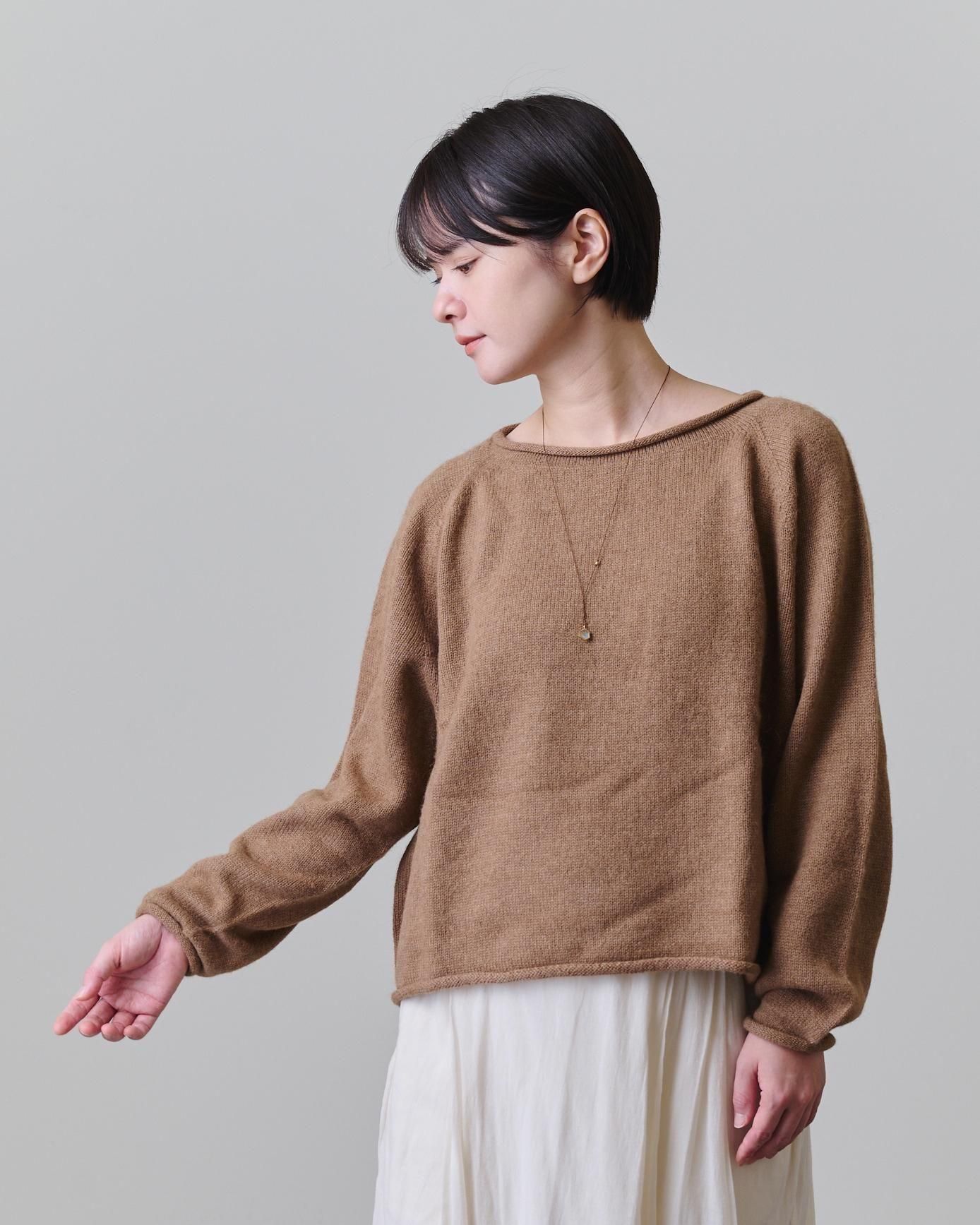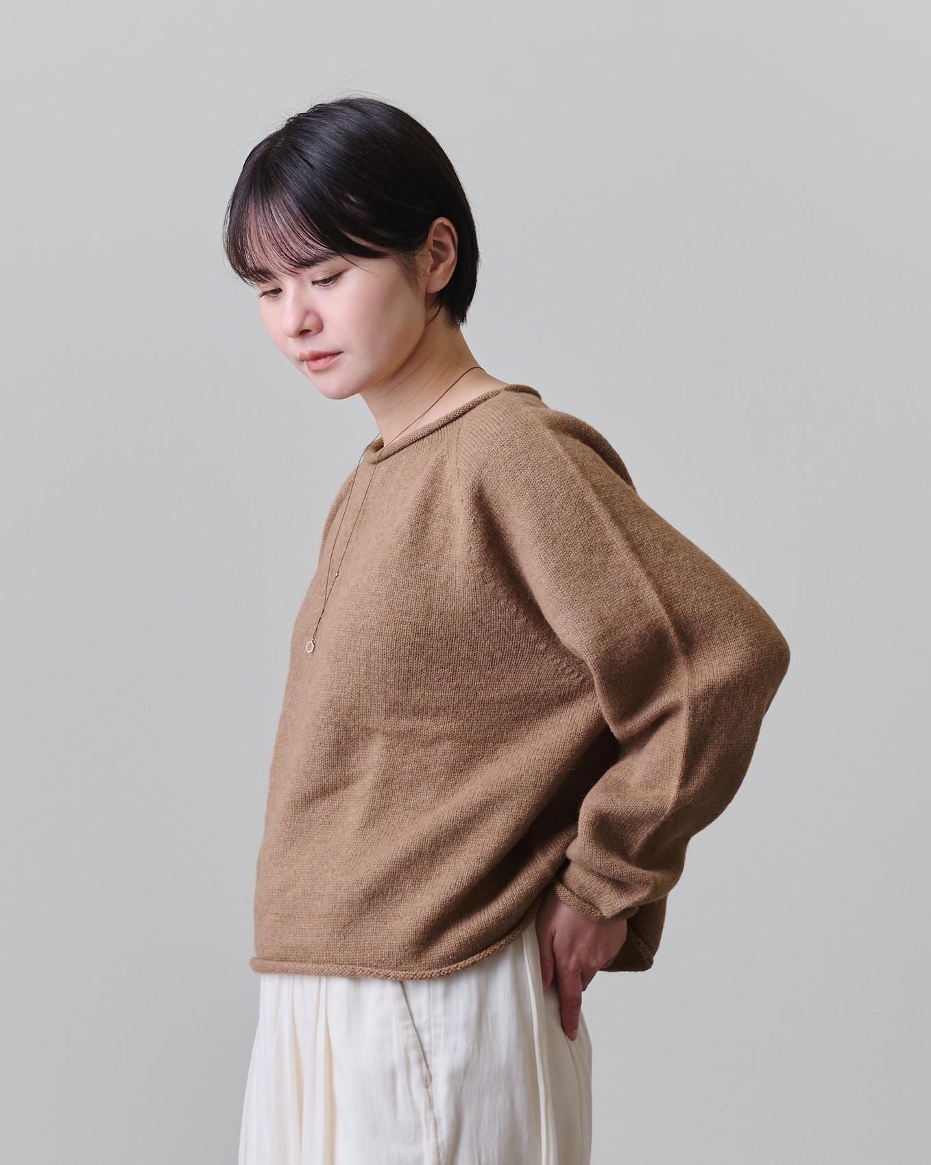 そんなキャメルで編み上げたのは、少し広めのロールネックが女性らしいプルオーバーニット。