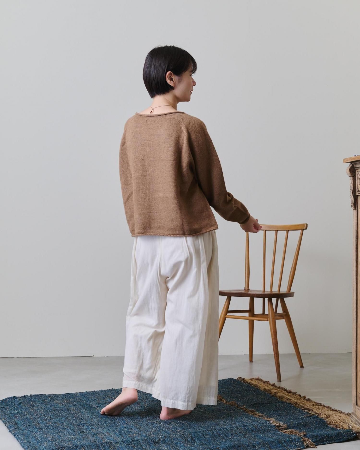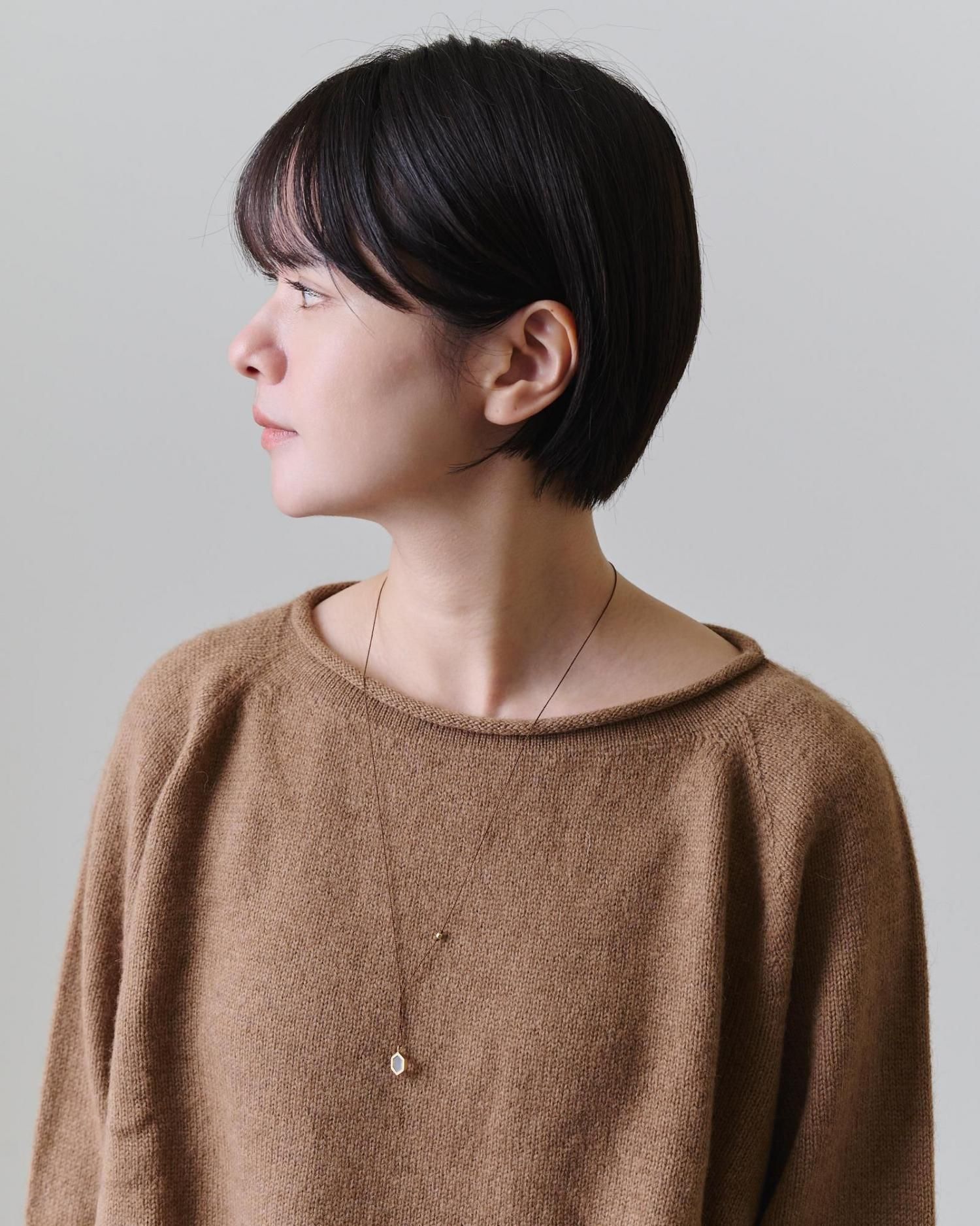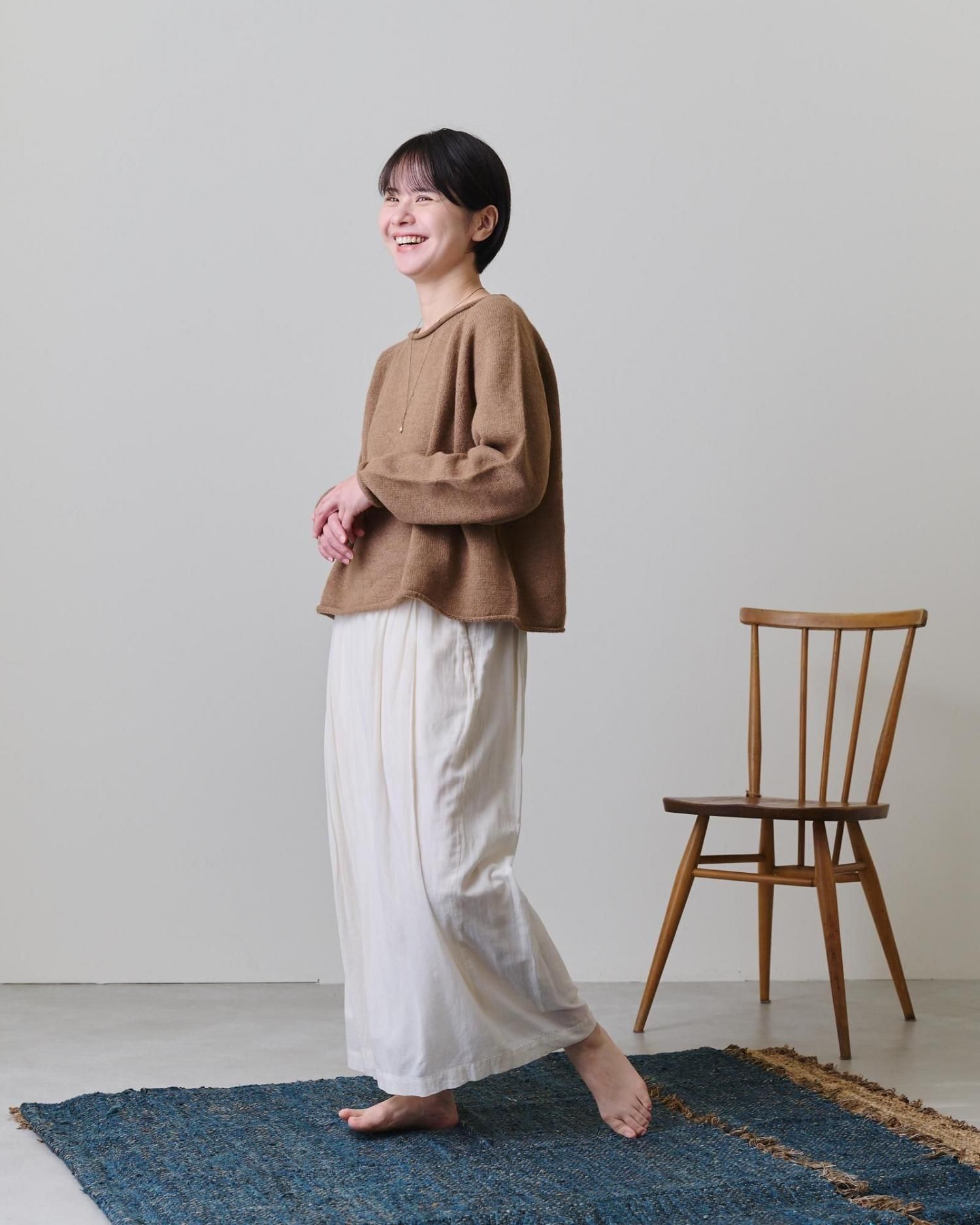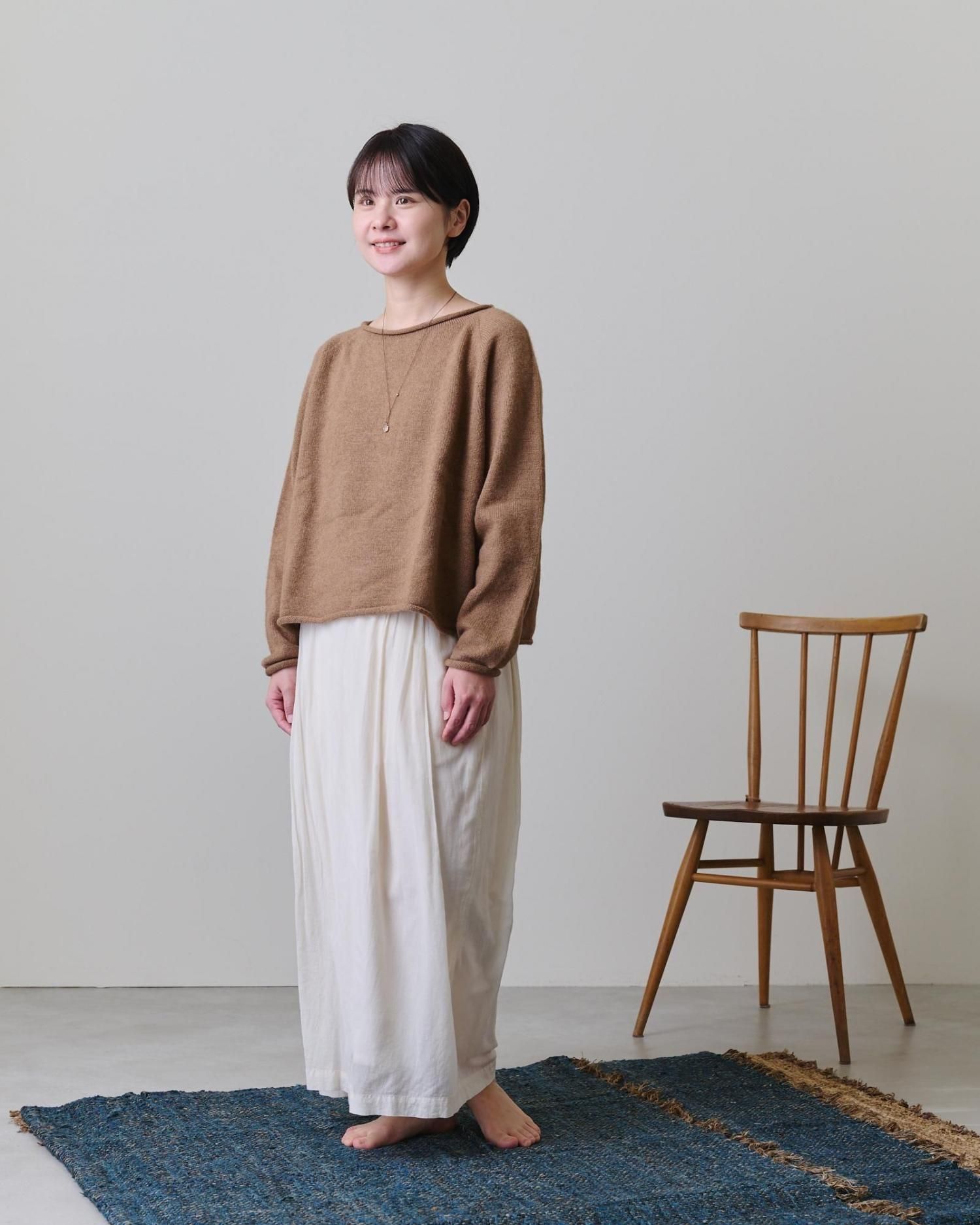 そんなキャメルで編み上げたのは、少し広めのロールネックが女性らしいプルオーバーニット。