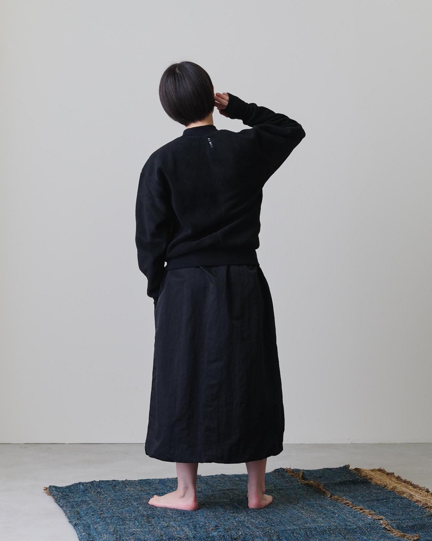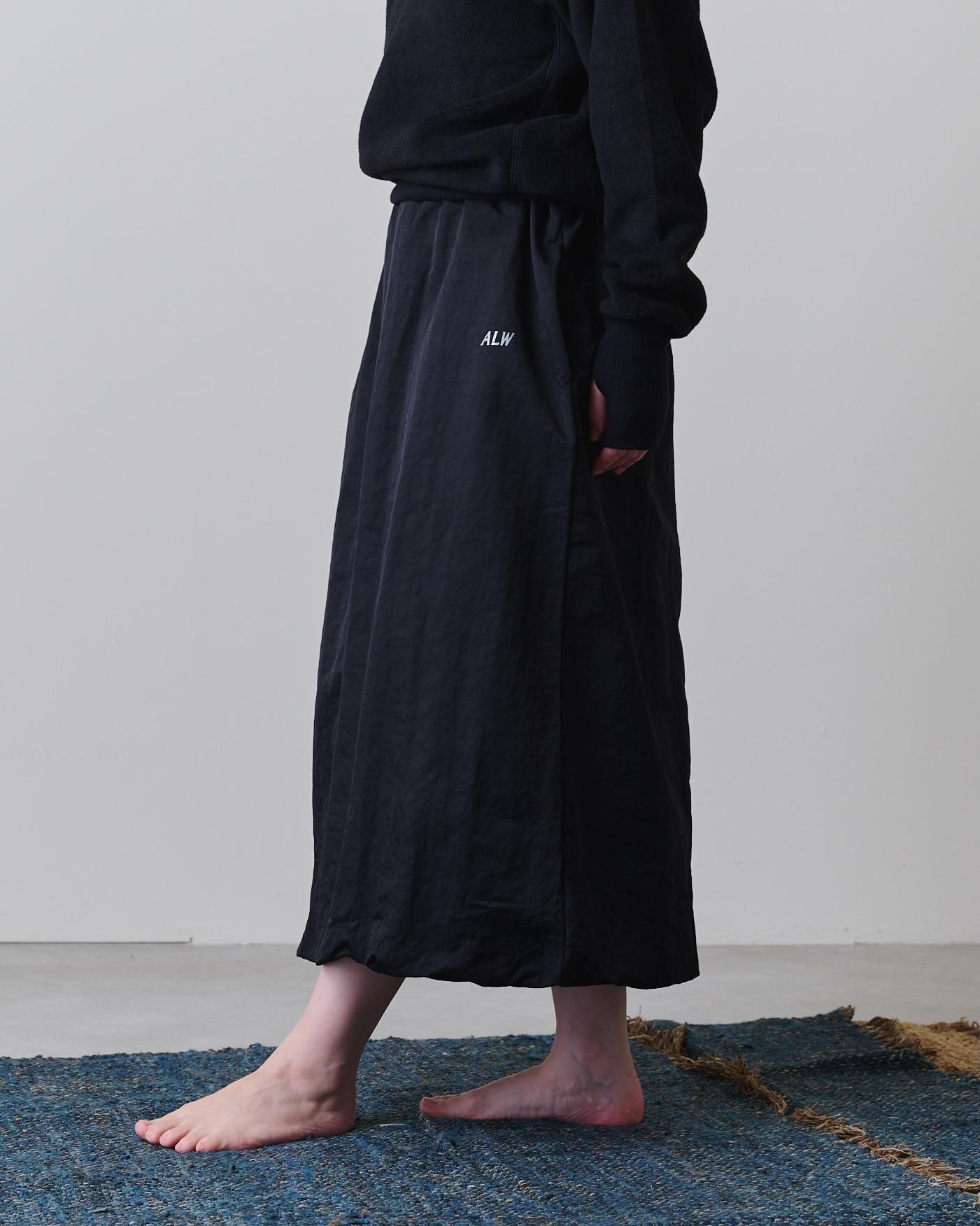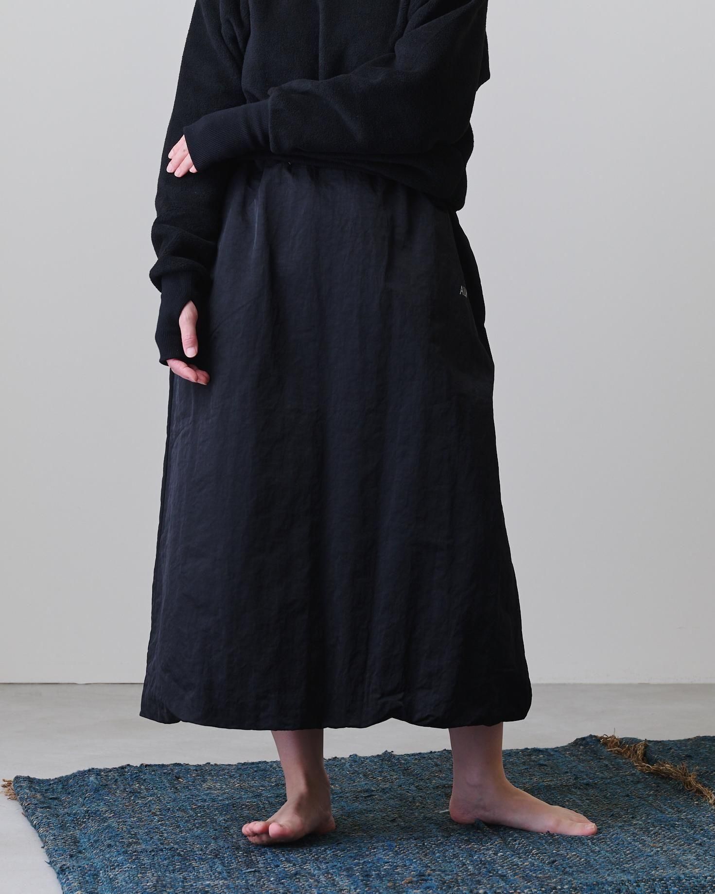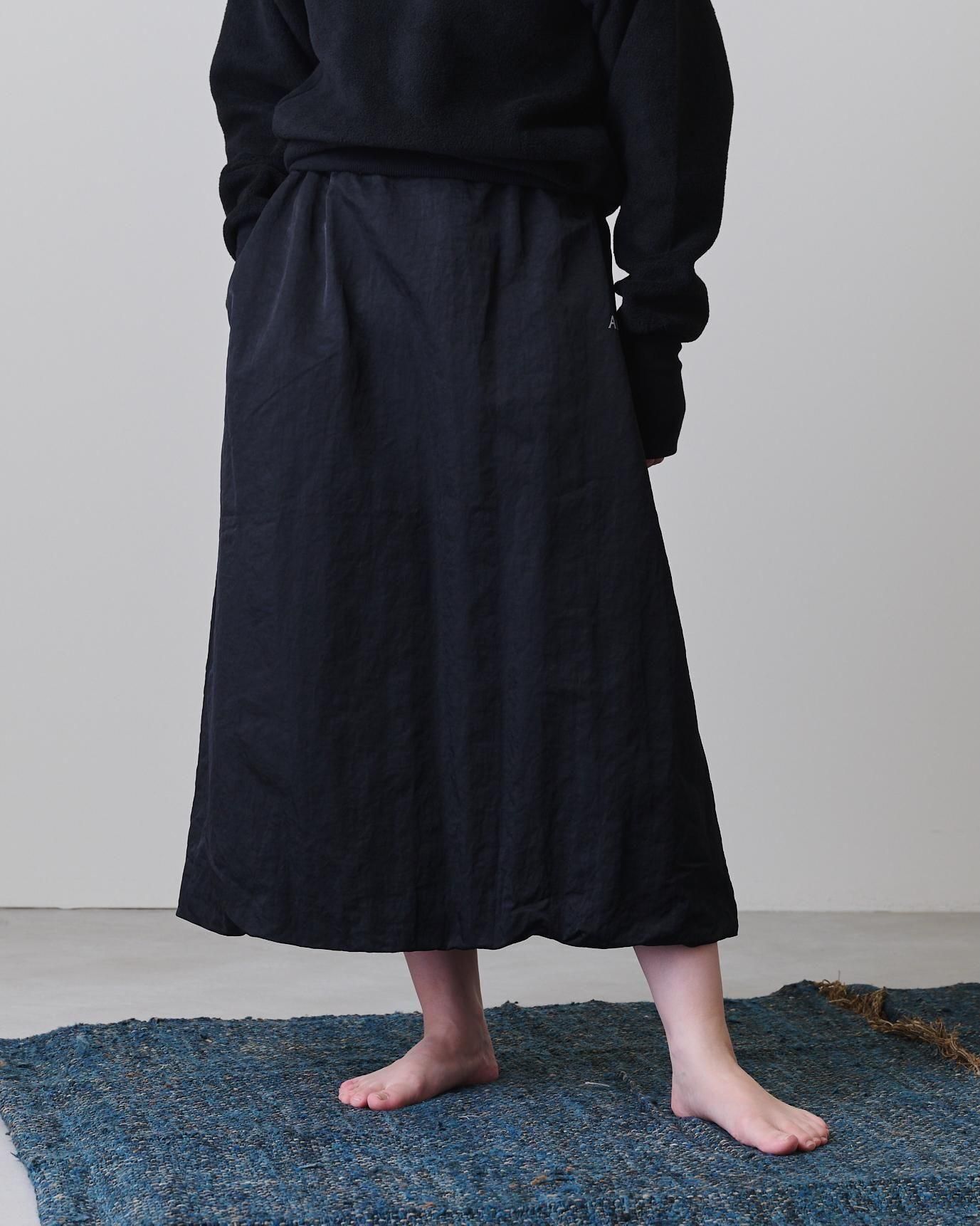 防水性を兼ね備えたナイロンツイル地で仕立てたスカートは、スポーティーな素材を用いながらも、ゆったり上品なシルエットに仕立てることでモード感のある大人の雰囲気に仕上げています。