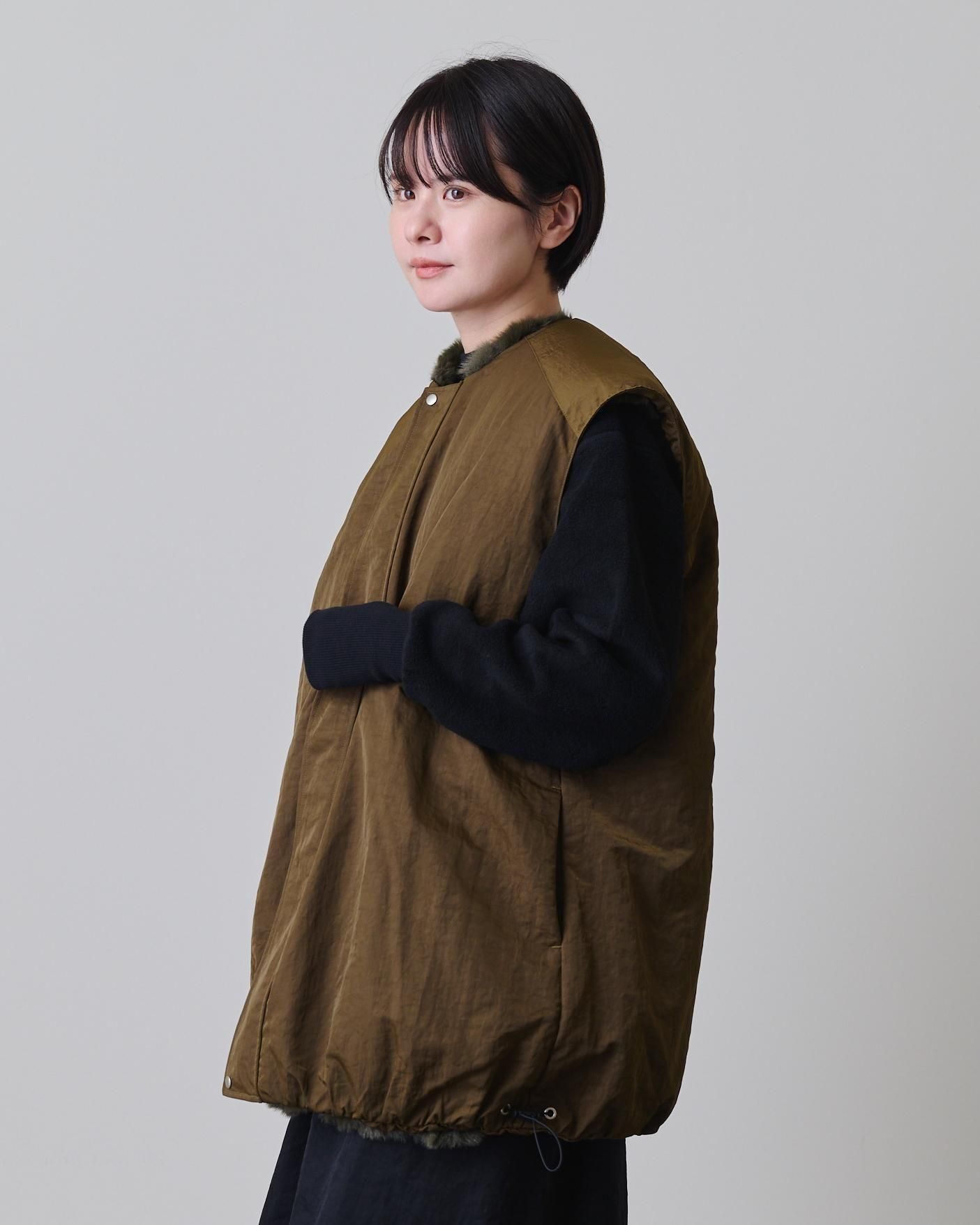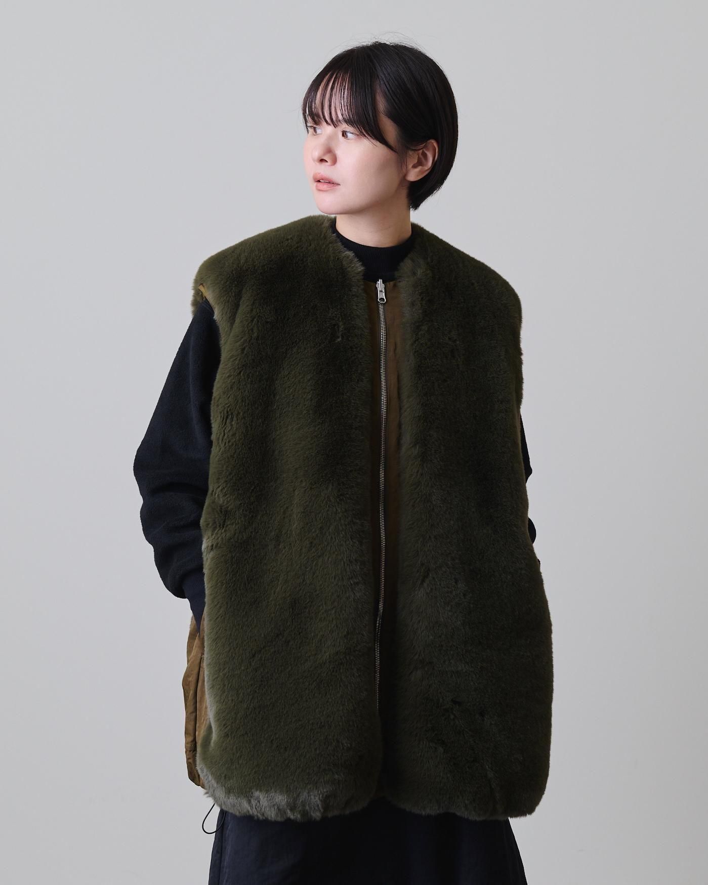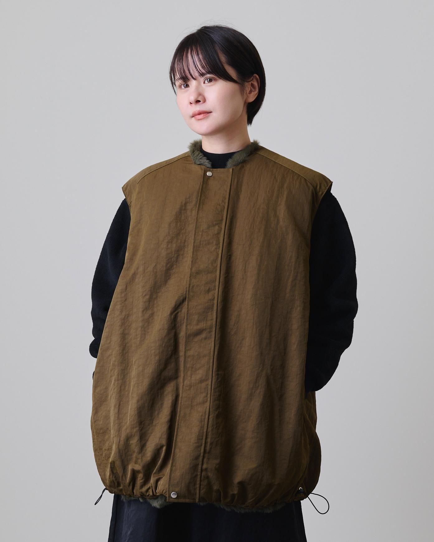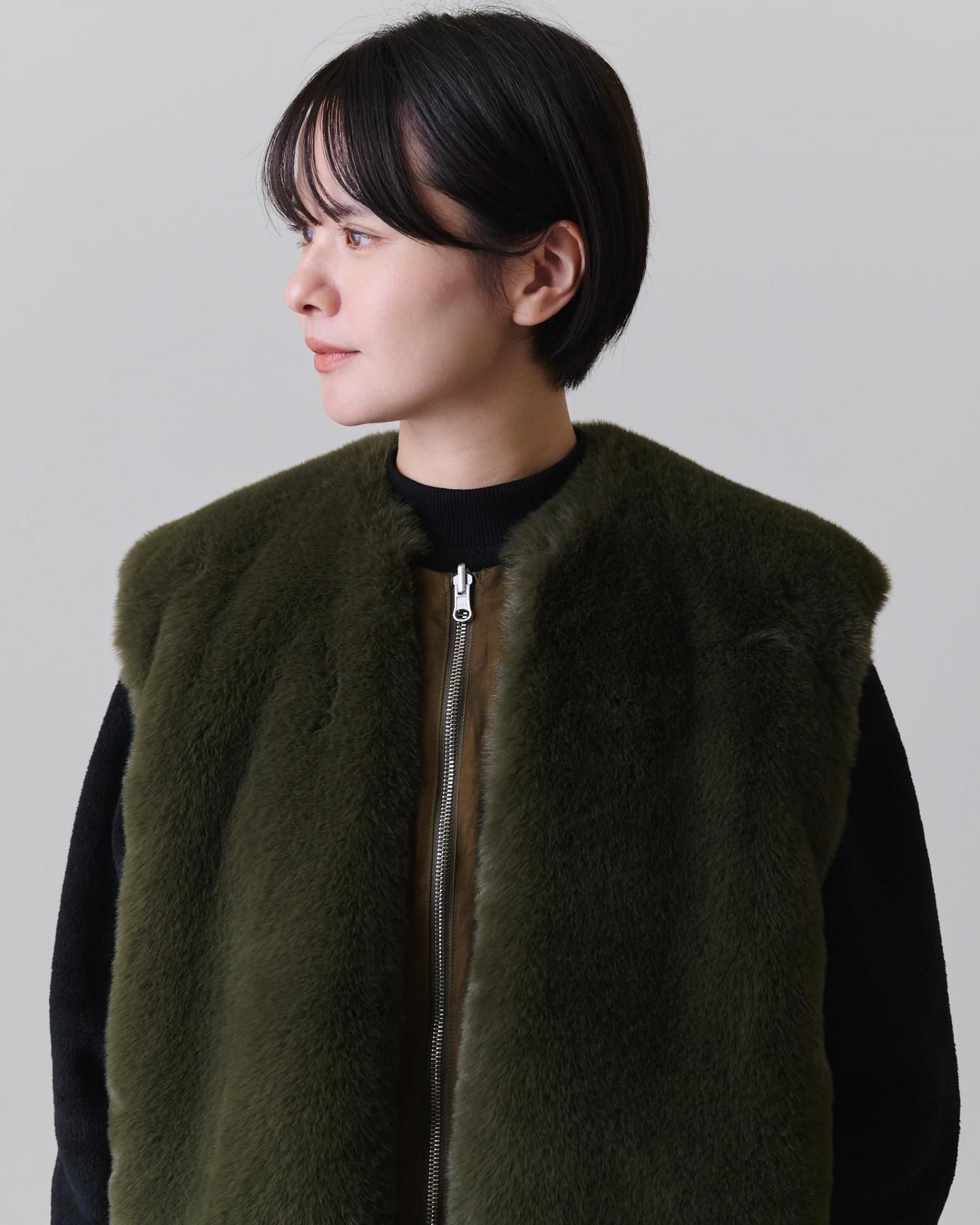 防水性を兼ね備えた耐久性のよいナイロンツイルとボリューミーなECOファーを組み合わせた異素材リバーシブルのスリーブレスジャケットです。