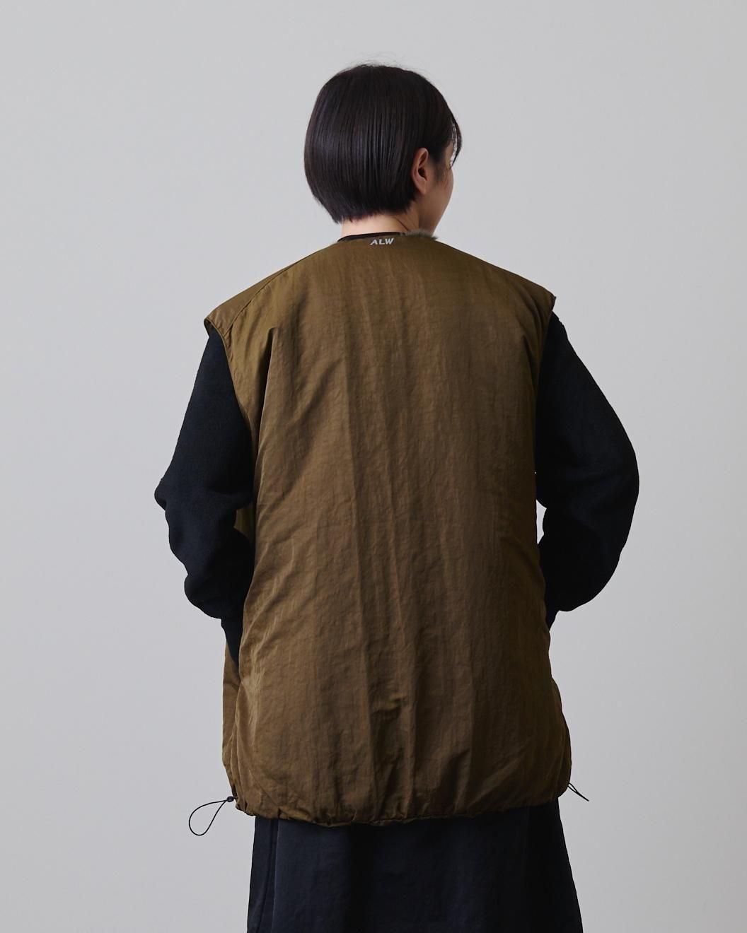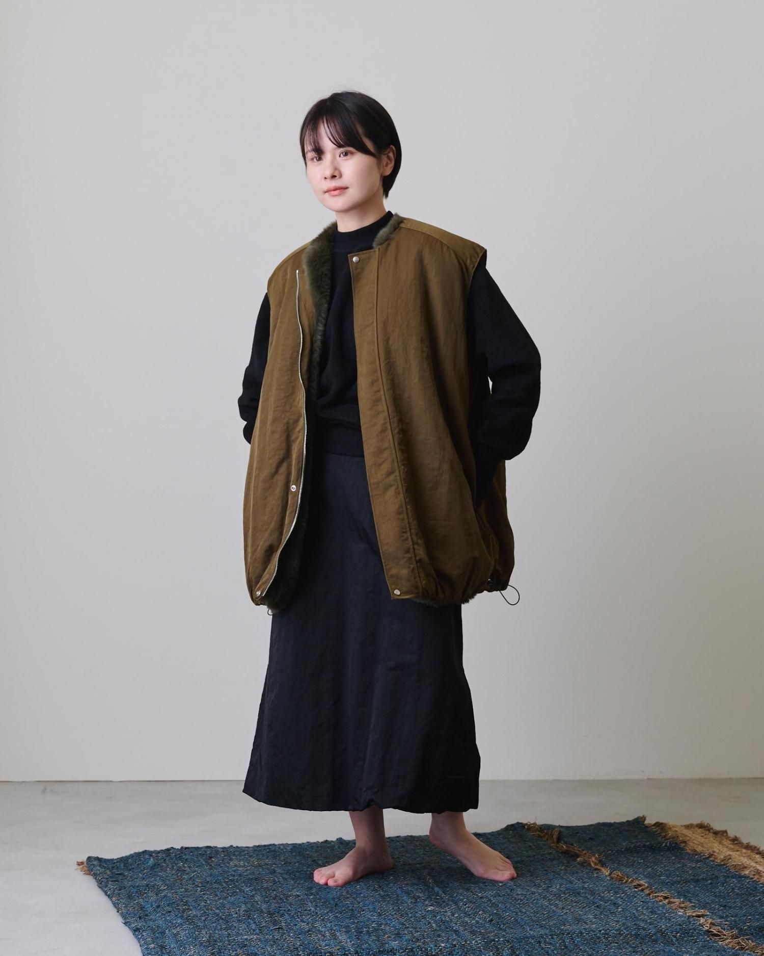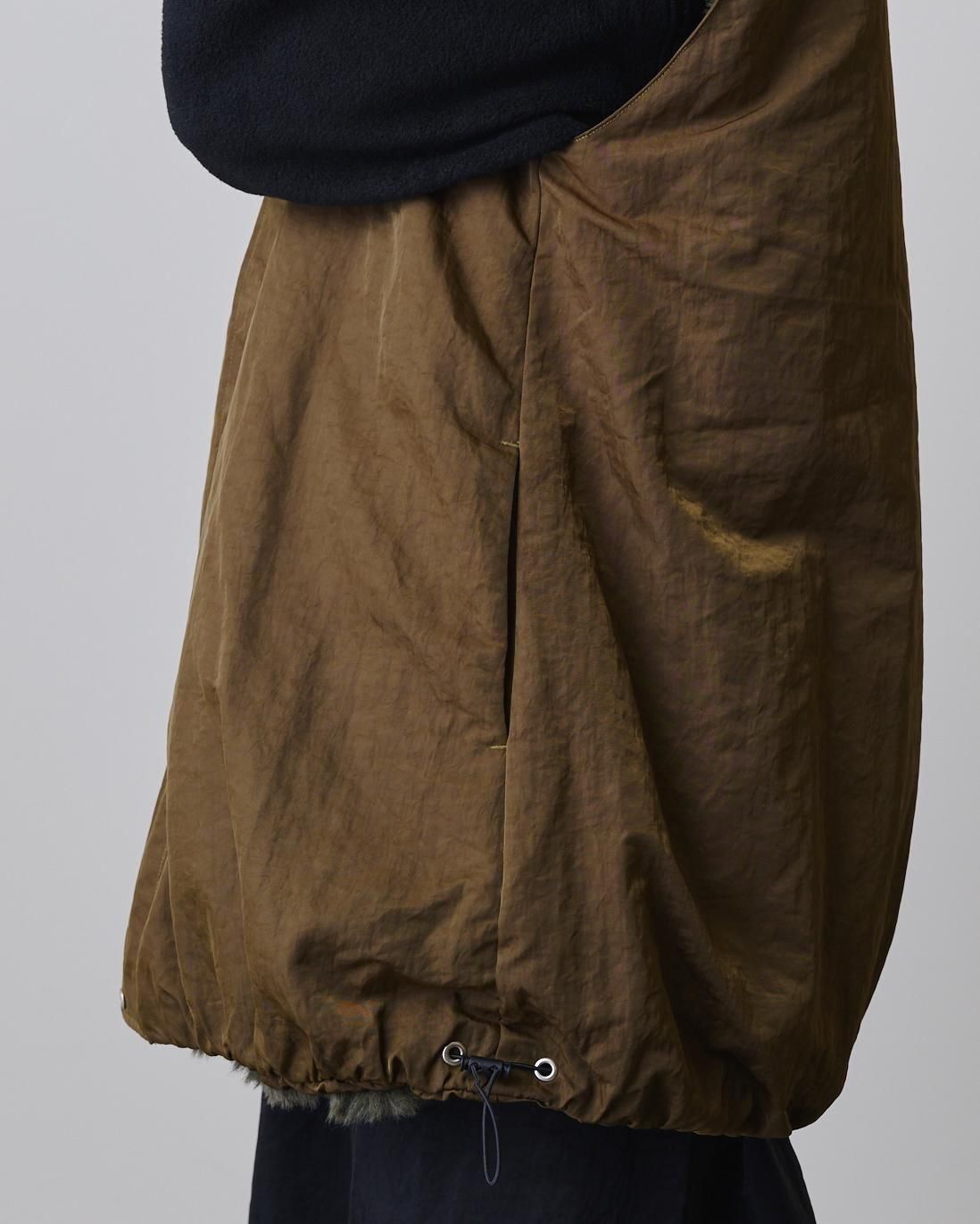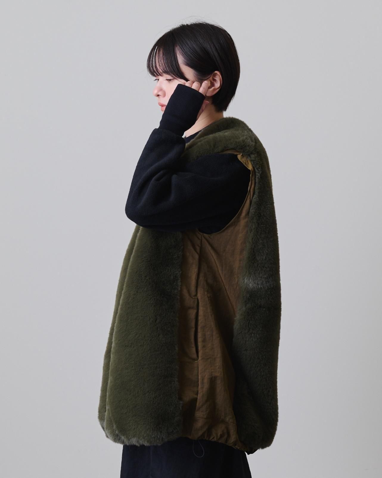 防水性を兼ね備えた耐久性のよいナイロンツイルとボリューミーなECOファーを組み合わせた異素材リバーシブルのスリーブレスジャケットです。