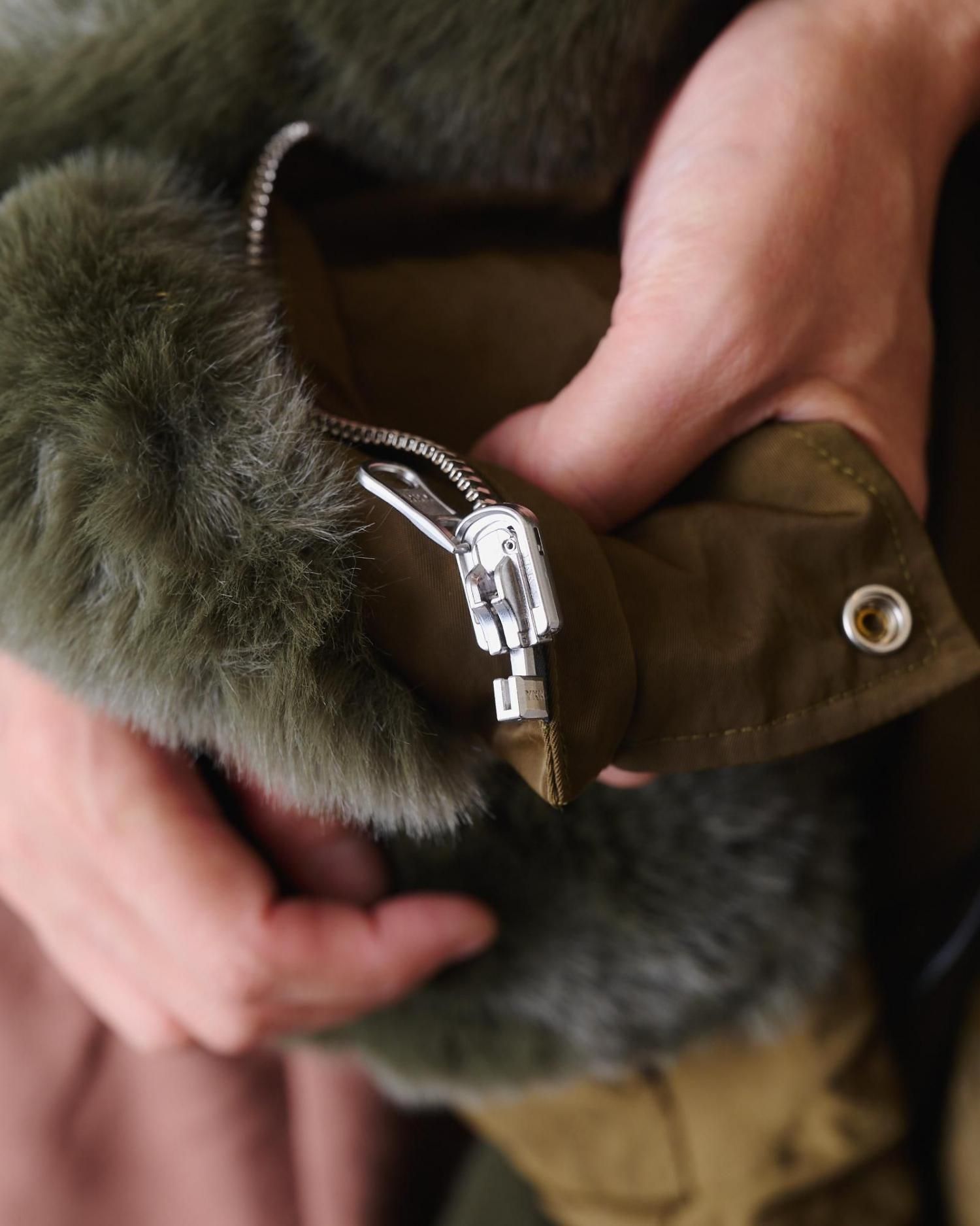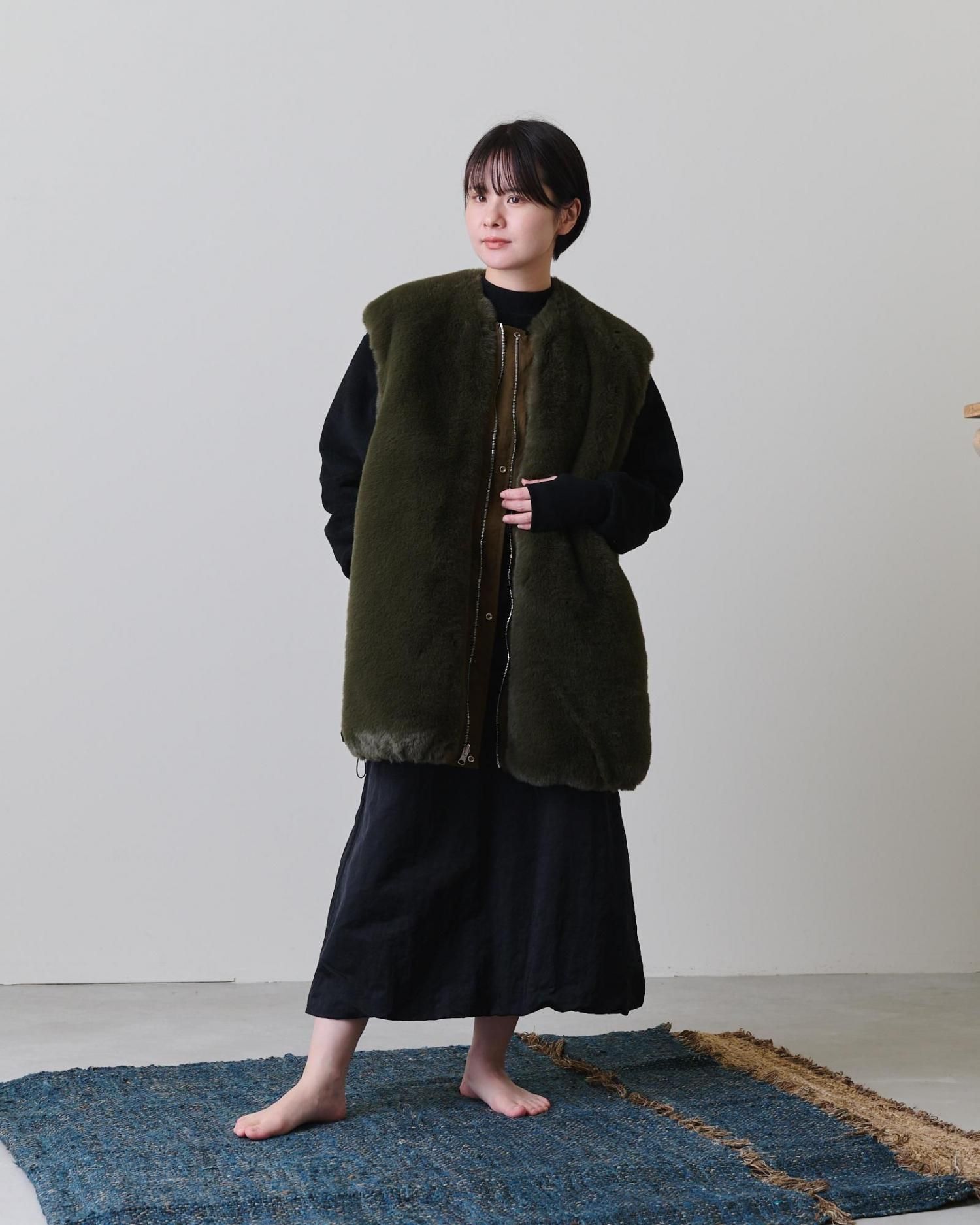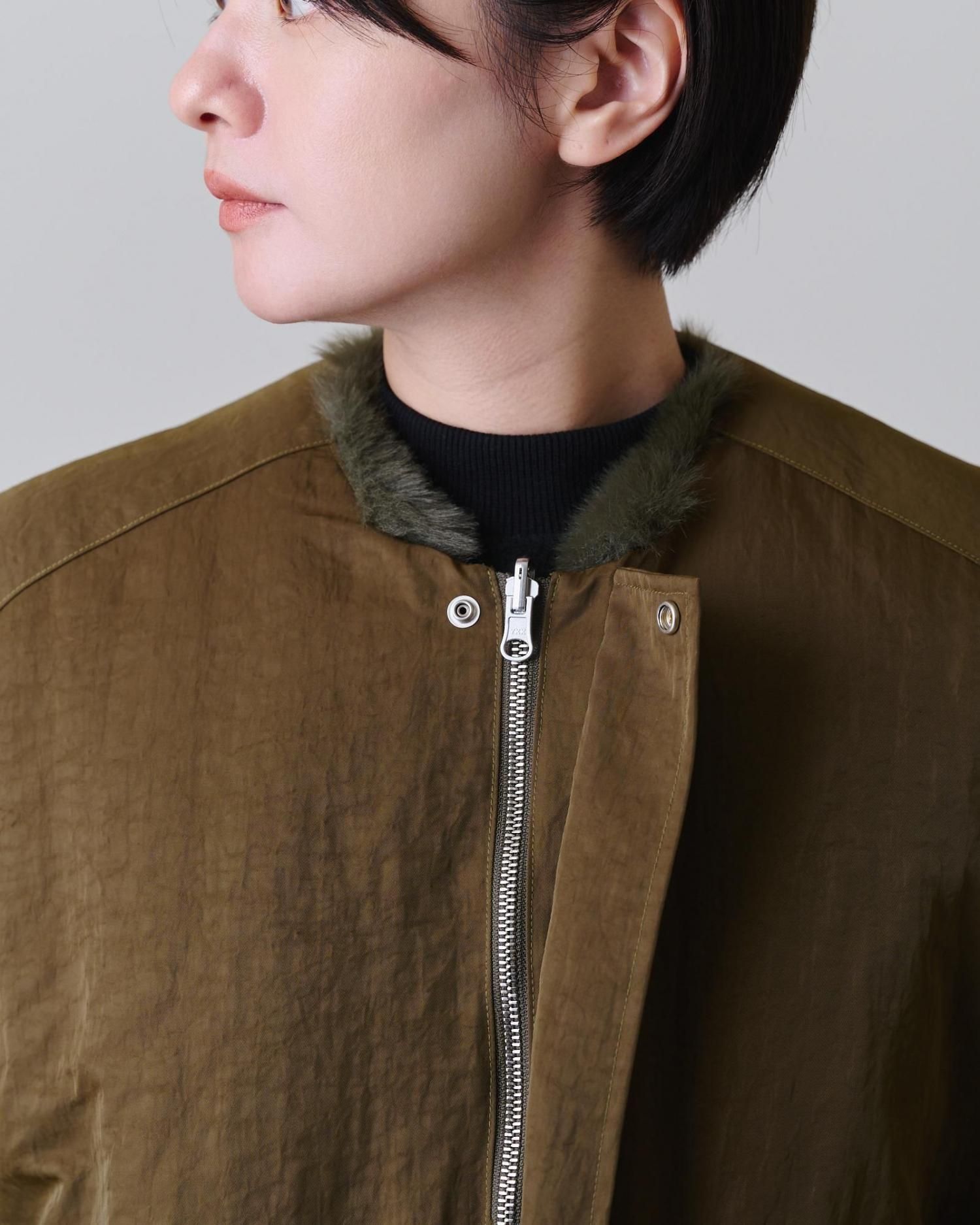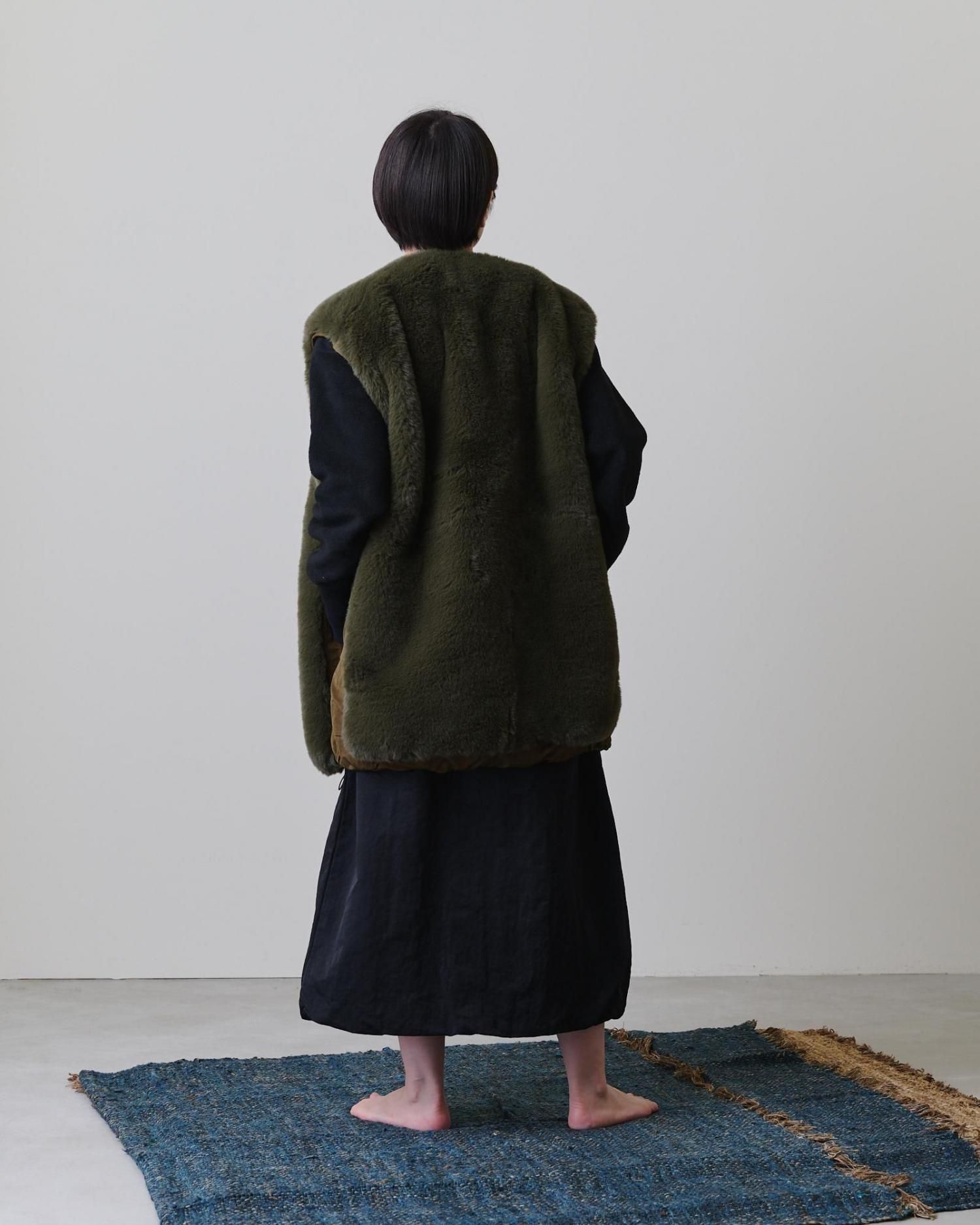 ファーの側は、ファーのカラーをカーキグリーンに、サイドをパネル使いにすることでモードな雰囲気に仕上げています。
