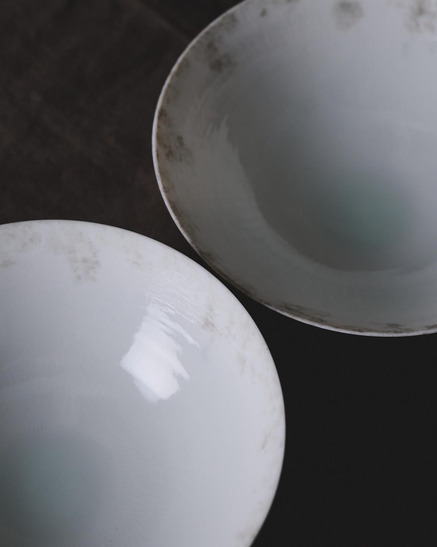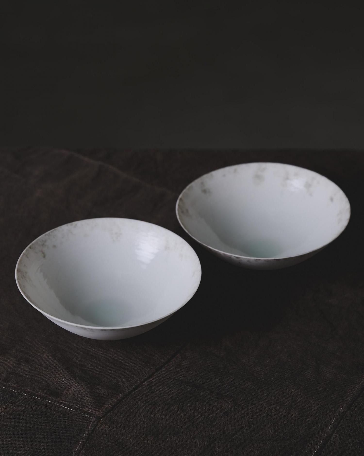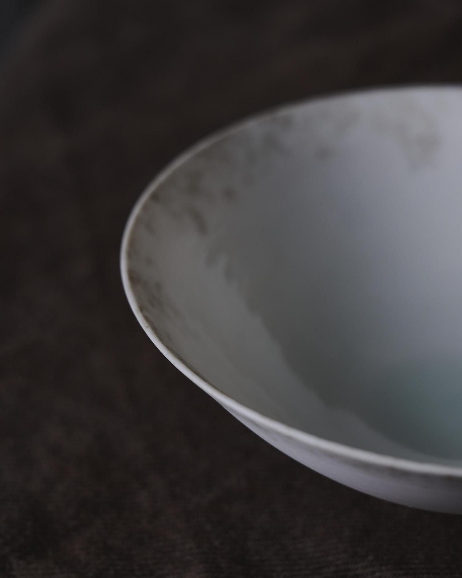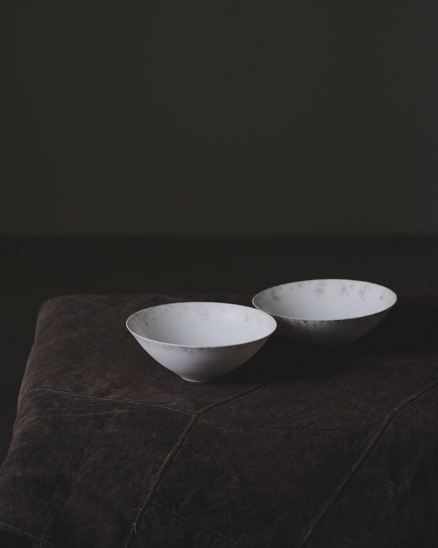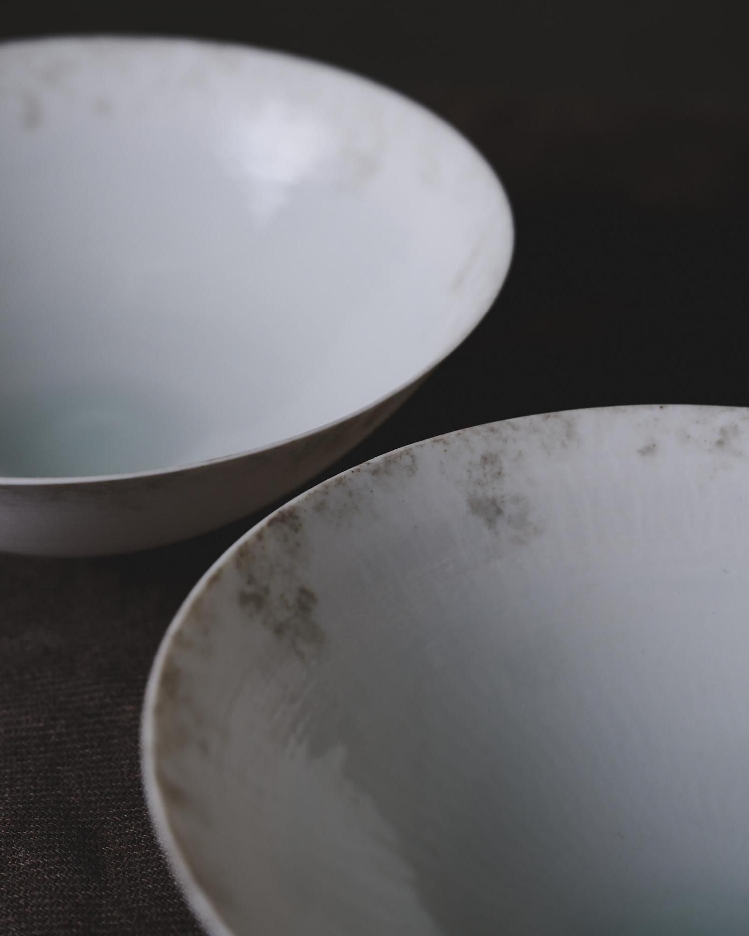 工房から見える雪景色や山形の美しい自然の風景から着想し、意図的な欠けや削り、黒化粧といった意匠を施すことで、繊細な磁器の可能性を引き出しつつ、他ならない儚さと美しさを纏った作品を生み出す。