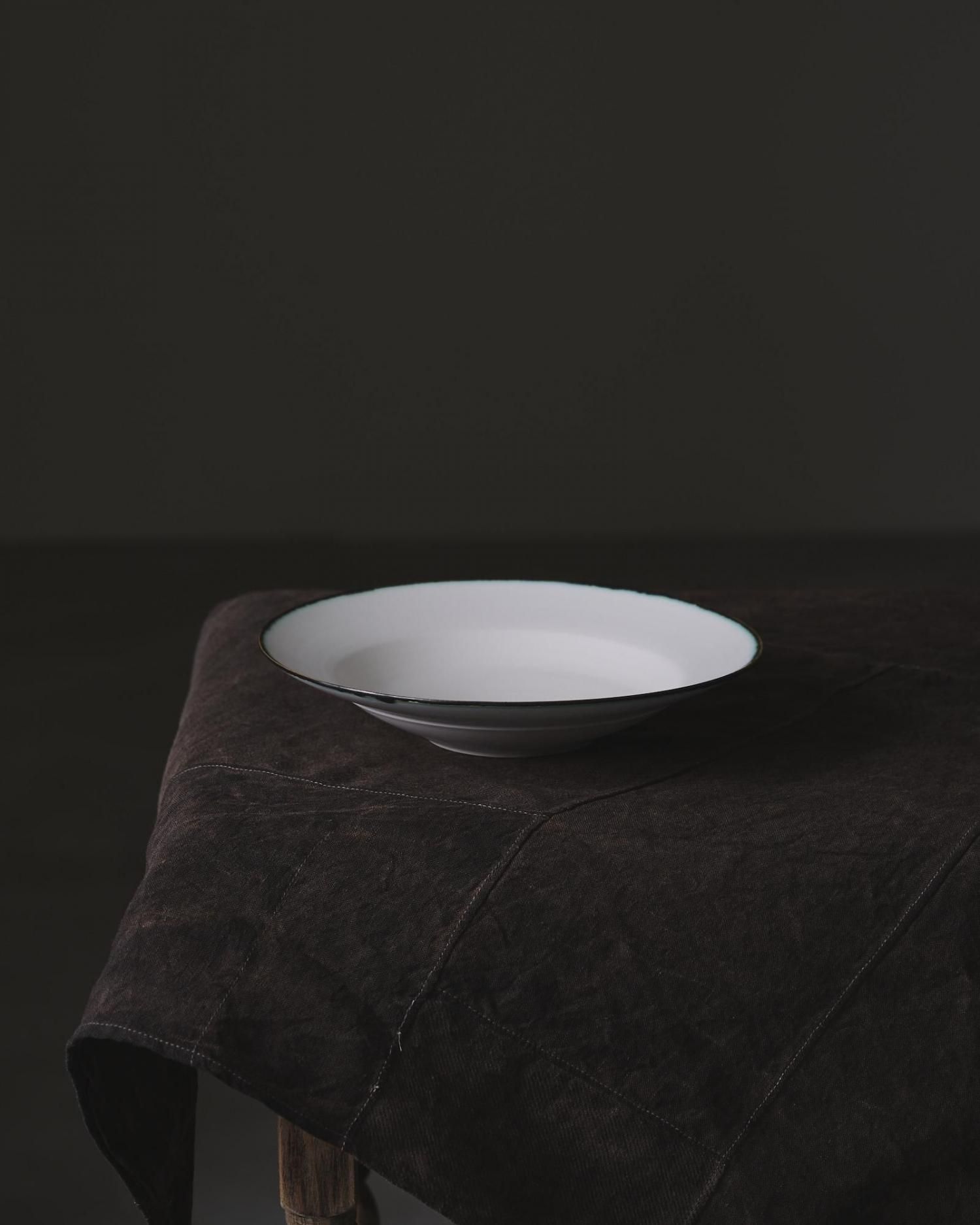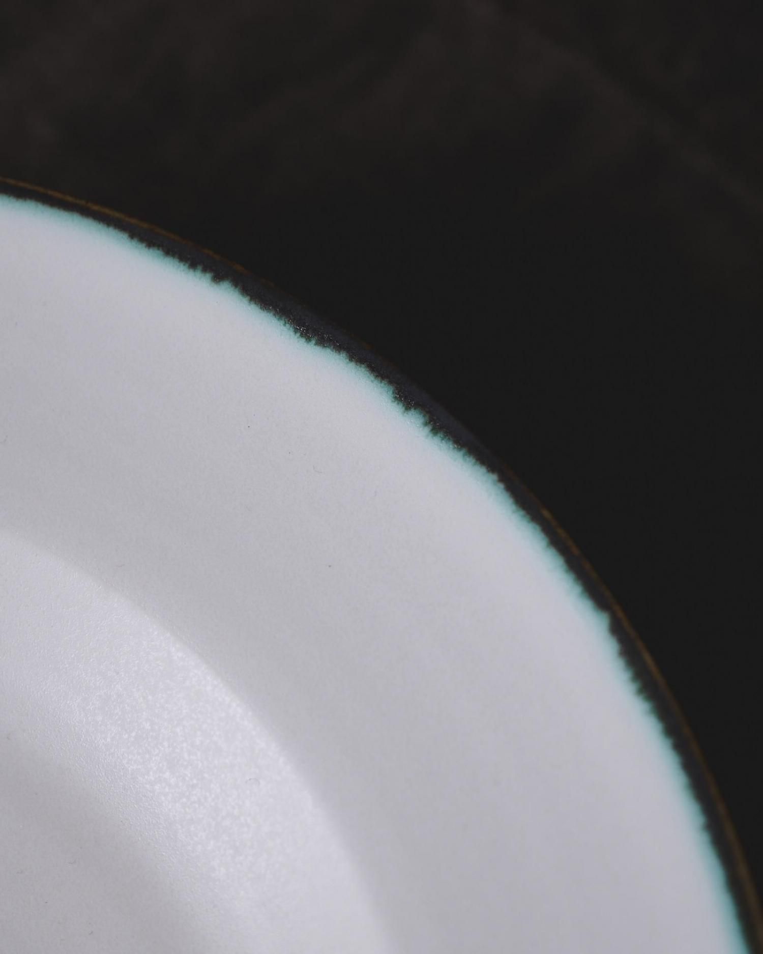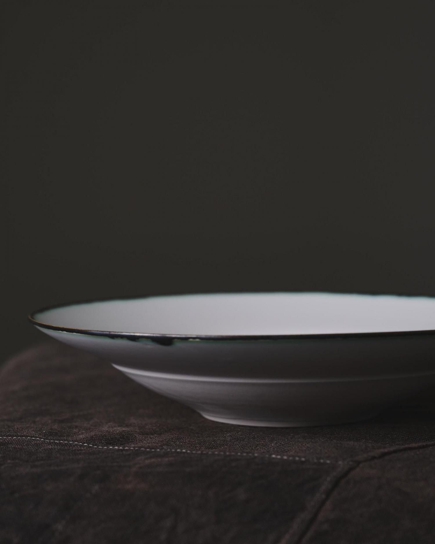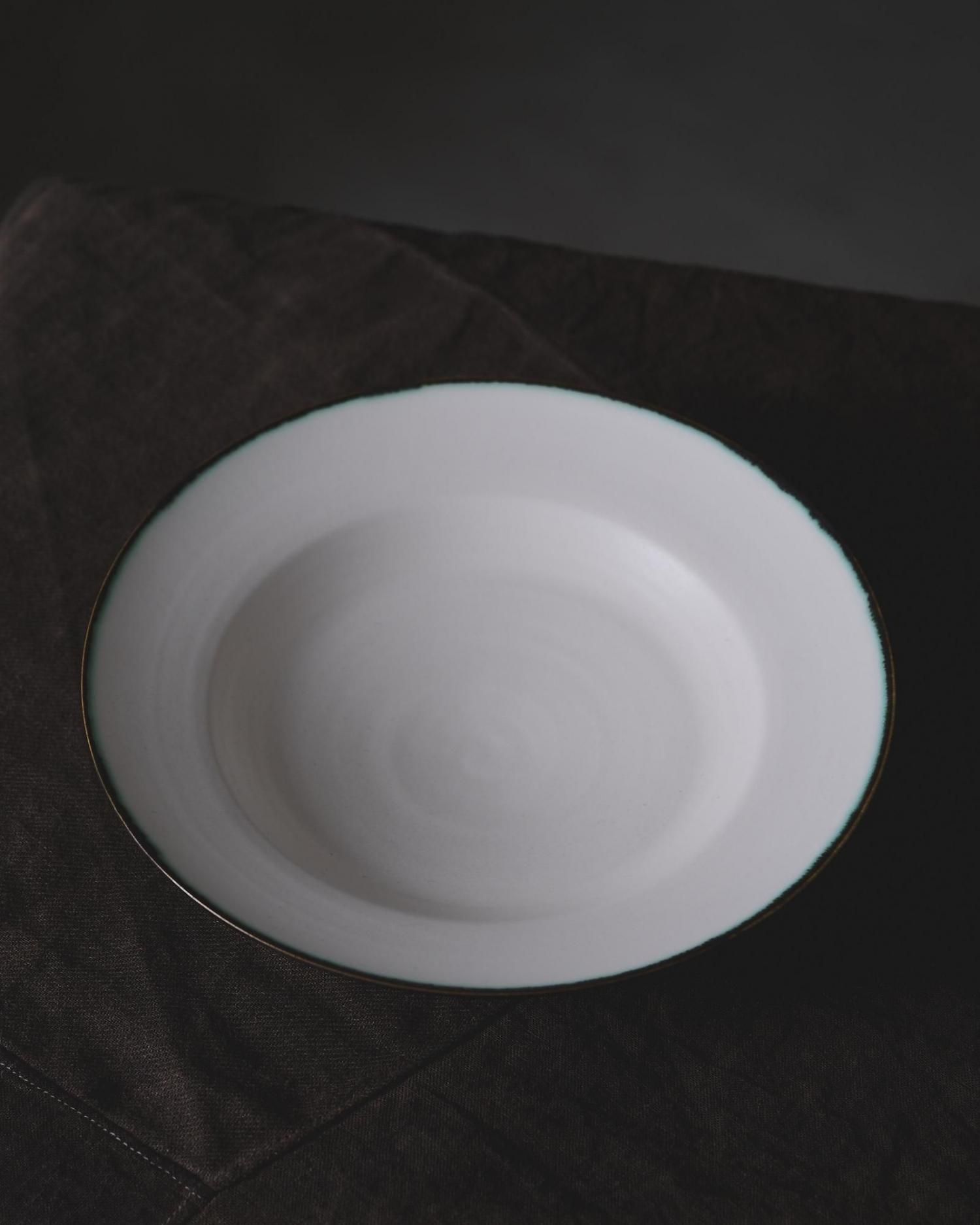 器の縁にうっすらと滲むダークグリーンがアクセントになっています。