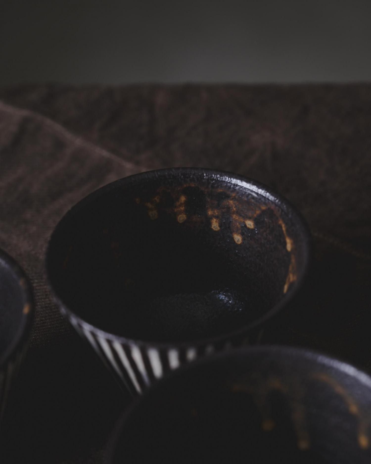 錆のように茶色がかった深みのある黒に貫入の入った白いライン。