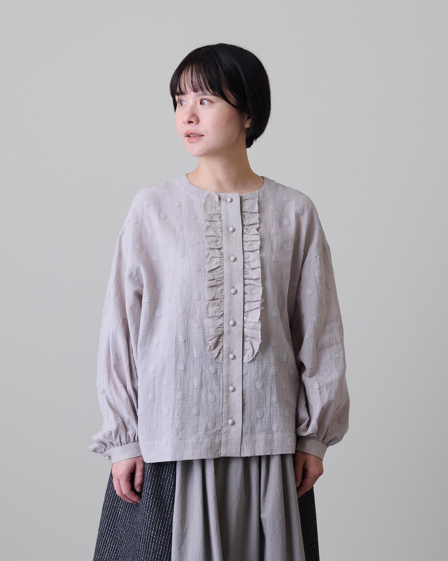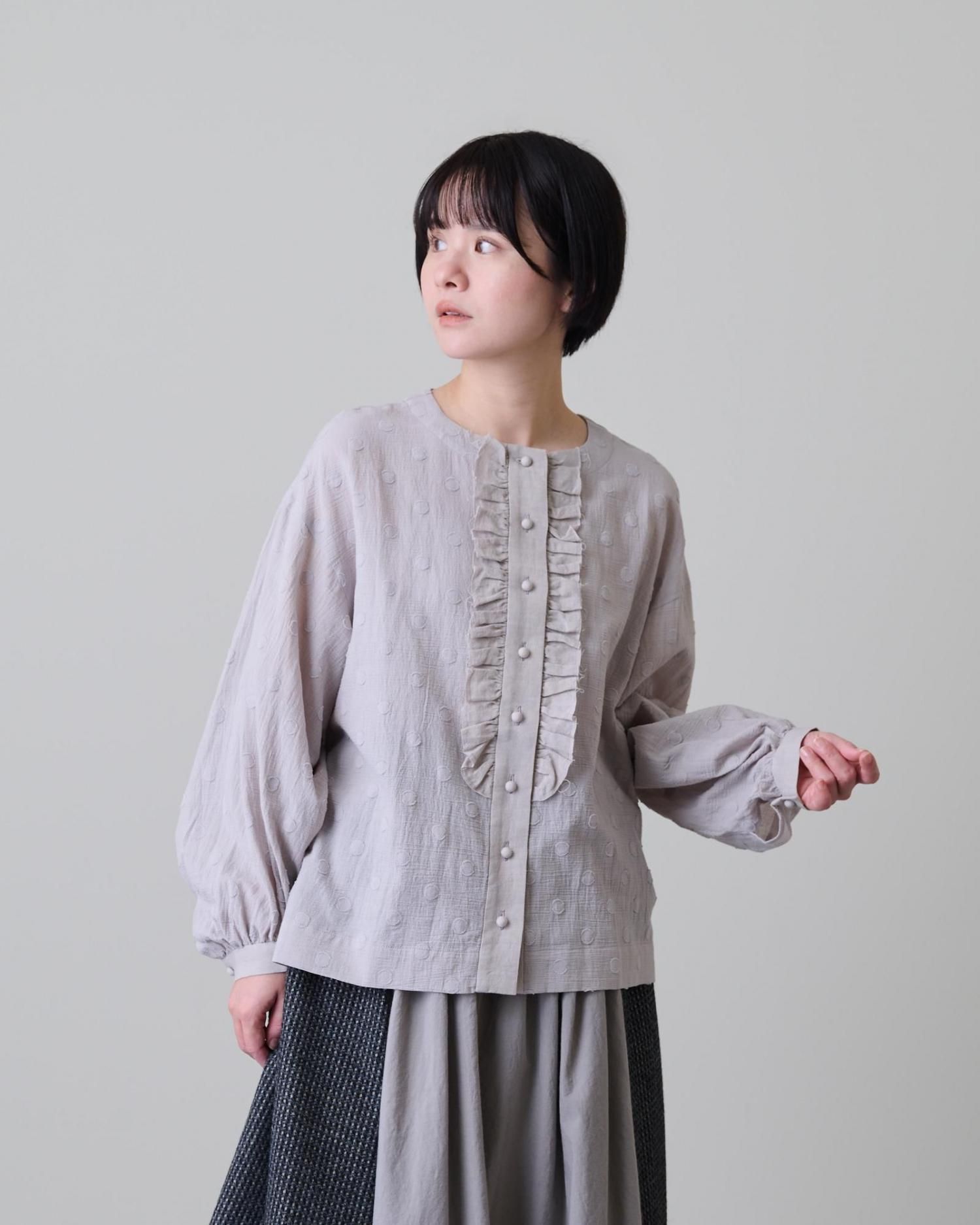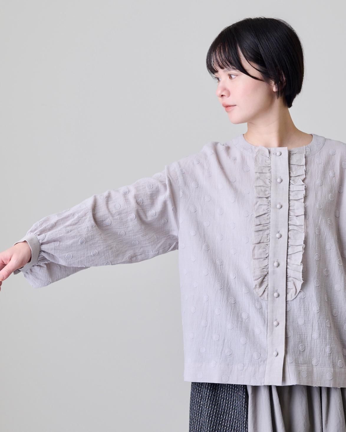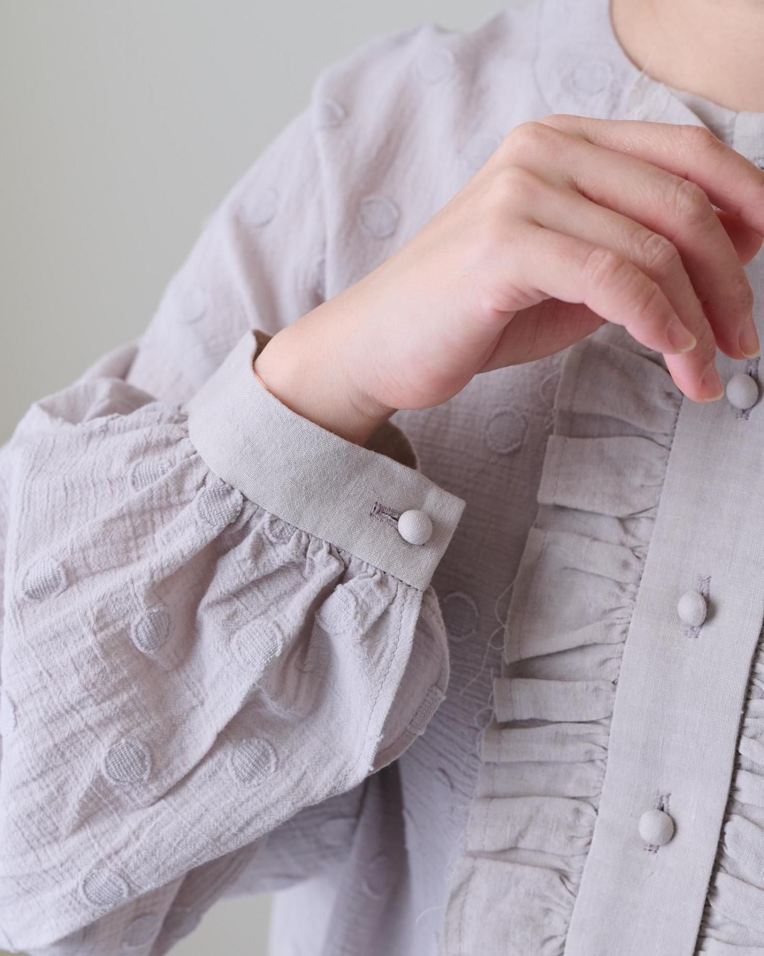 そんな生地で仕立てたのは、前立てにフリルをあしらった上品なブラウス。