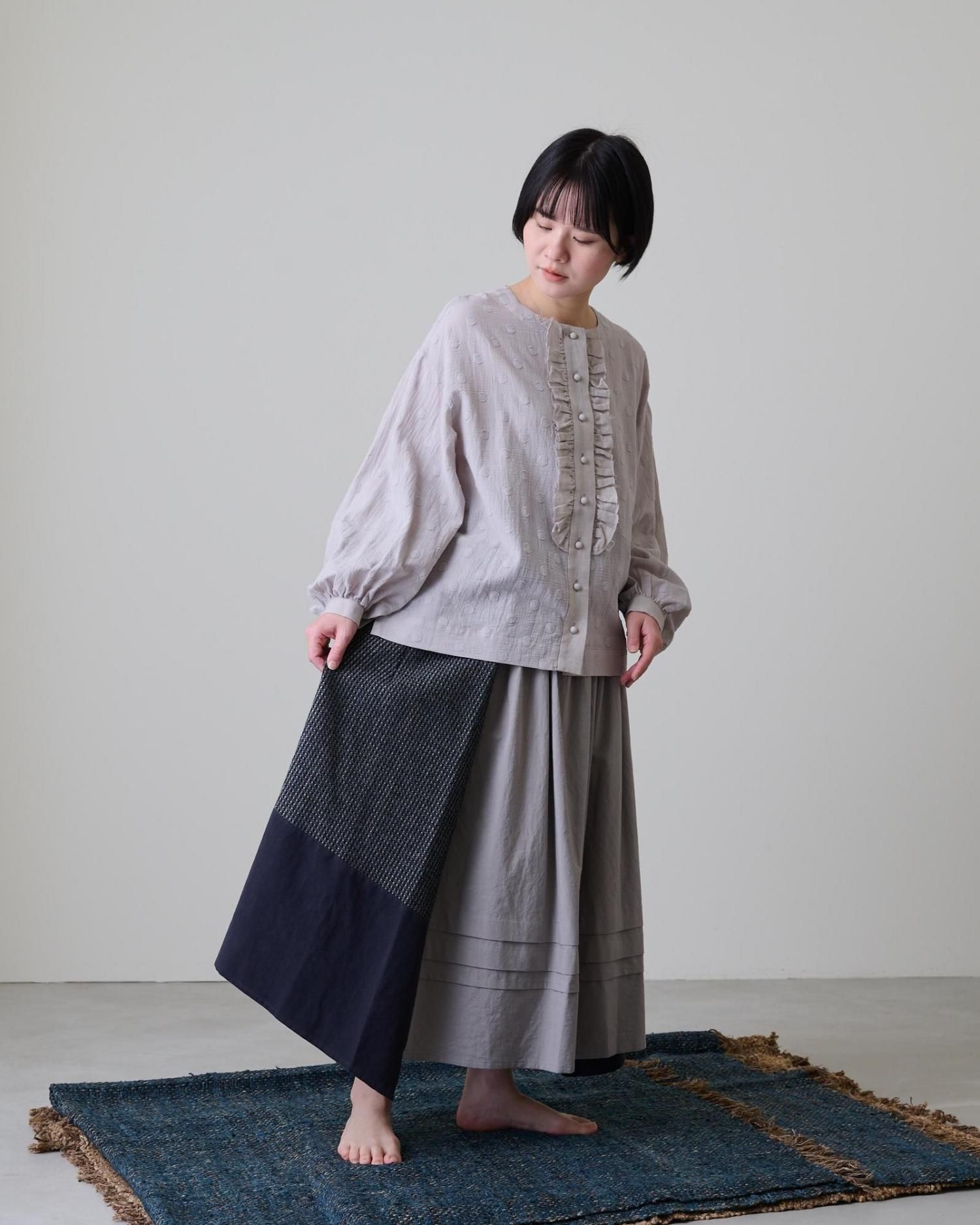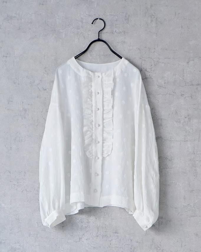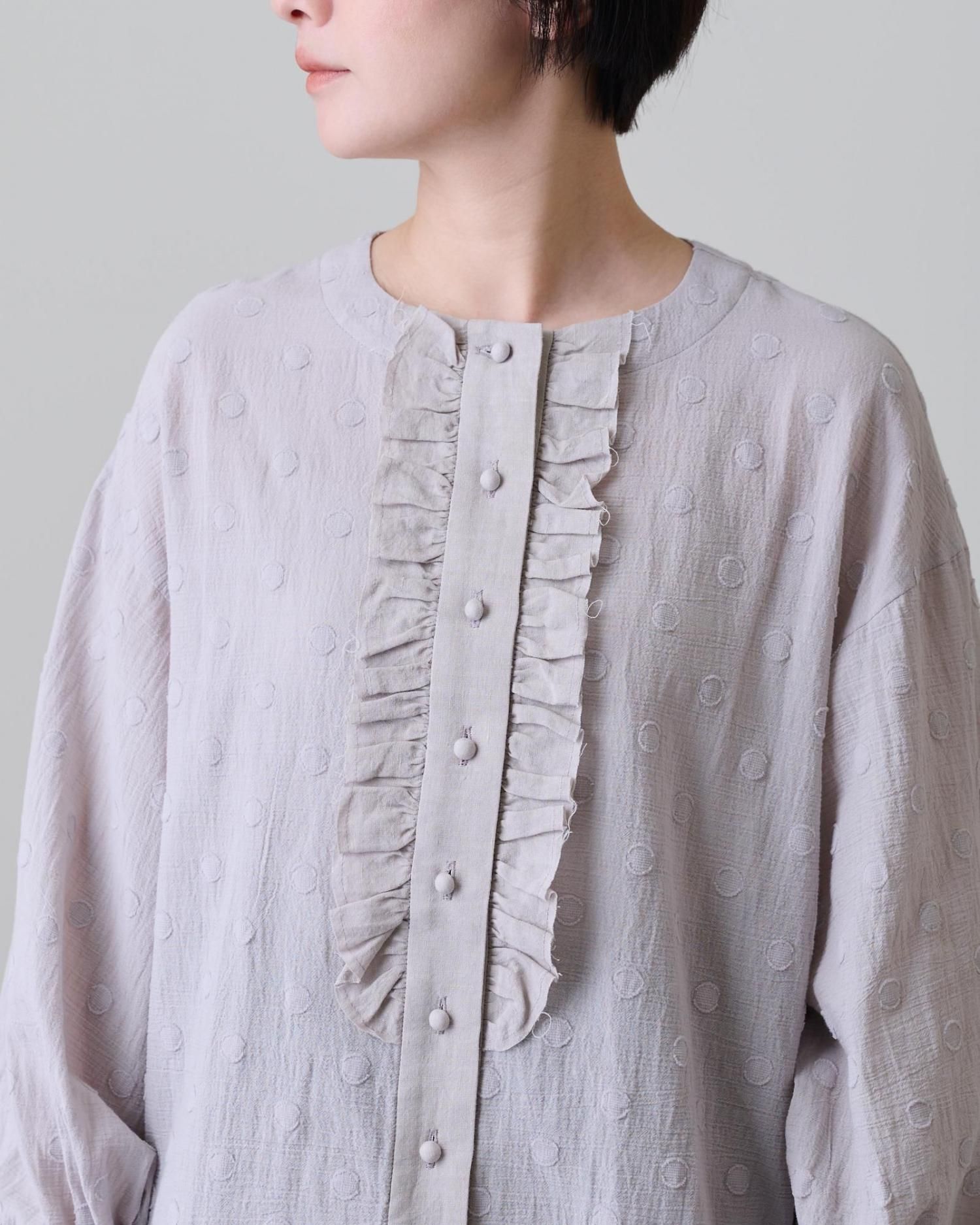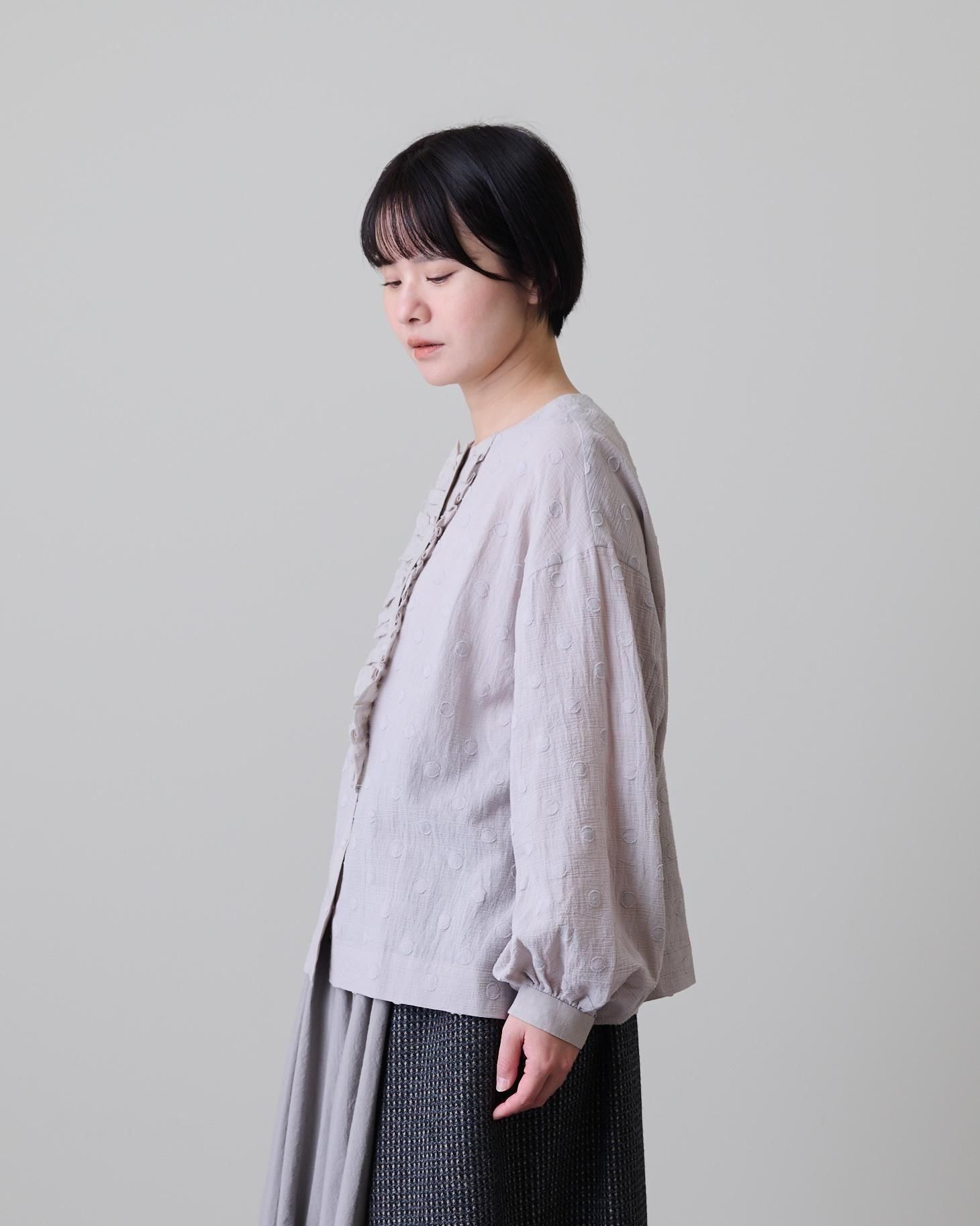 そんな生地で仕立てたのは、前立てにフリルをあしらった上品なブラウス。