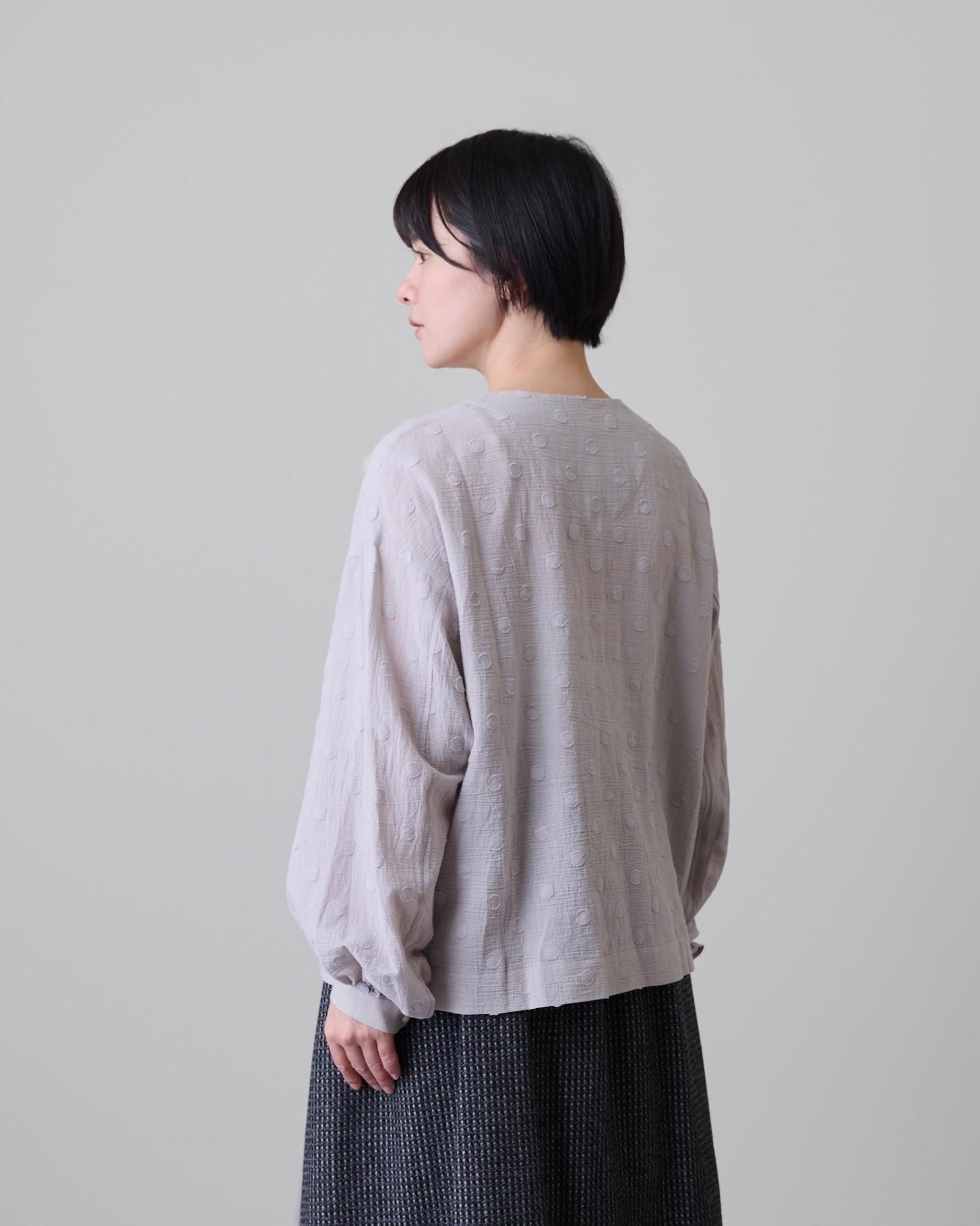 袖口にはたっぷりとギャザーを入れ、優しいバルーンスリーブに仕上げています。