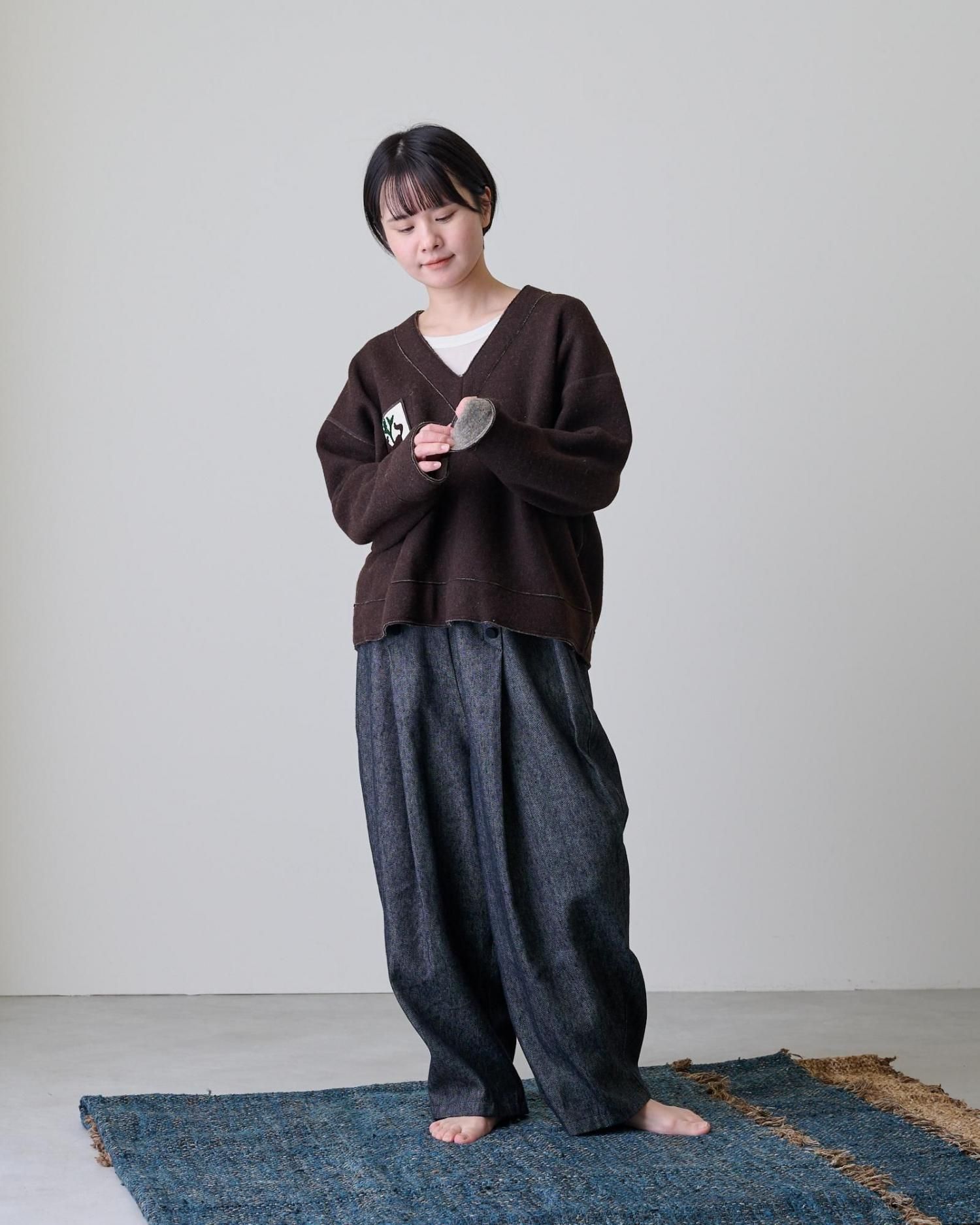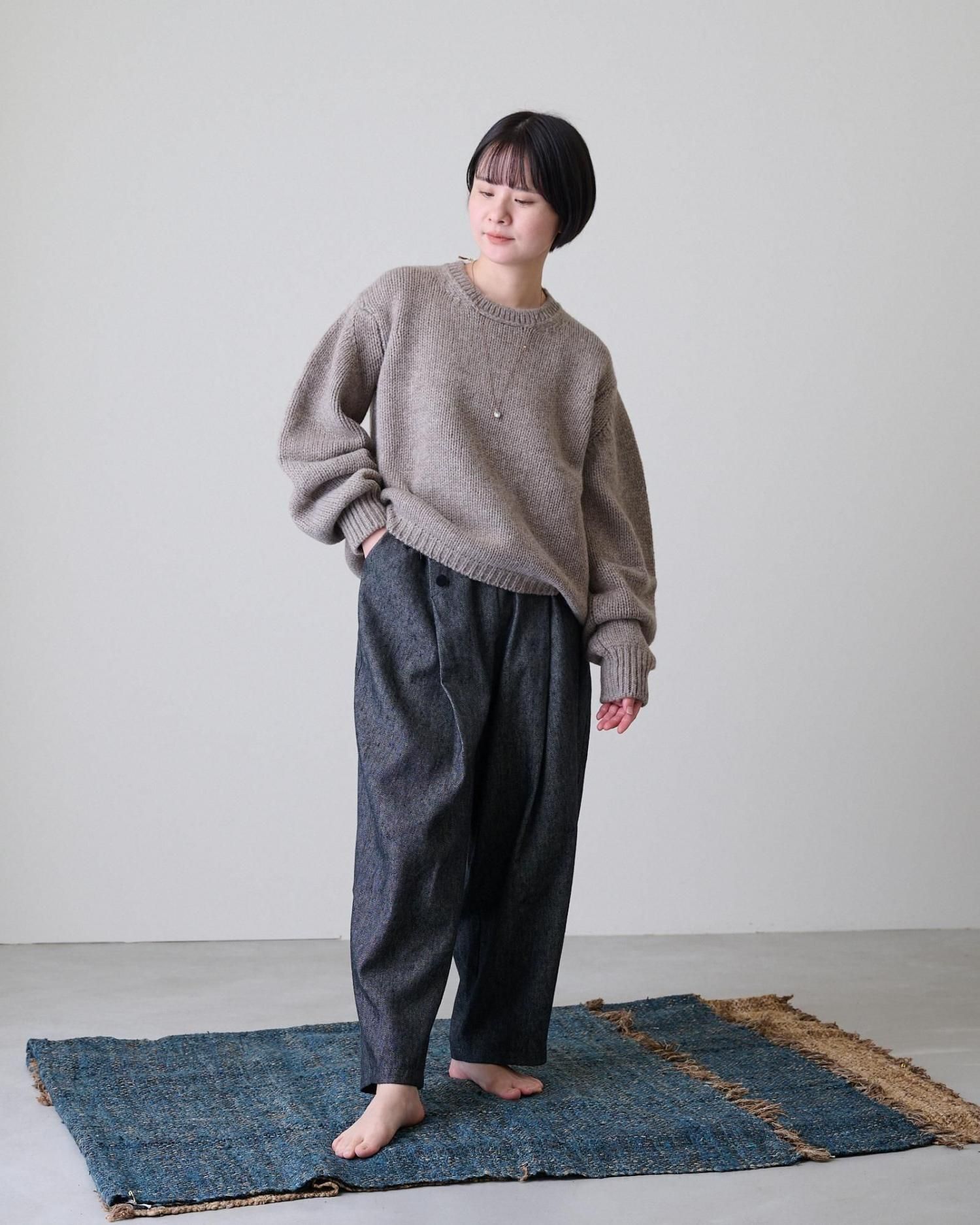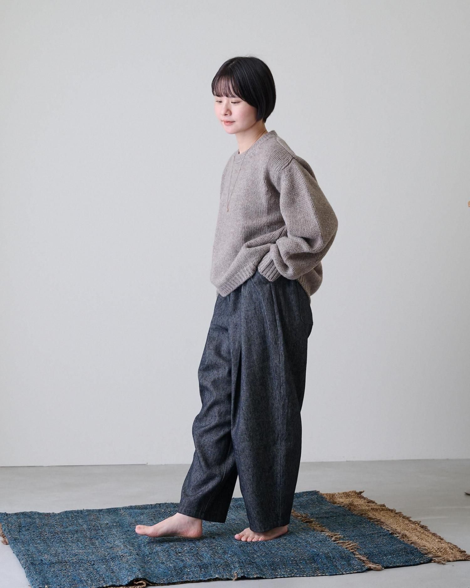 股上が深く、すっぽり身体を包み込んでくれる履き心地のパンツはリラックして着られます。