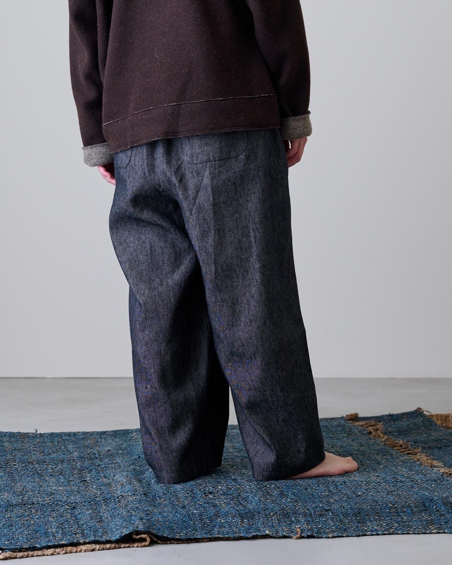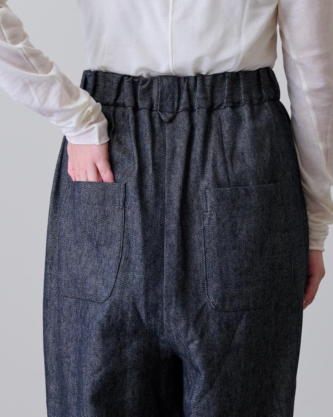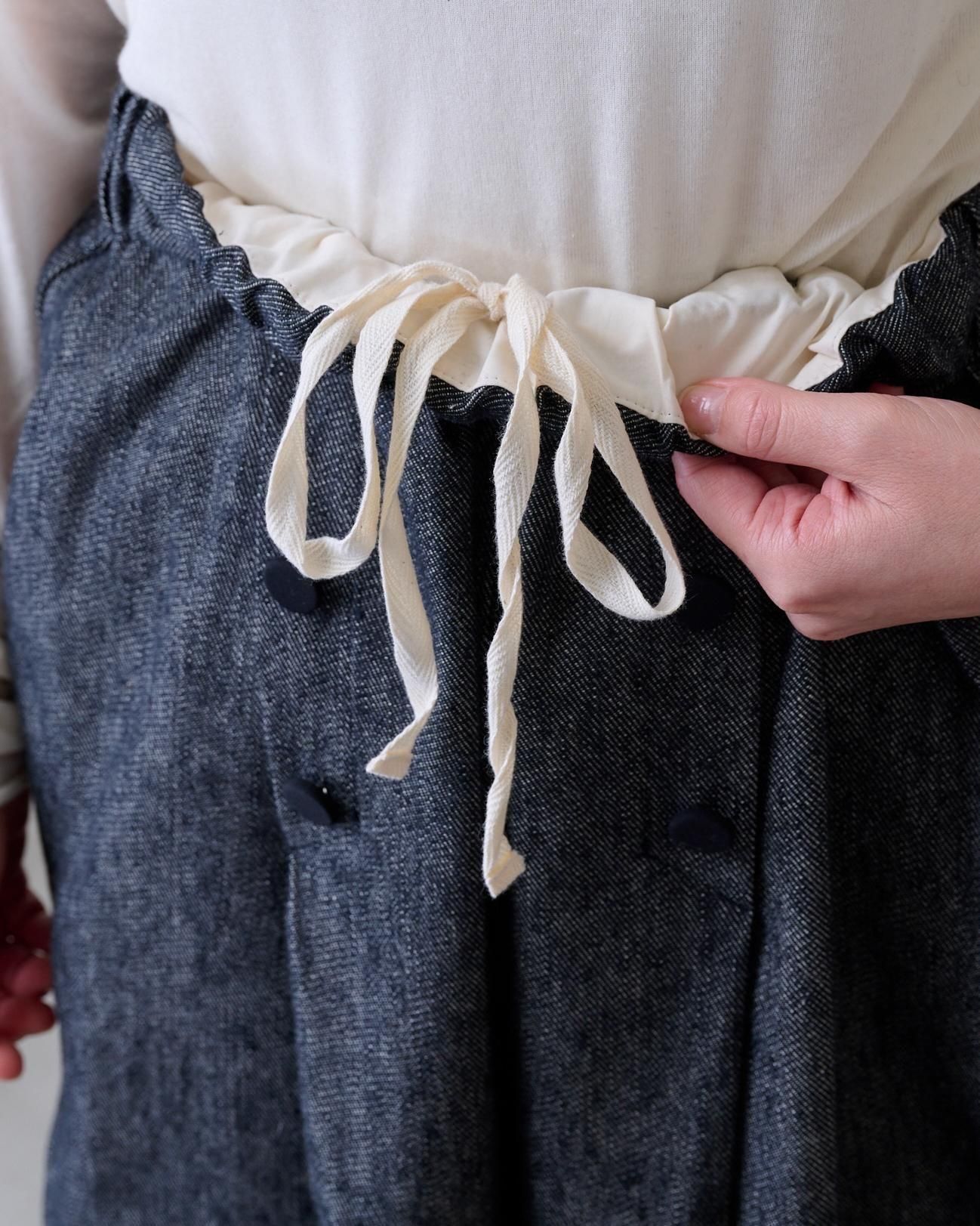 裏地がなくても透けない肉厚の生地は、縦糸にリネン、緯糸にコットンを用いて織り上げた風合い豊かなコットンリネンのデニム生地。