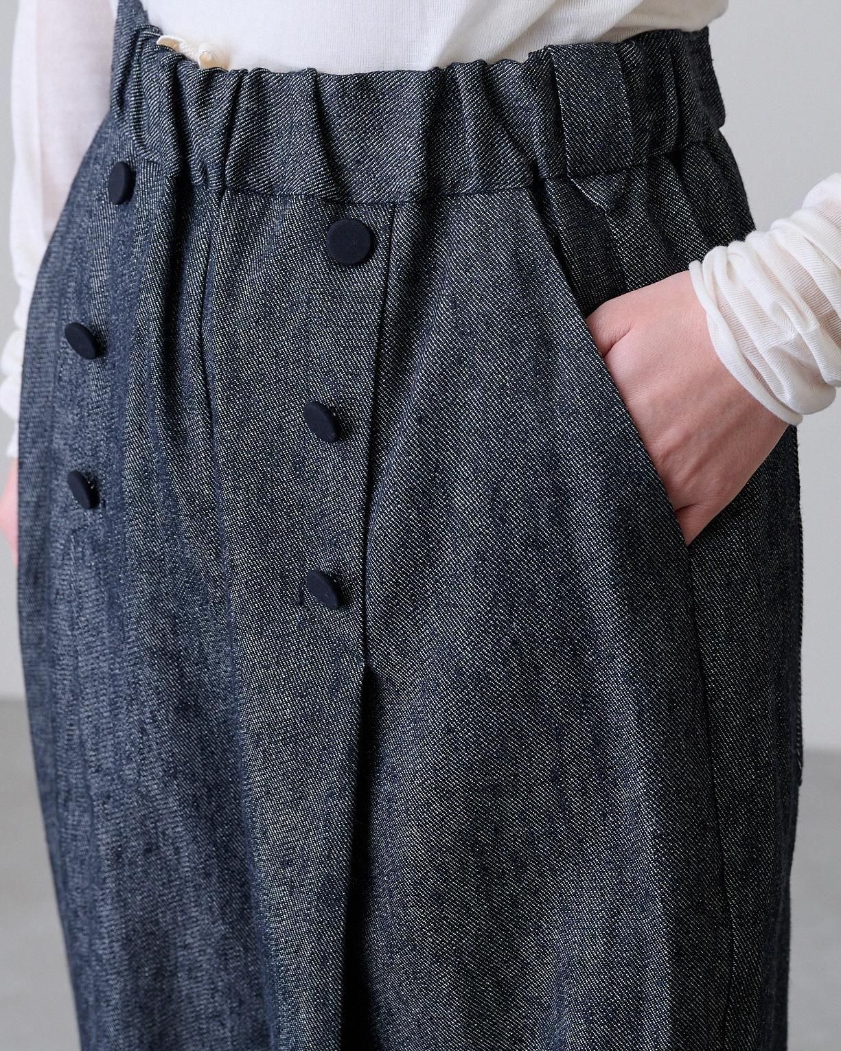 左右3個ずつのくるみボタンをあしらい、セーラーパンツのように仕上げたパンツ。