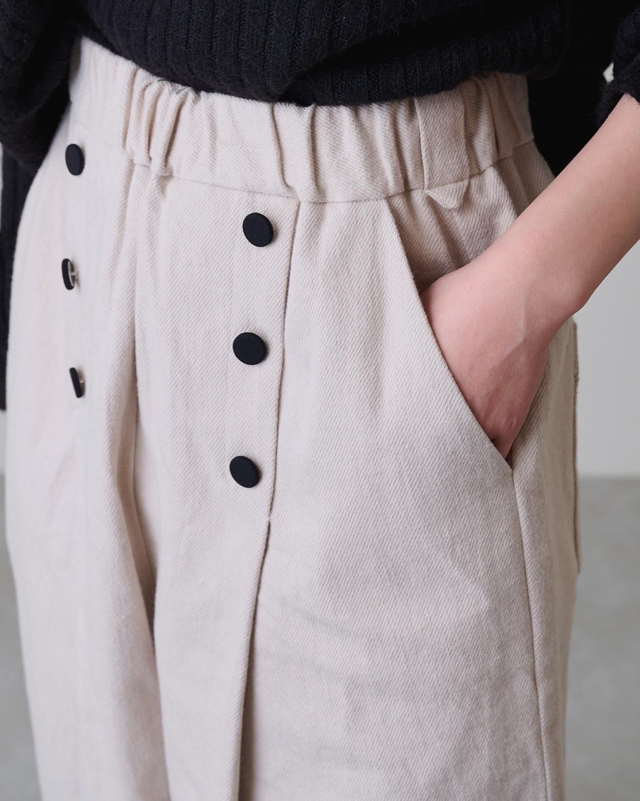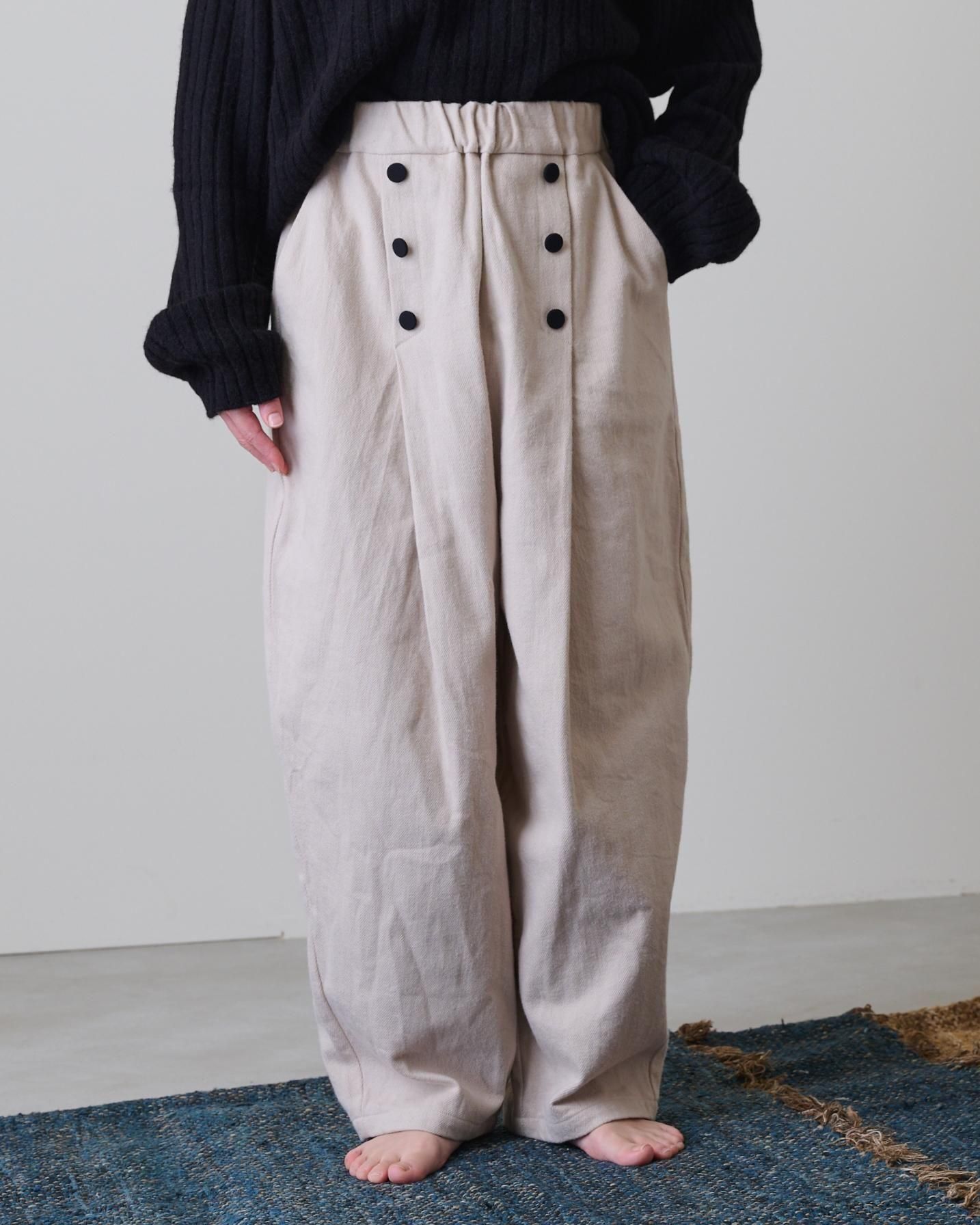 左右3個ずつのくるみボタンをあしらい、セーラーパンツのように仕上げたパンツ。