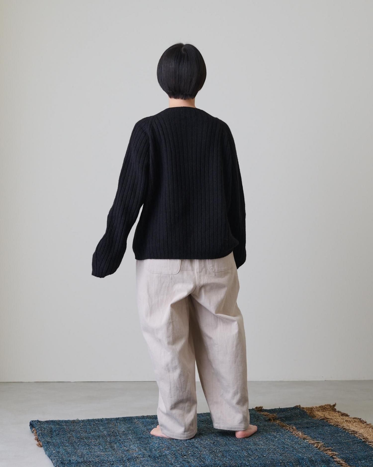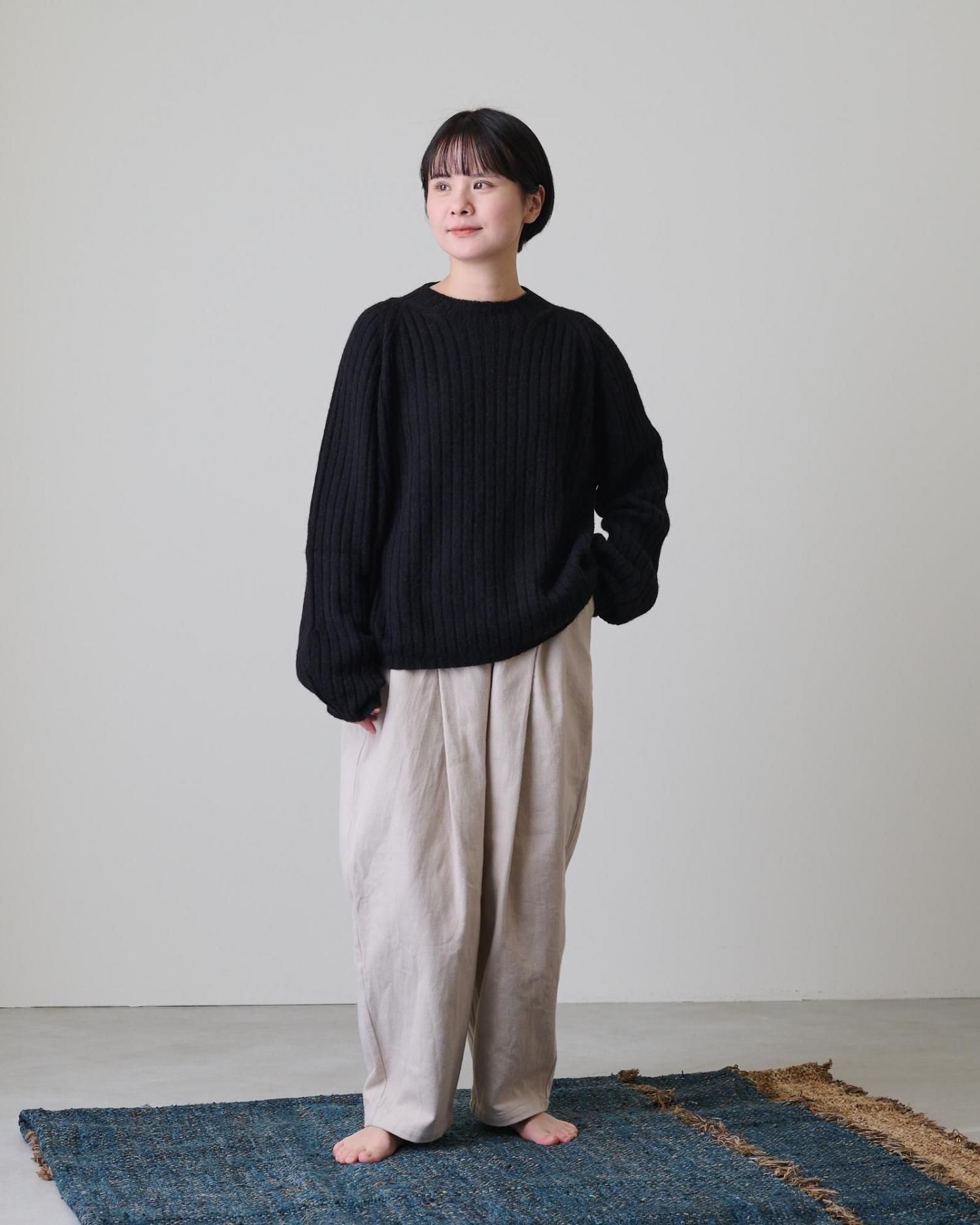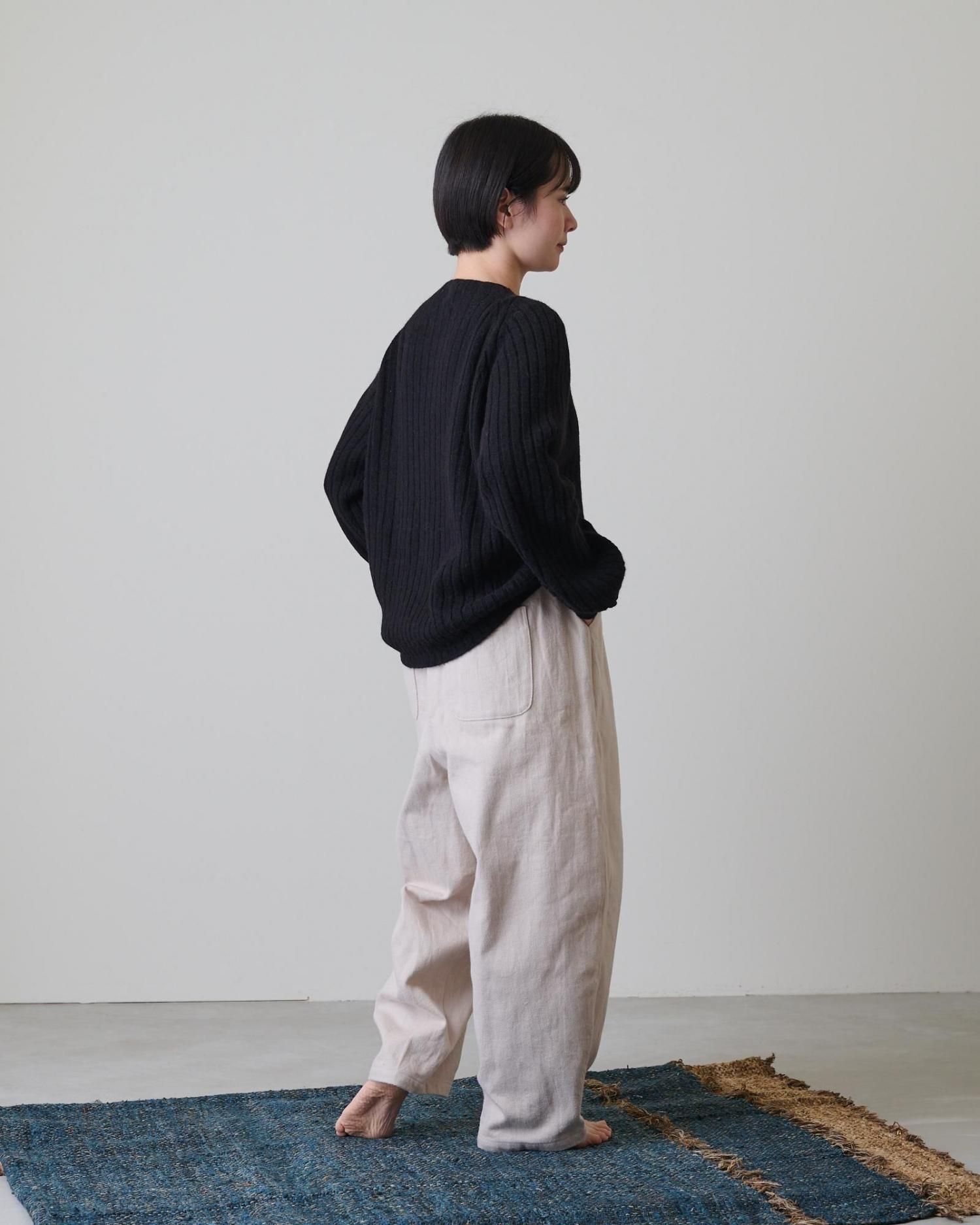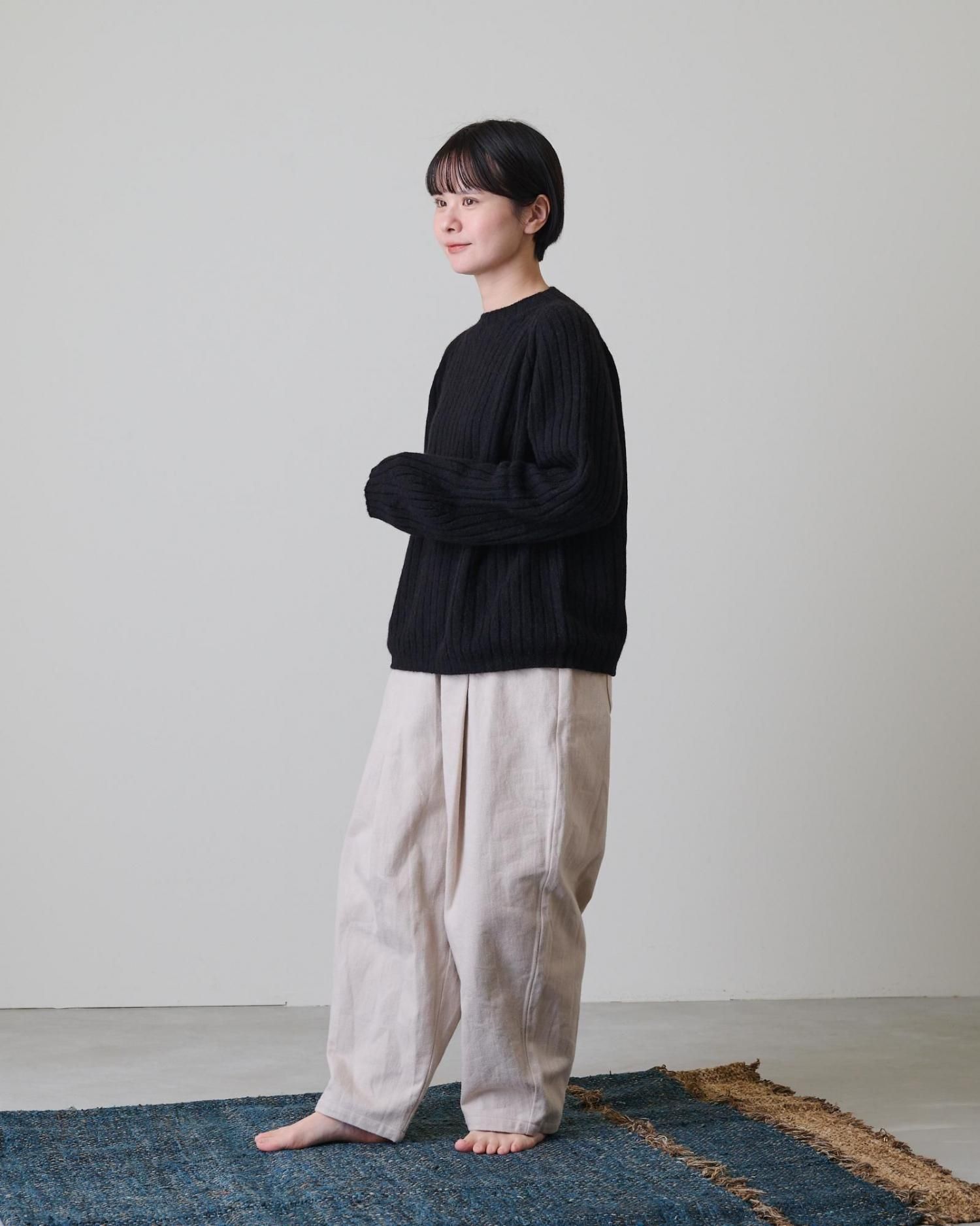 股上が深く、すっぽり身体を包み込んでくれる履き心地のパンツはリラックして着られます。