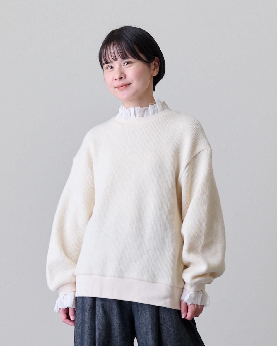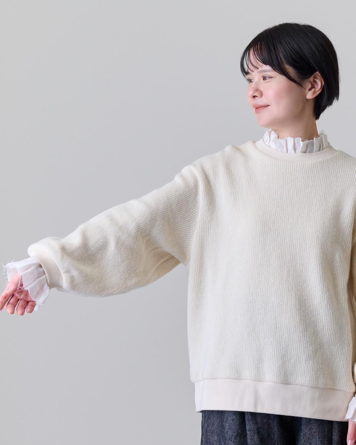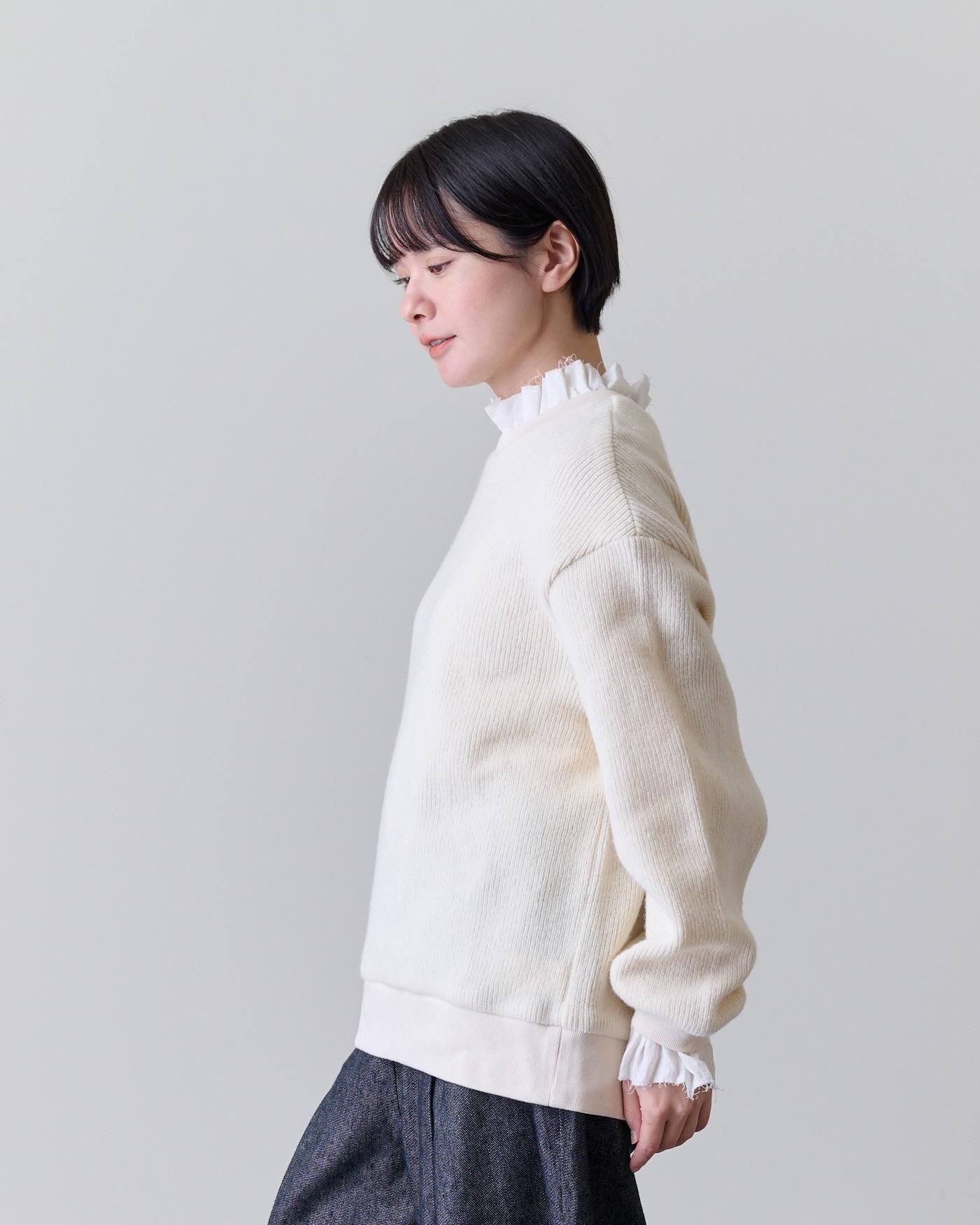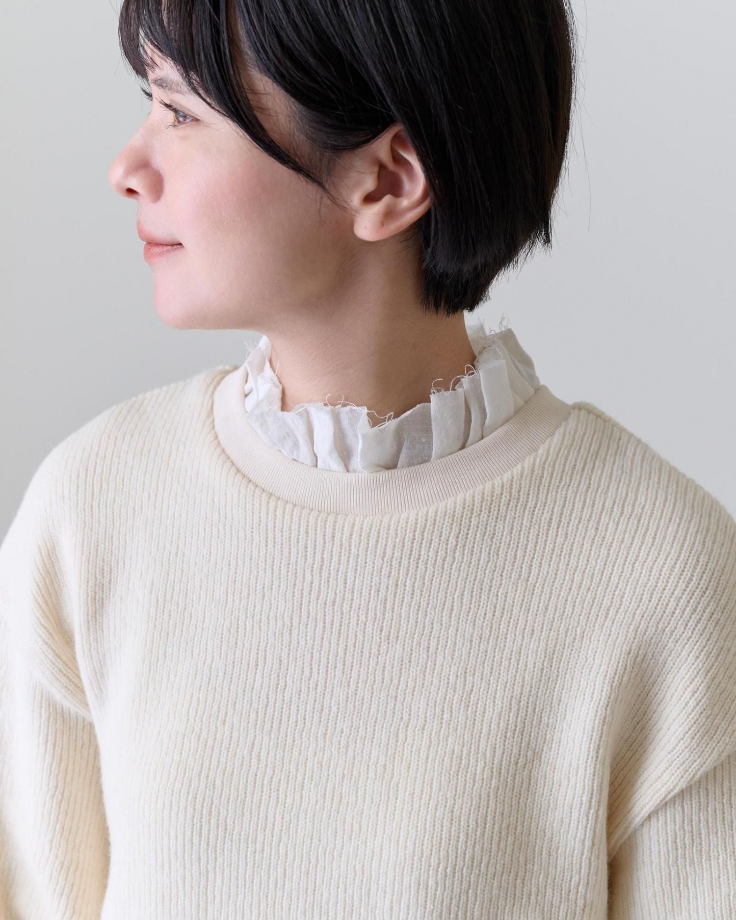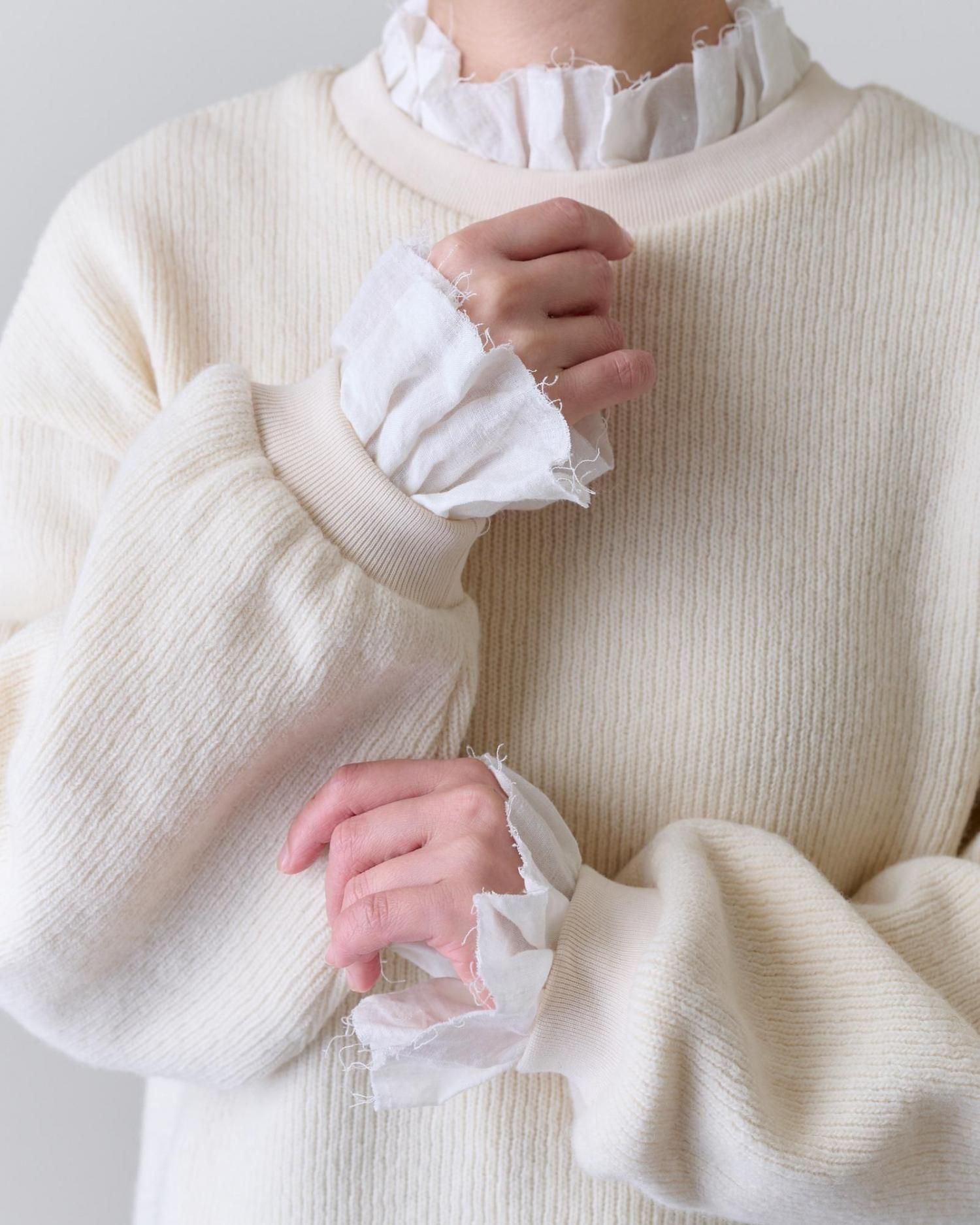 首元と袖口にリネン地のフリルを付けたニットプルオーバーです。